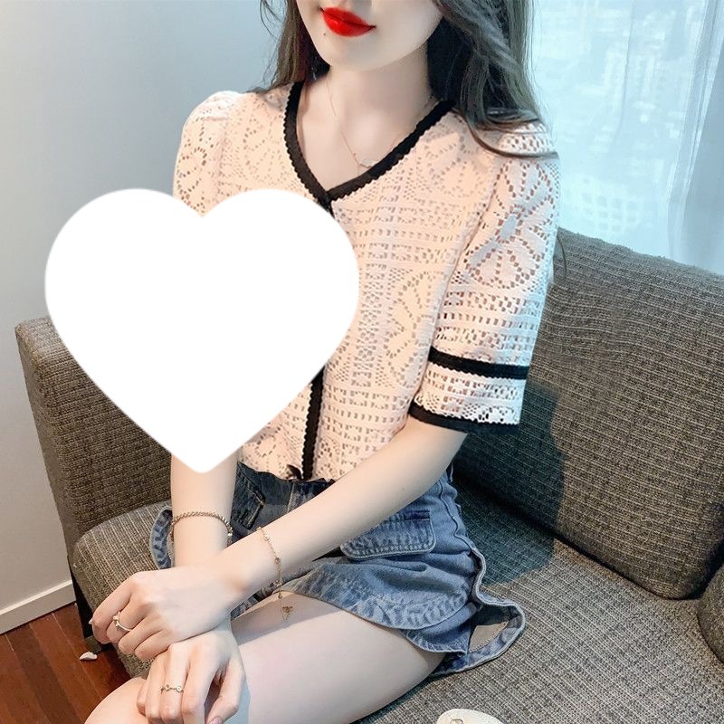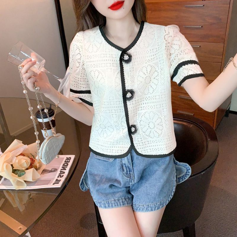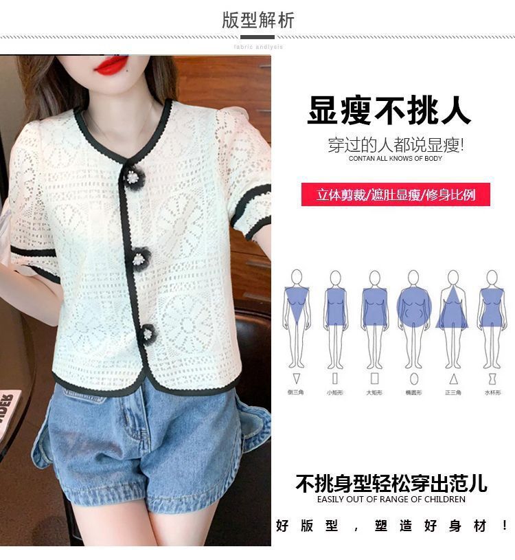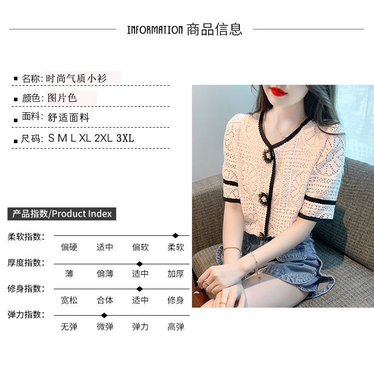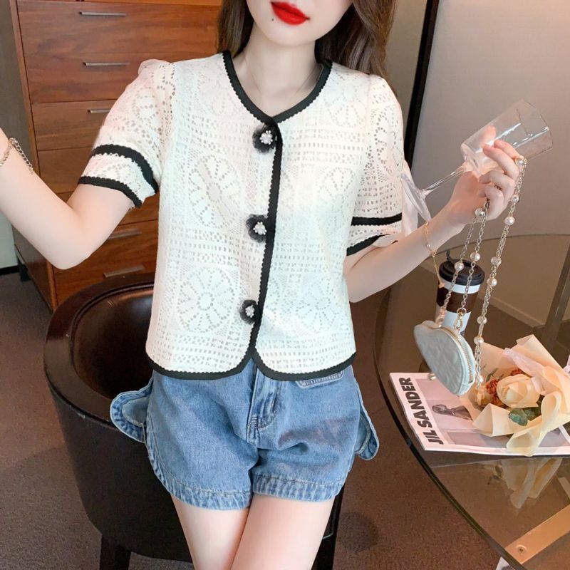 여성을위한 세련된 v 넥 카디건 반팔 쉬폰 셔츠 여름 2024 새로운 여름 디자인 크로 셰 뜨개질 중공 연령 감소 셔츠스토어 가기
