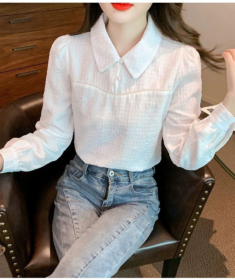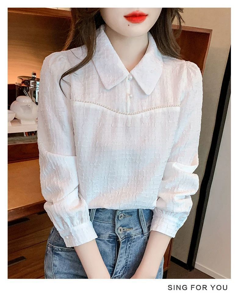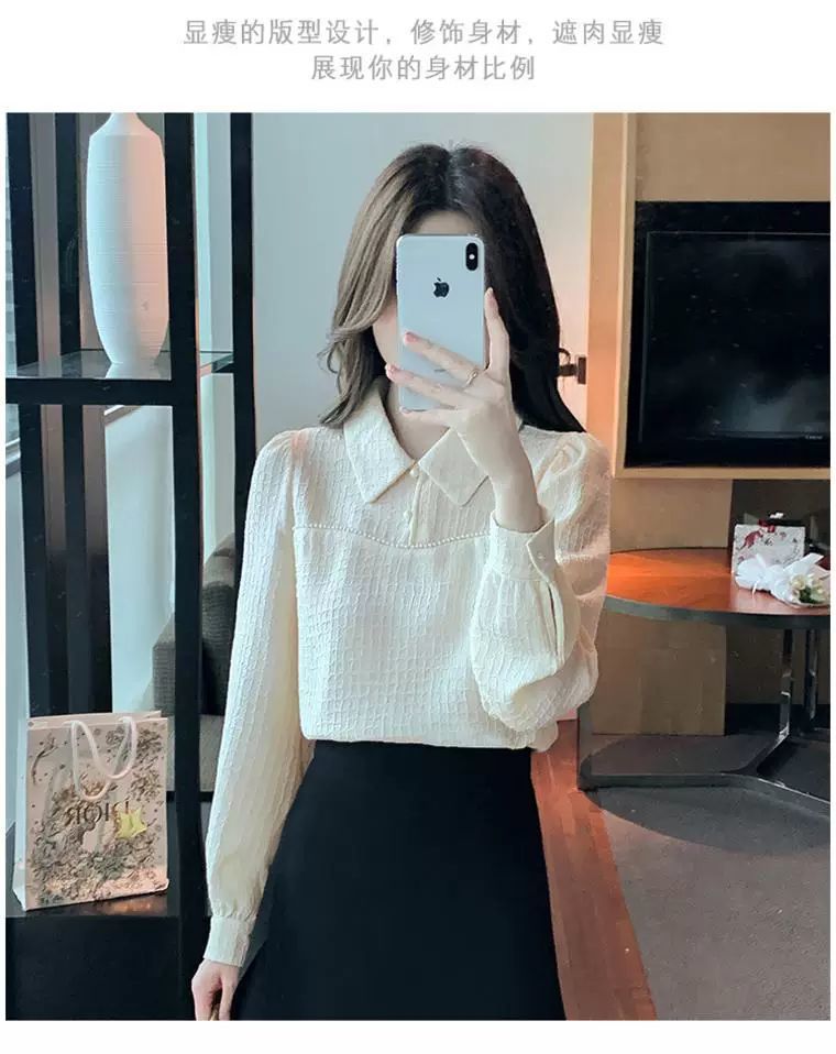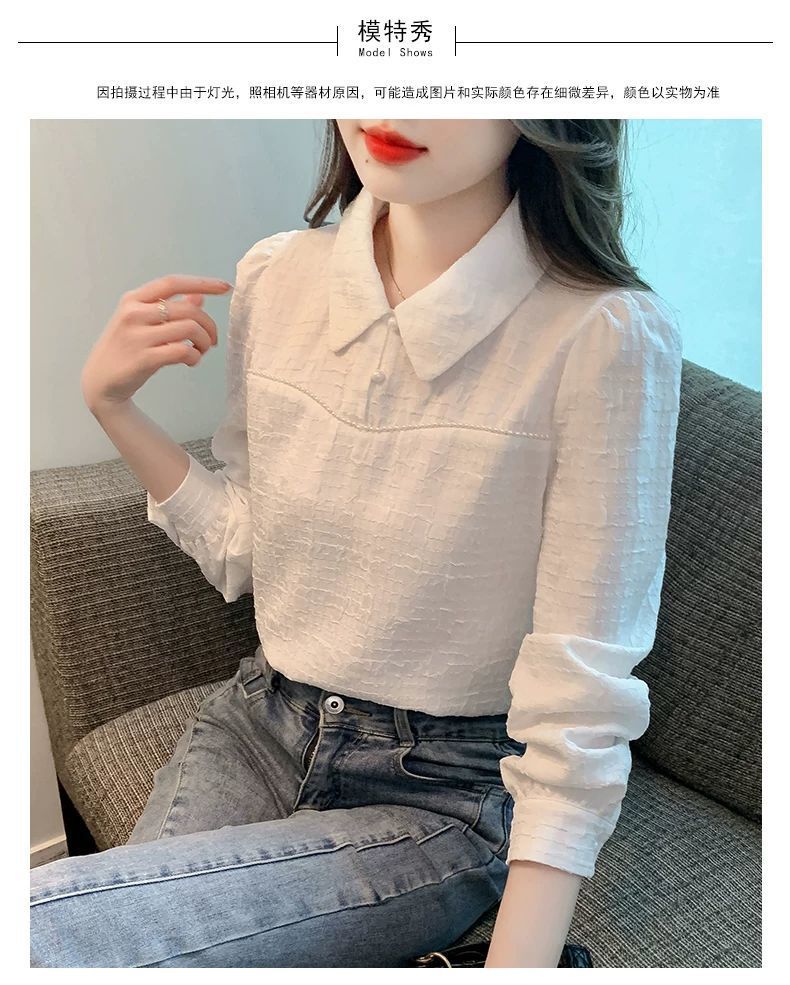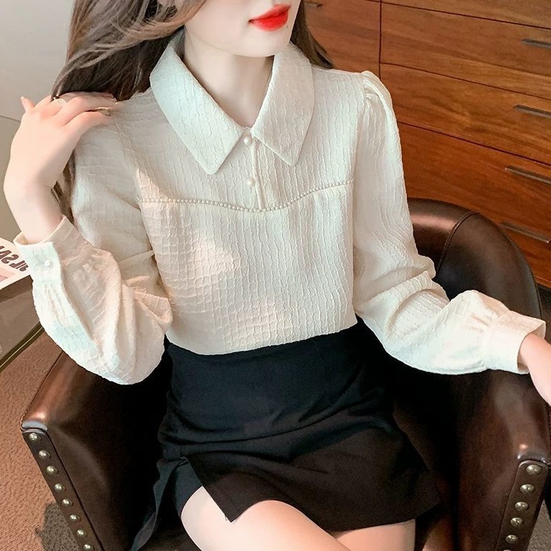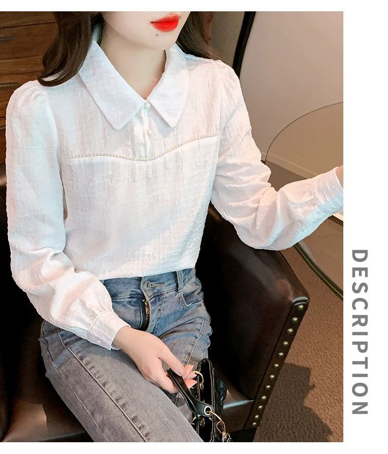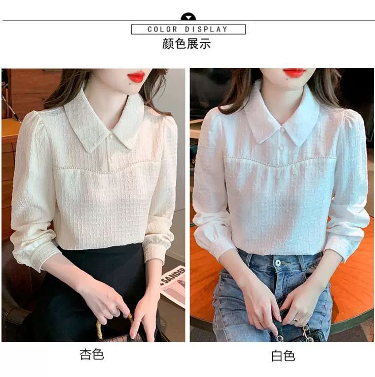 2024 가을 겨울 여성용 인형 칼라 긴팔 쉬폰 셔츠, 스타일리시한 벨벳 바닥 셔츠, 슬리밍 및 연령 감소 탑스토어 가기
