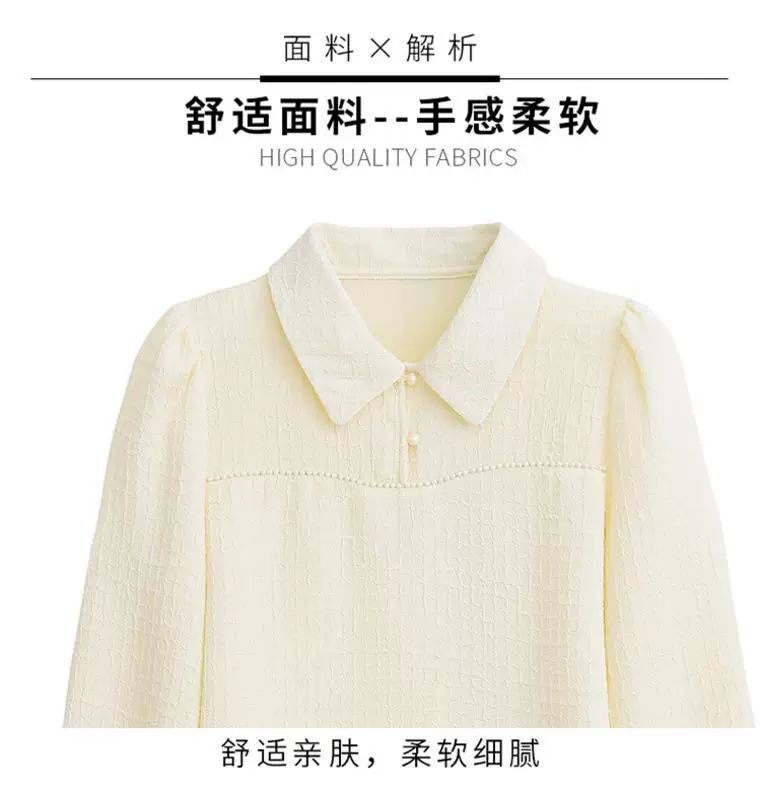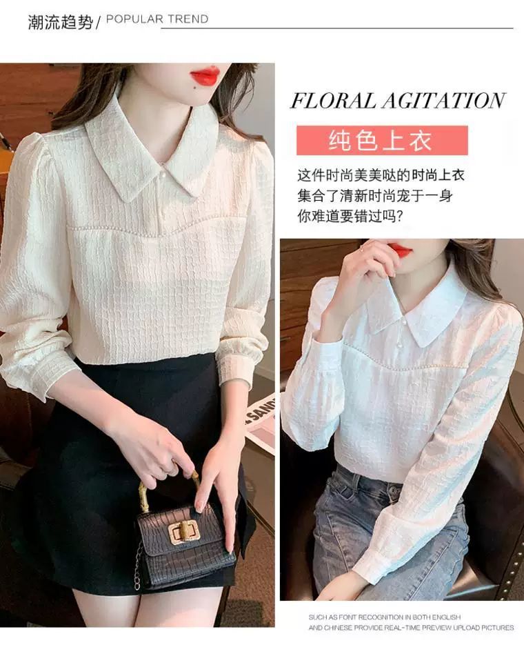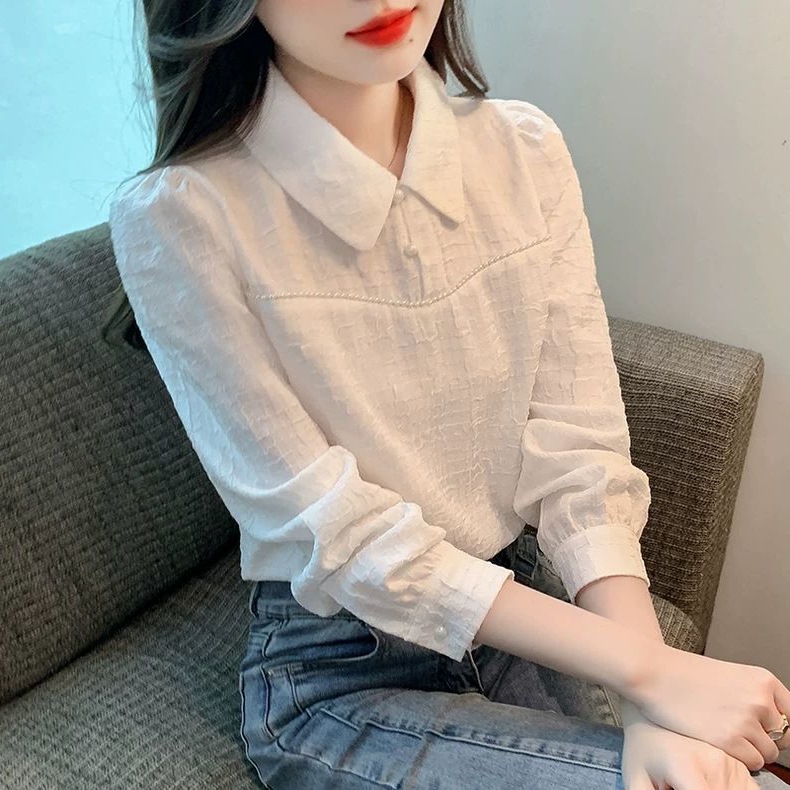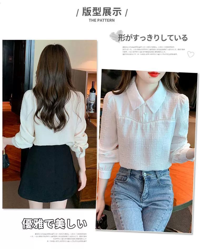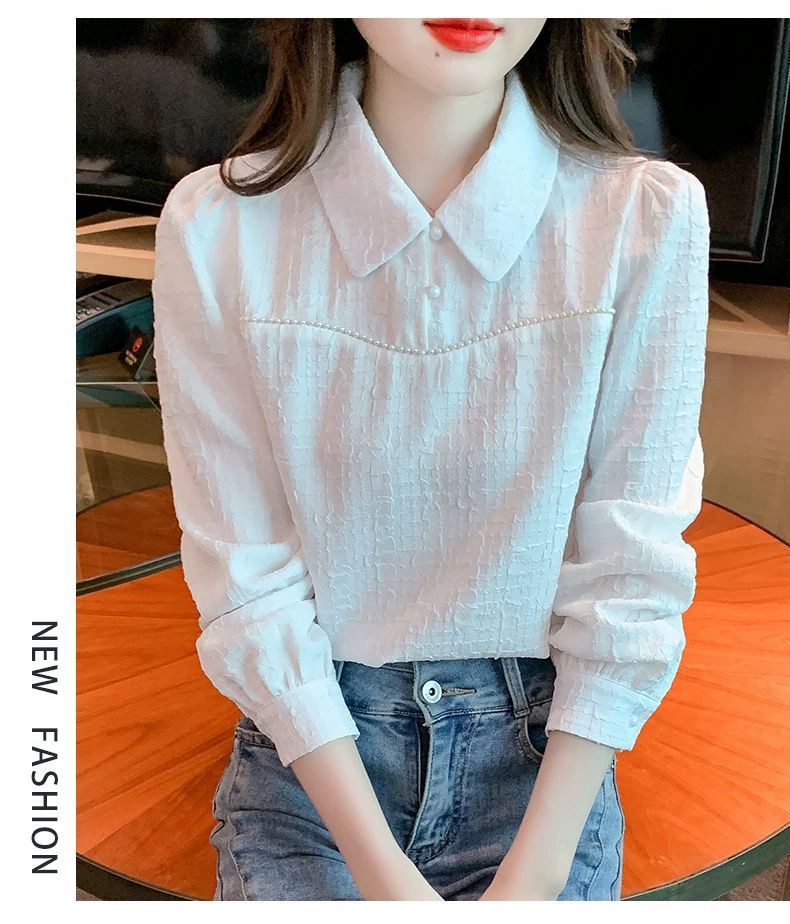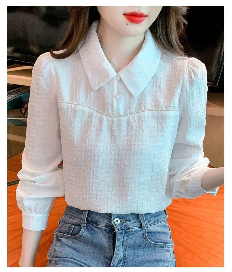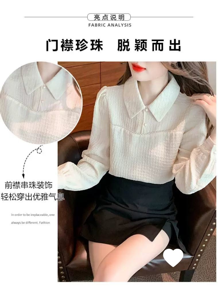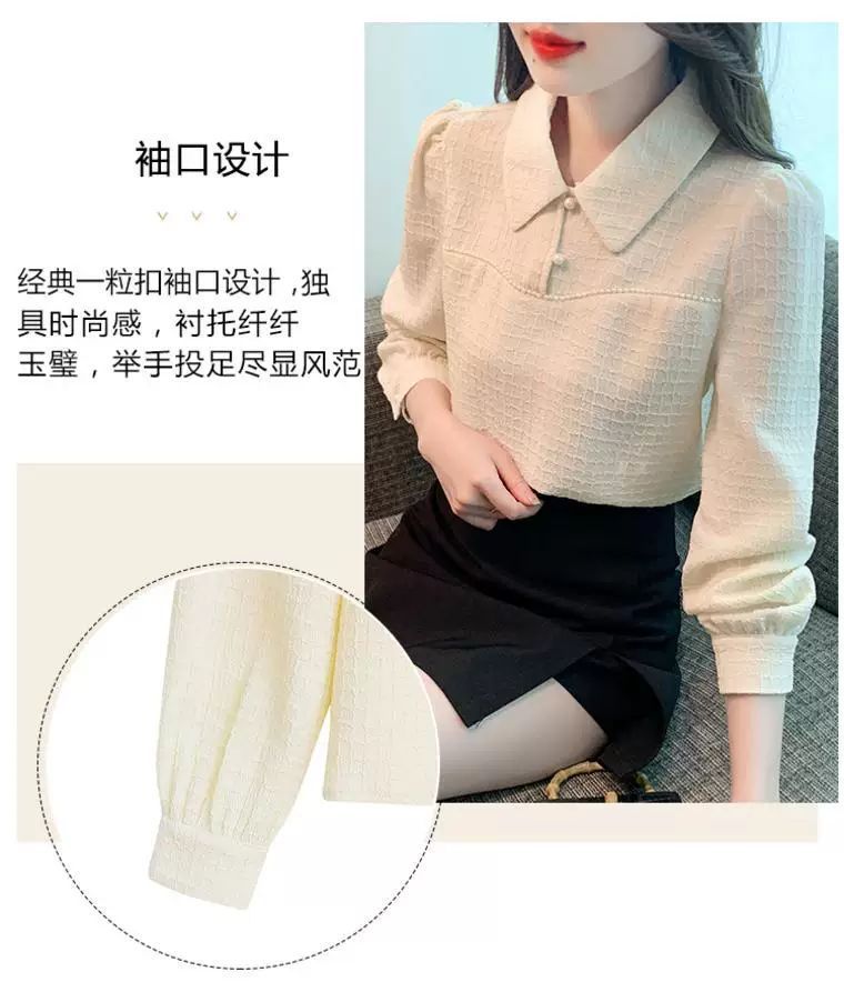 2024 가을 겨울 여성용 인형 칼라 긴팔 쉬폰 셔츠, 스타일리시한 벨벳 바닥 셔츠, 슬리밍 및 연령 감소 탑스토어 가기