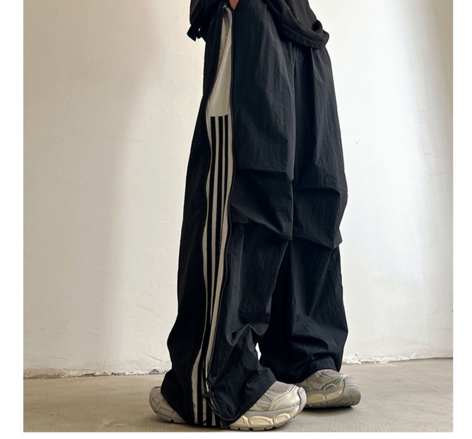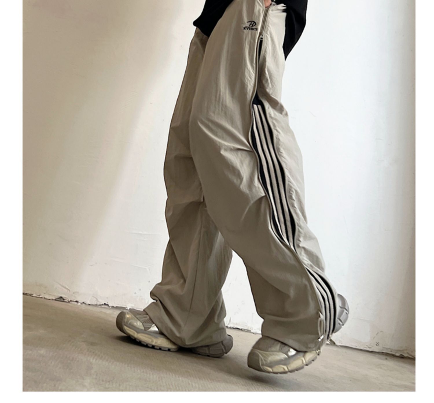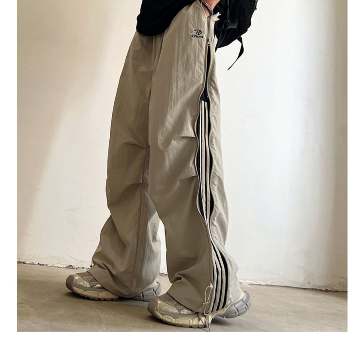 가을 남성용 미국식 속건성 낙하산 바지 트렌디 하이 스트리트 스트라이프 충전 바지 얇은 지퍼 와이드 레그 캐주얼 바지