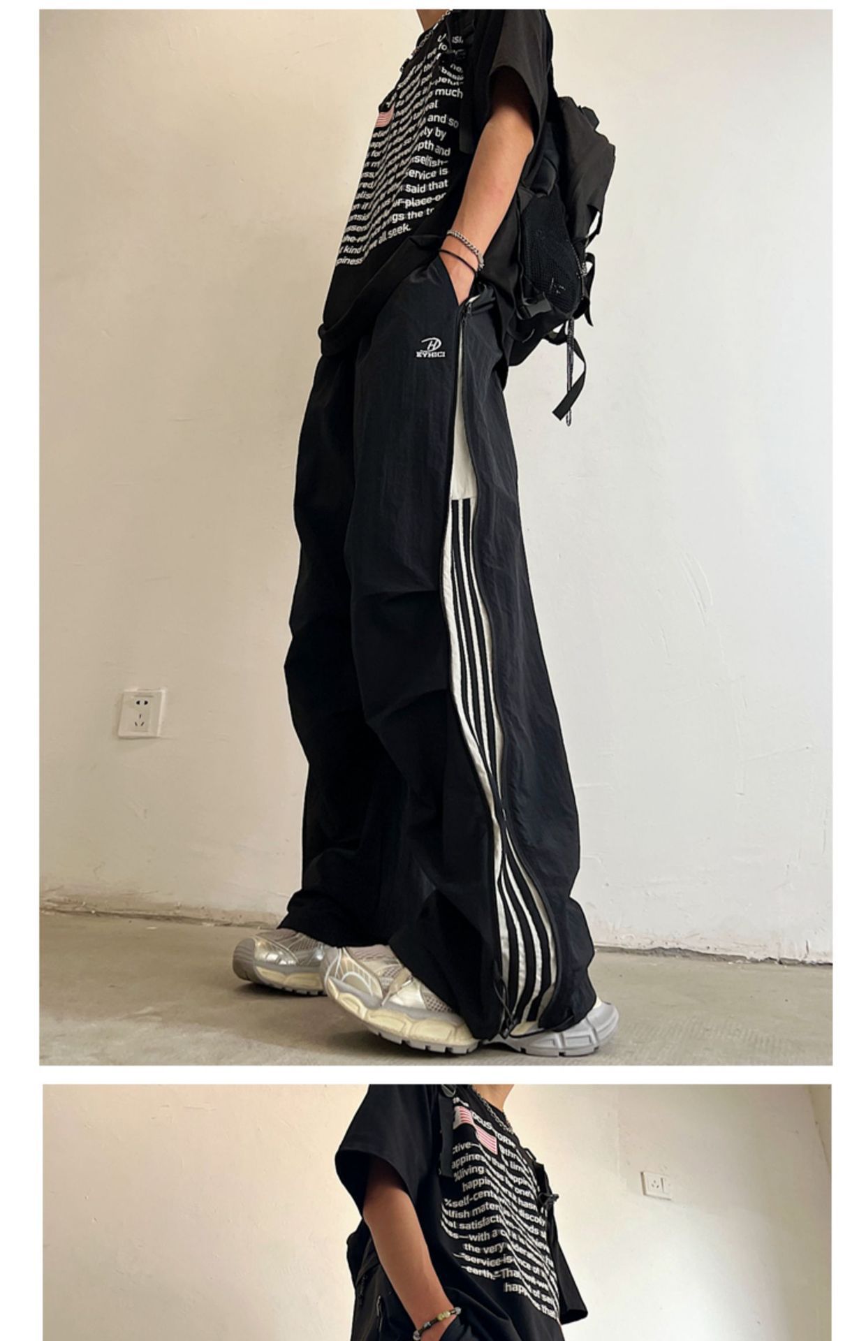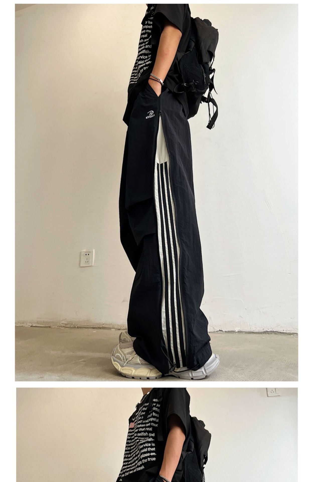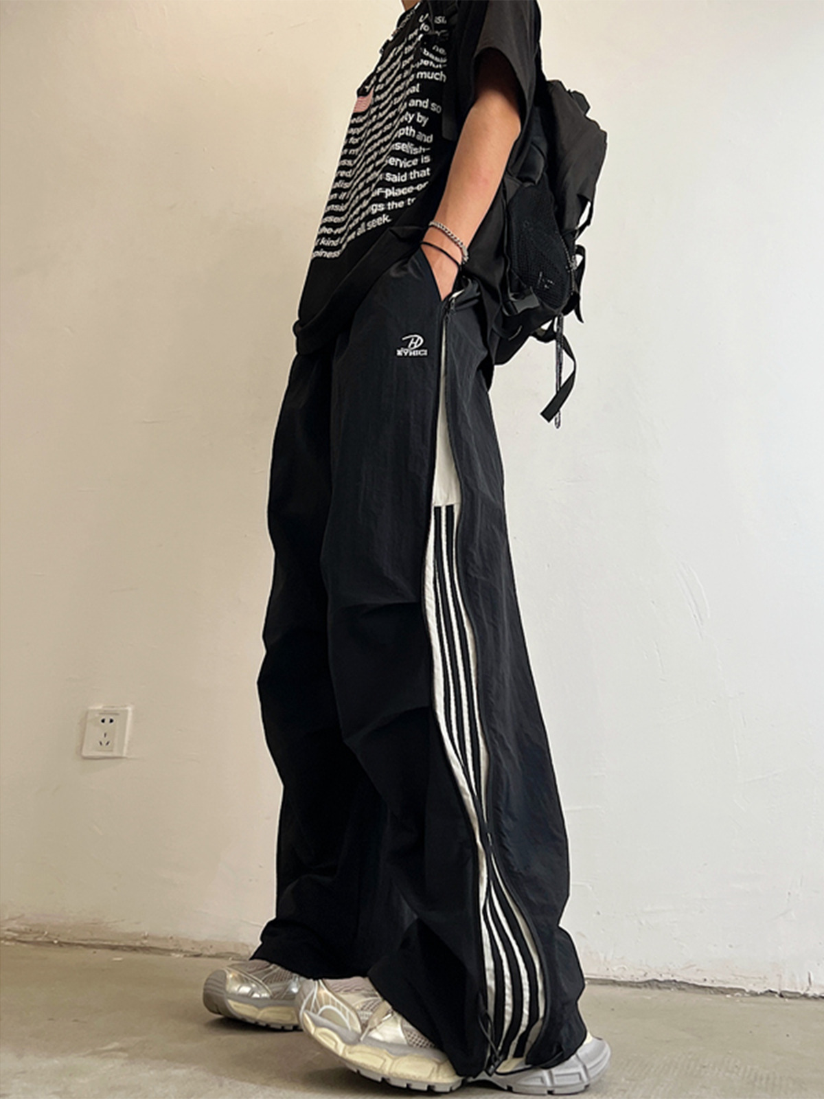 가을 남성용 미국식 속건성 낙하산 바지 트렌디 하이 스트리트 스트라이프 충전 바지 얇은 지퍼 와이드 레그 캐주얼 바지