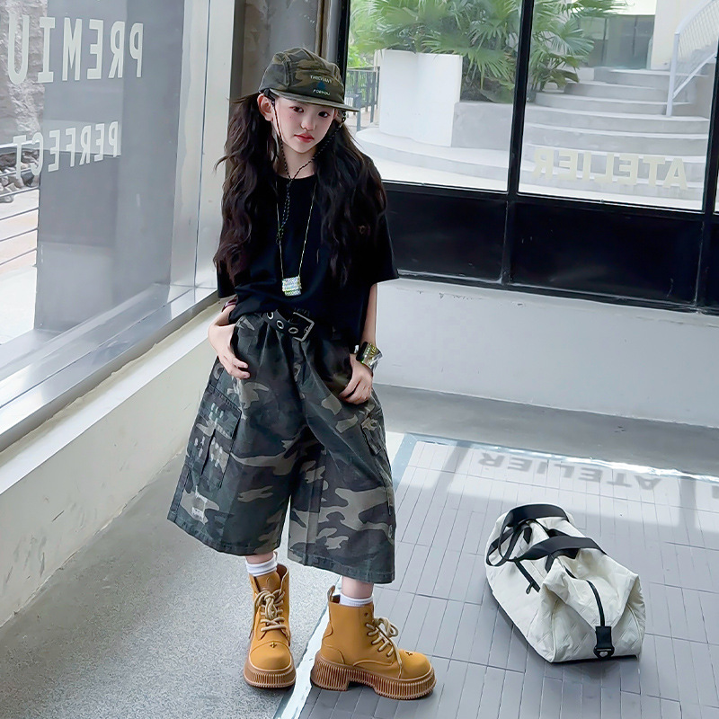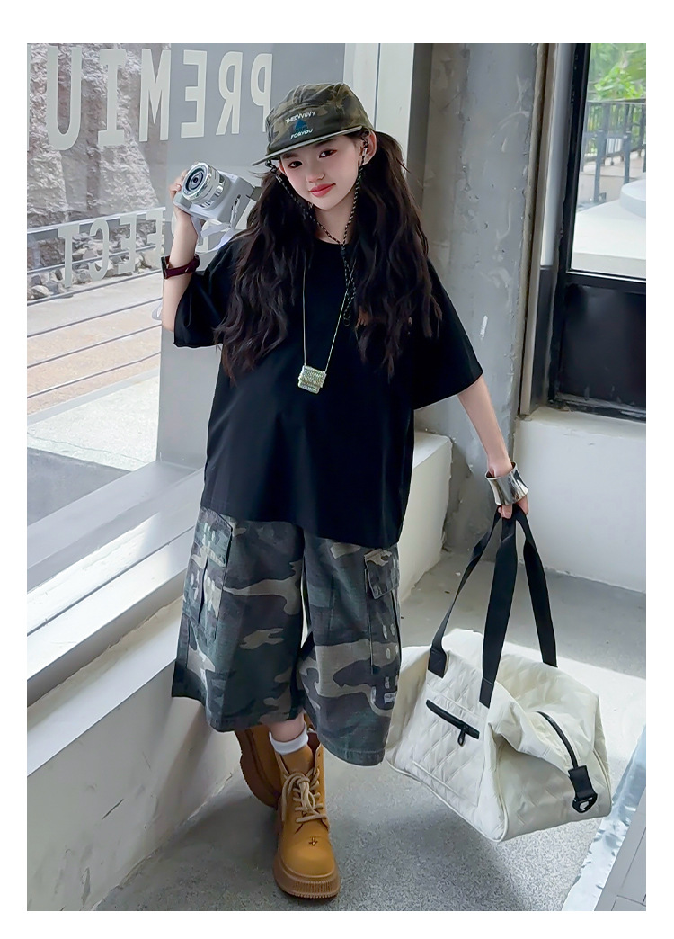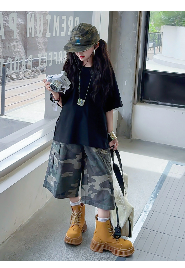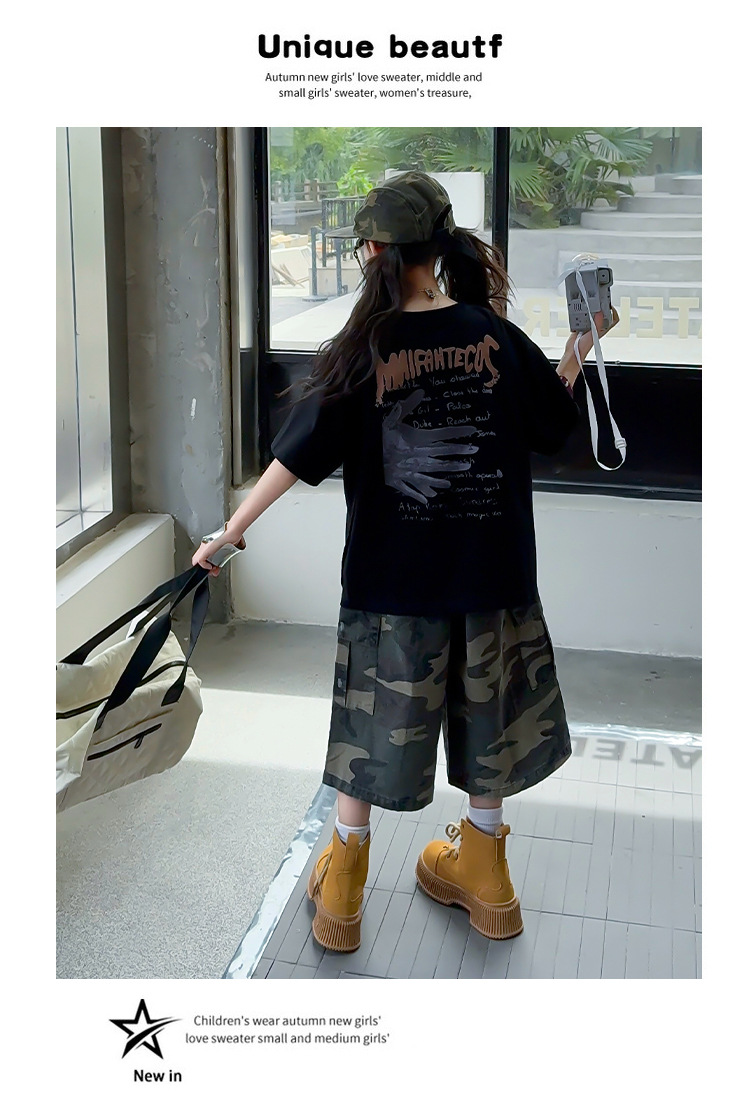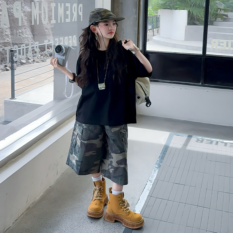 여아 위장 작업복 정장 2025 여름 중대형 아동 스포츠 트렌디 브랜드 티셔츠 루즈 캐주얼 투피스 세트스토어 가기
