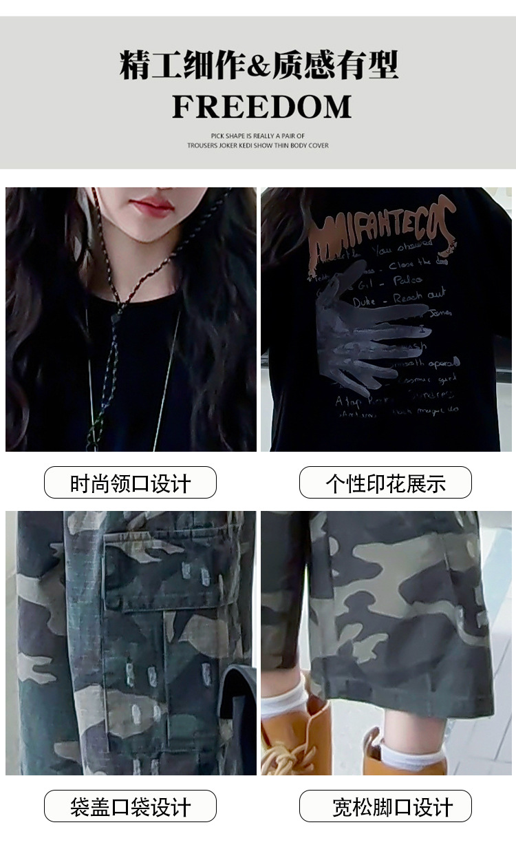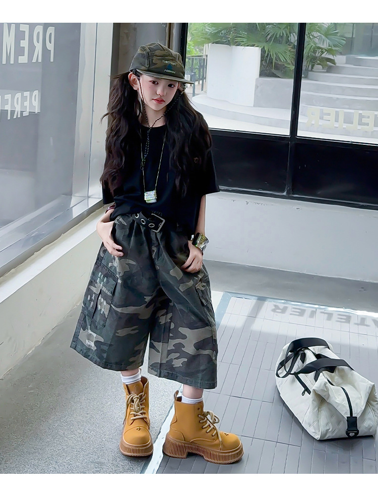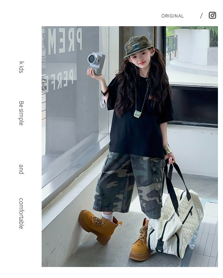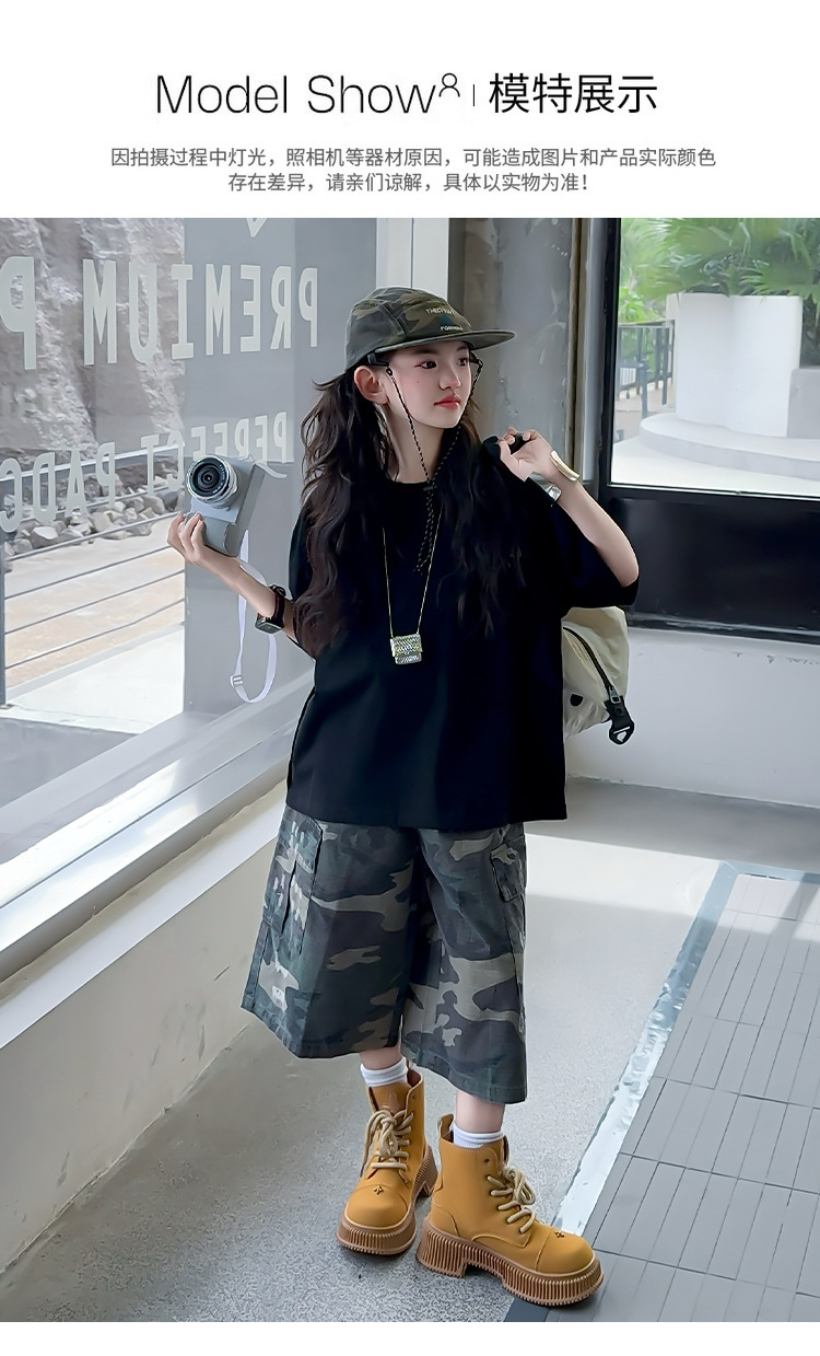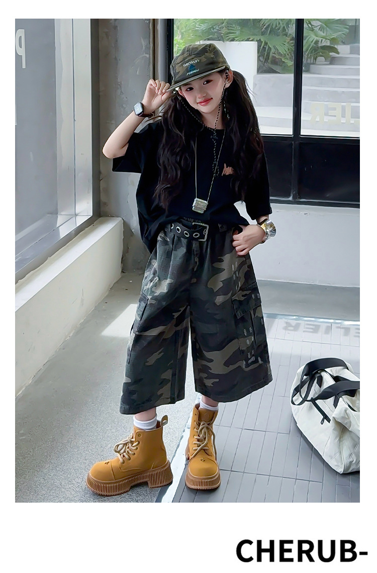 여아 위장 작업복 정장 2025 여름 중대형 아동 스포츠 트렌디 브랜드 티셔츠 루즈 캐주얼 투피스 세트스토어 가기