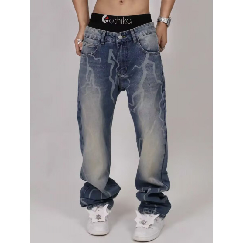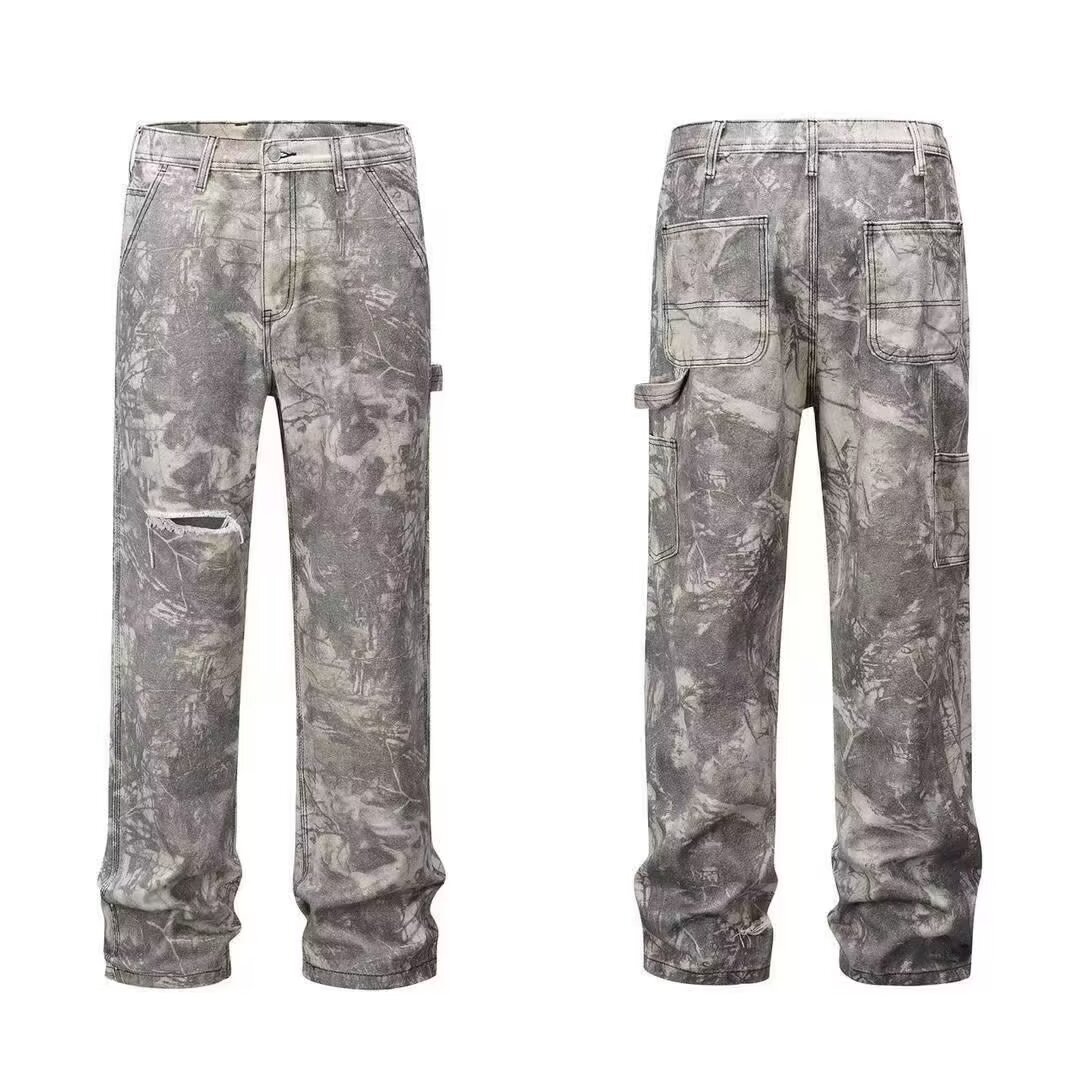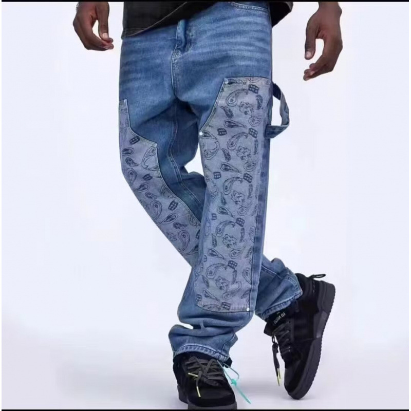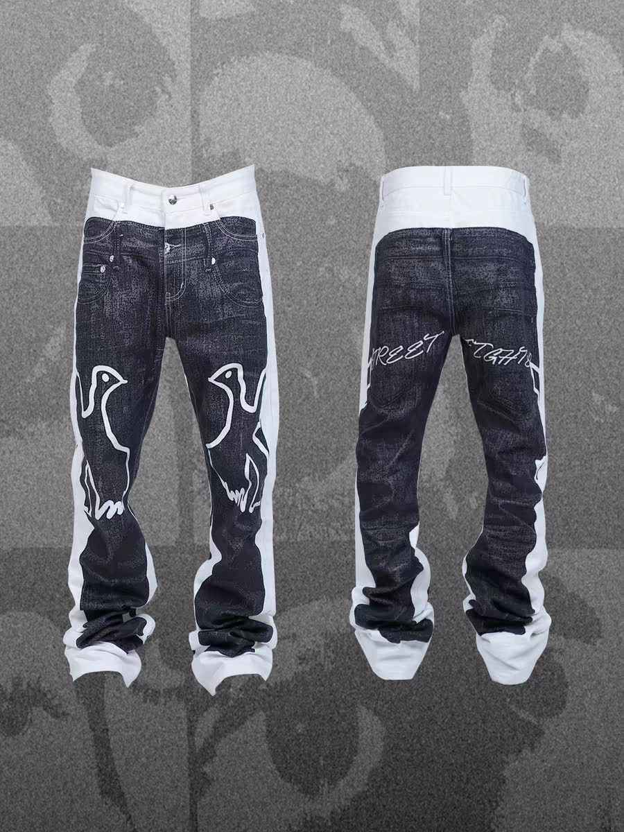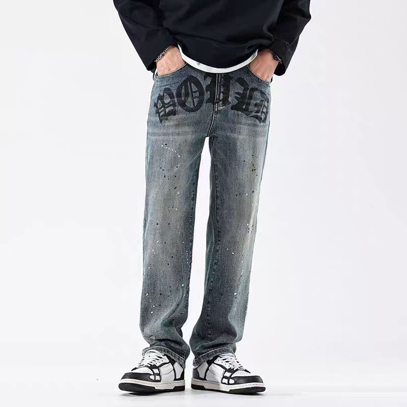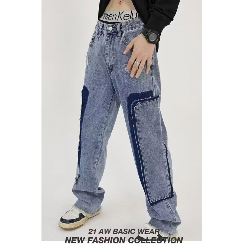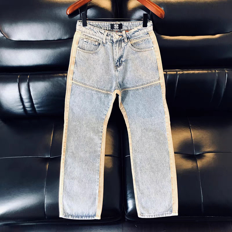 跨境欧美高街vibe裤子牛仔裤美式直筒拼接泼墨微喇长裤男一件代发