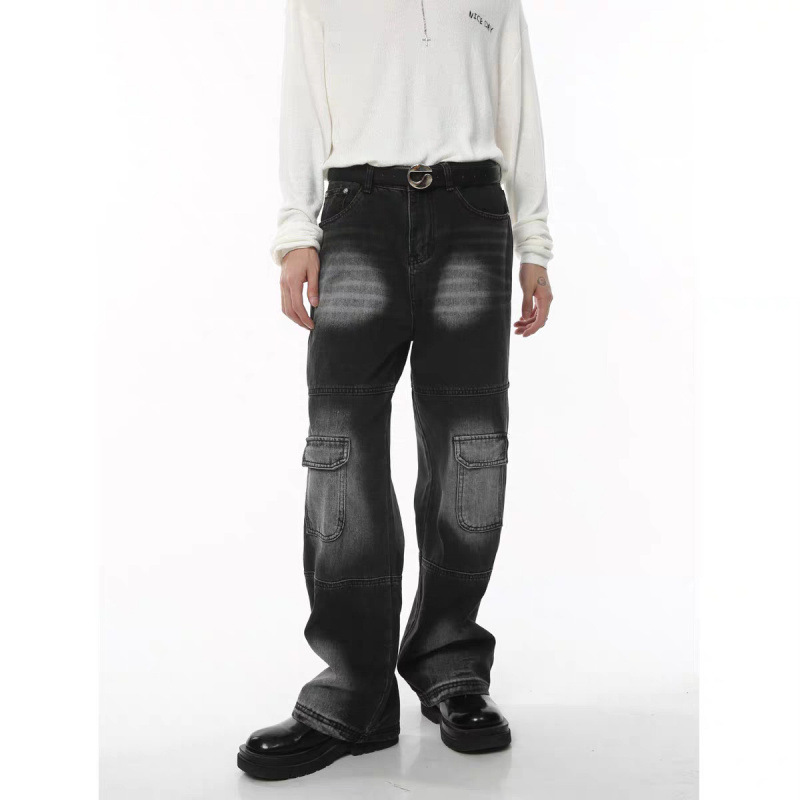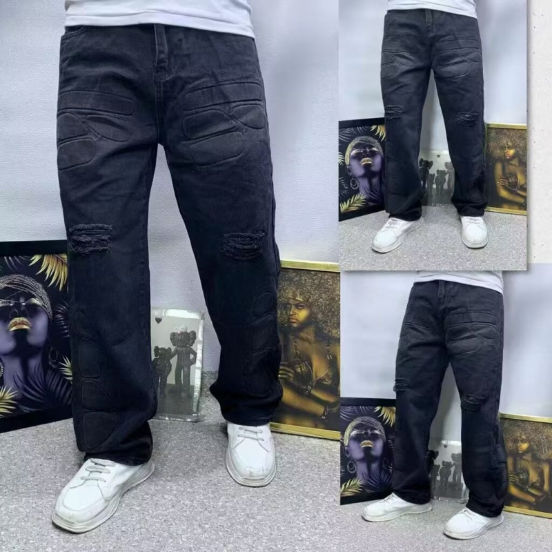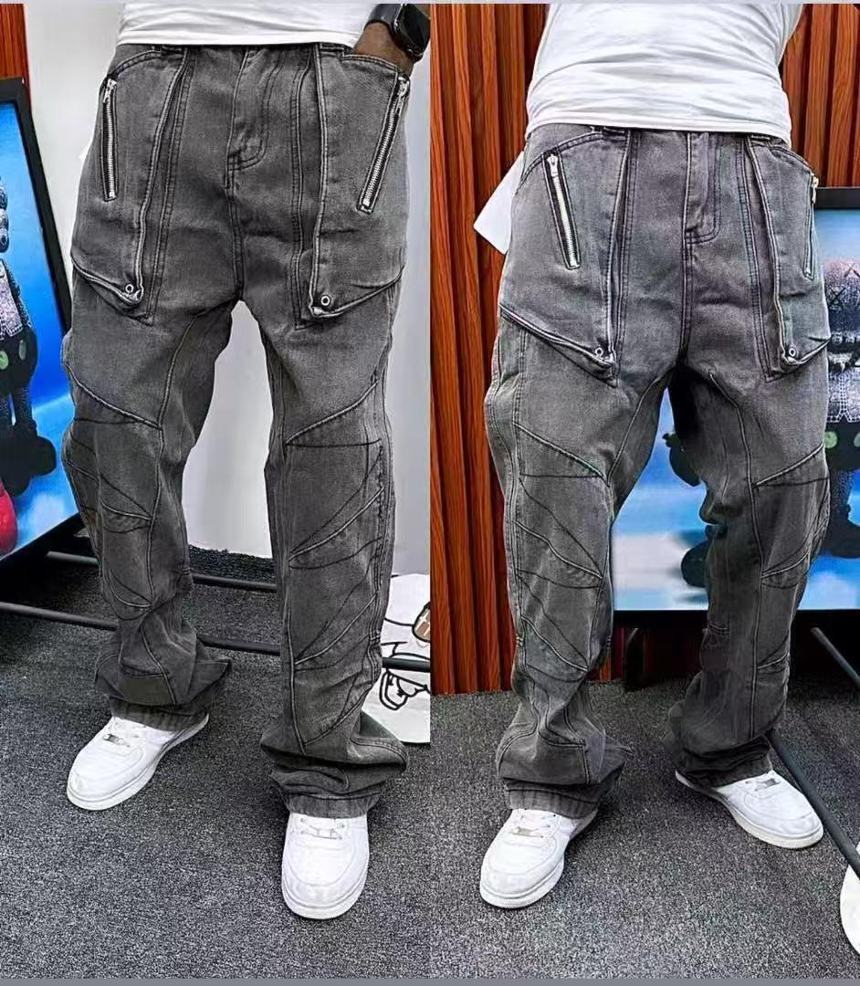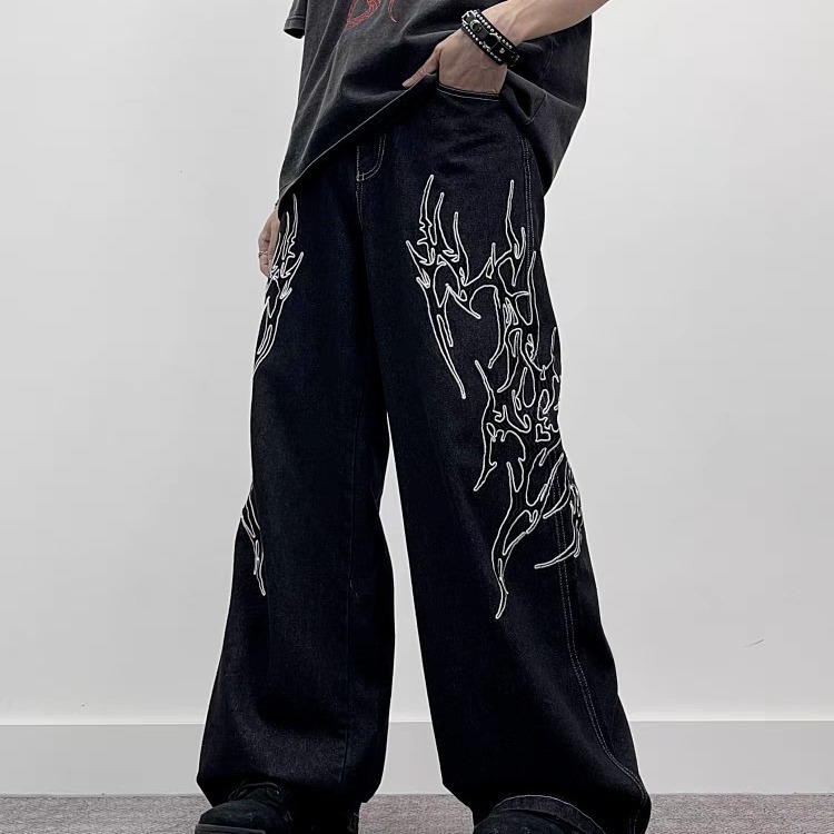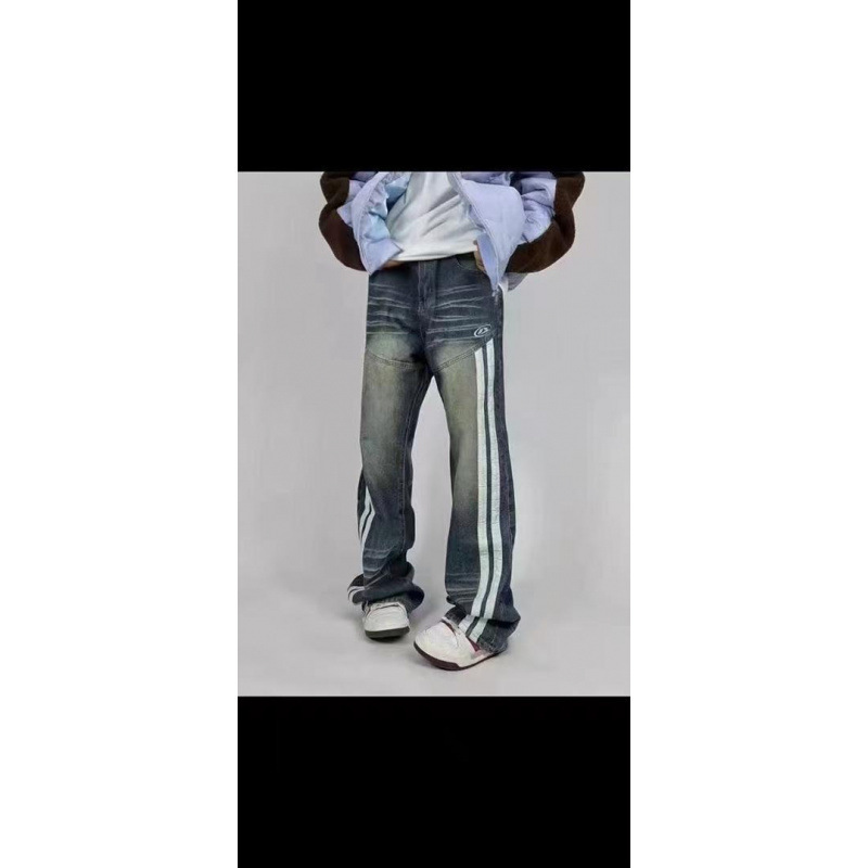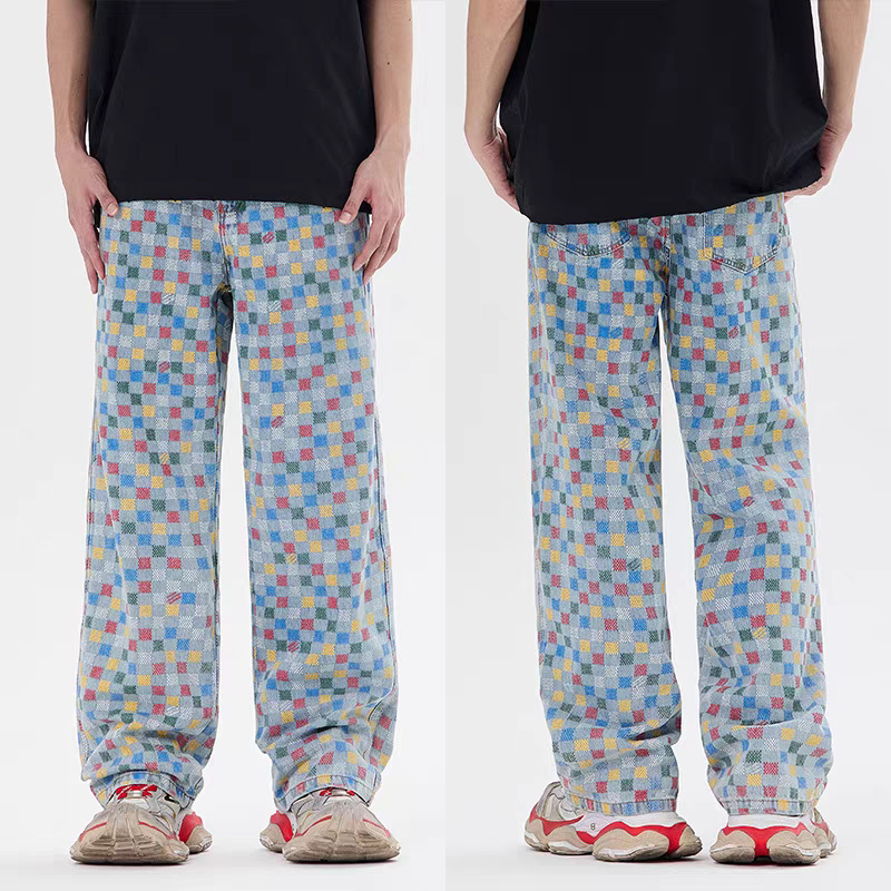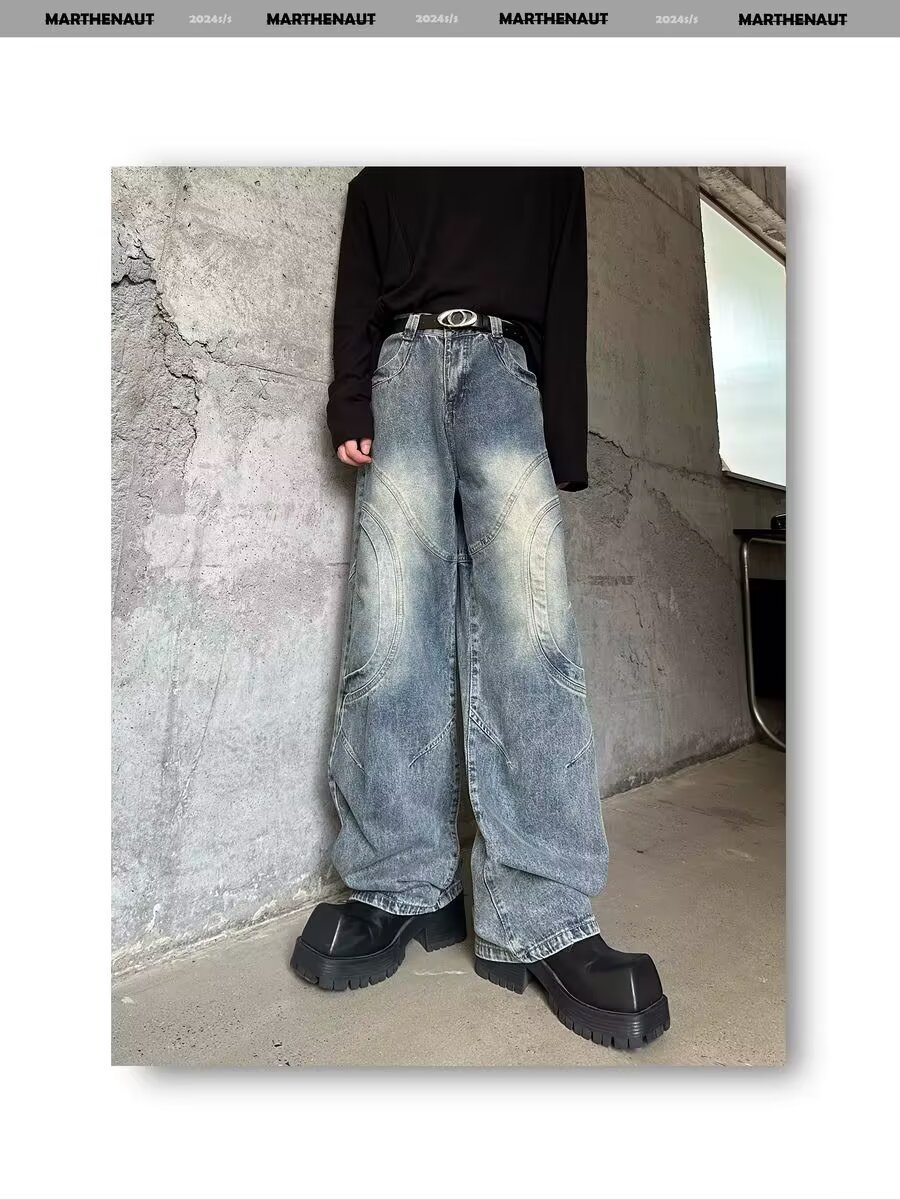 跨境欧美高街vibe裤子牛仔裤美式直筒拼接泼墨微喇长裤男一件代发