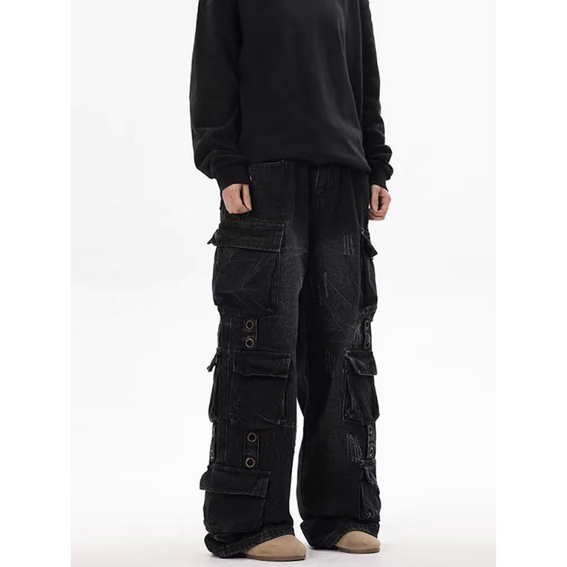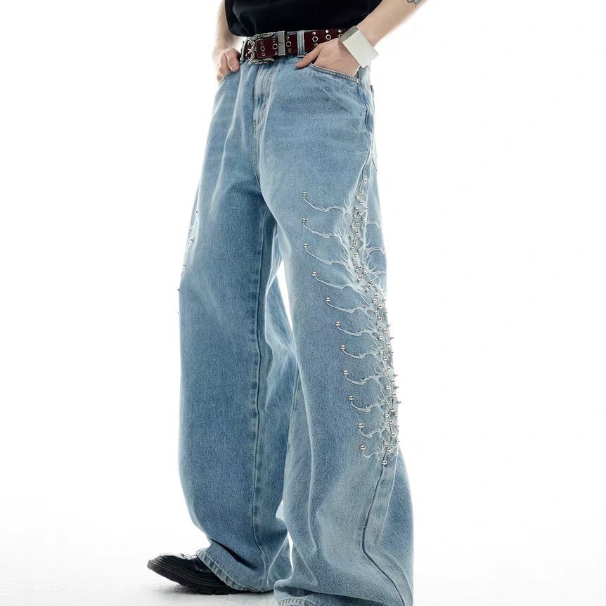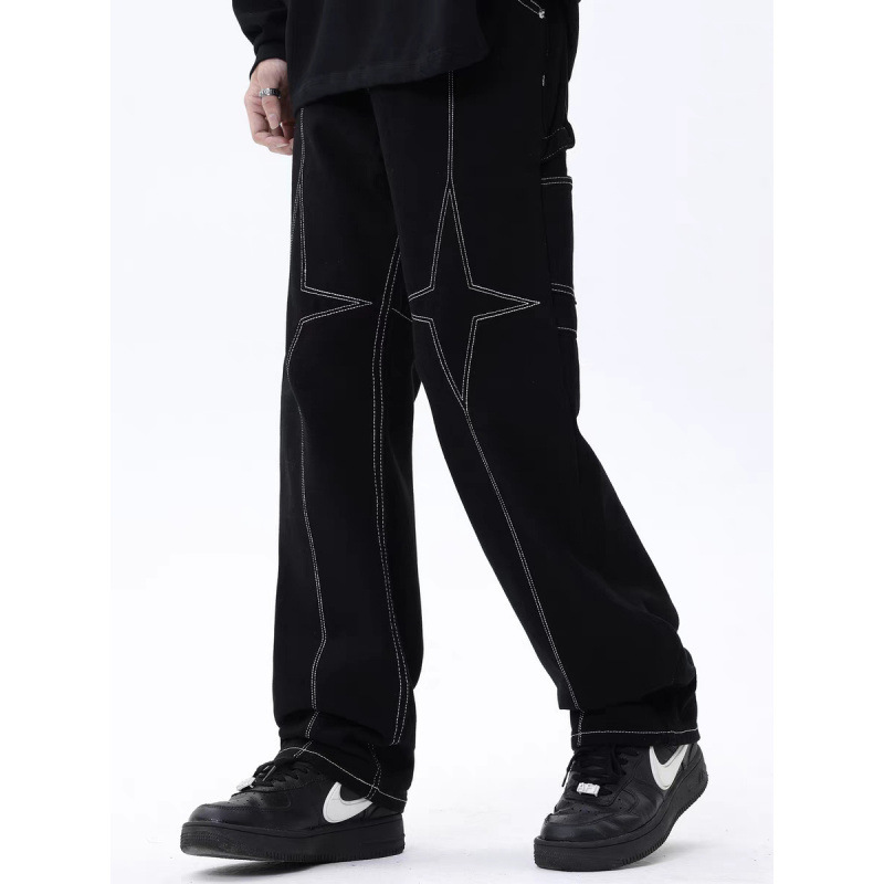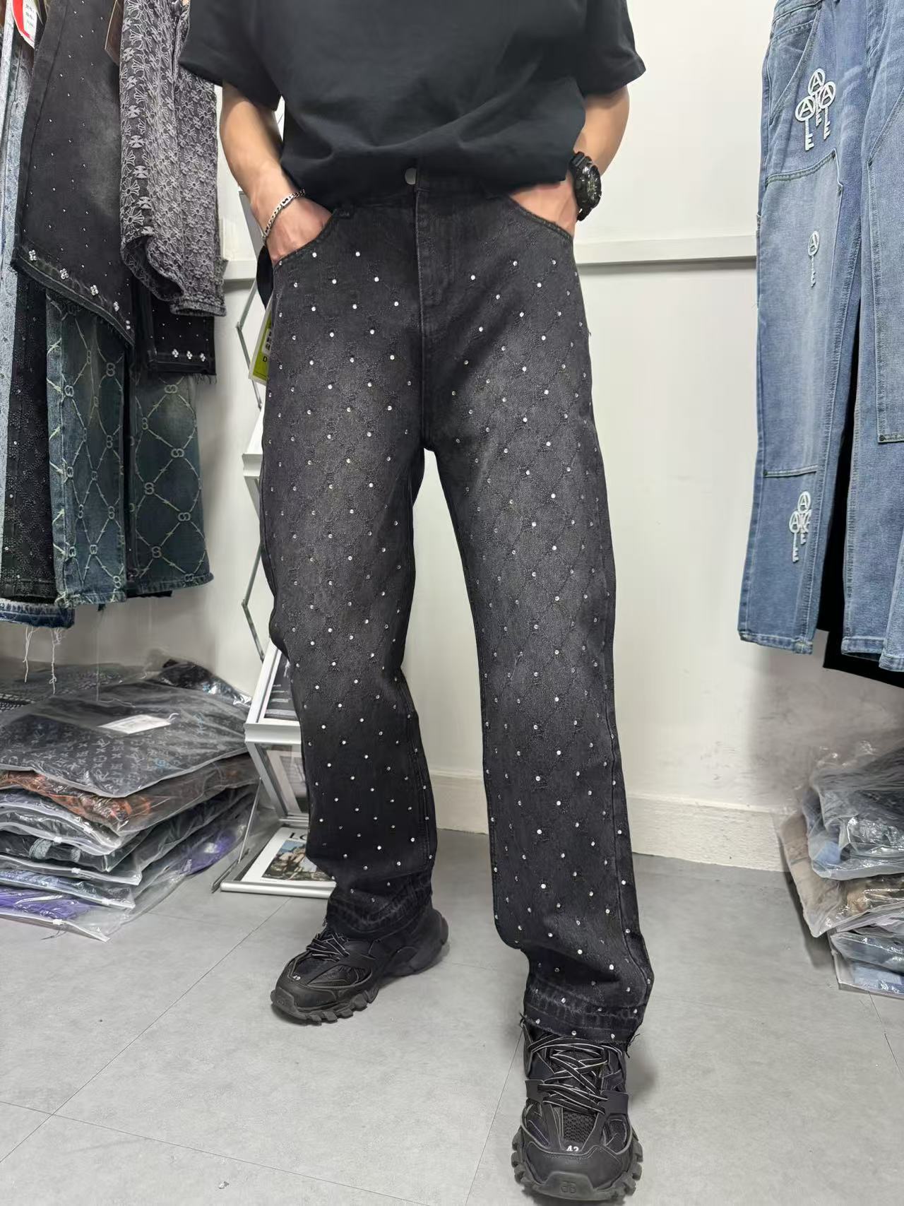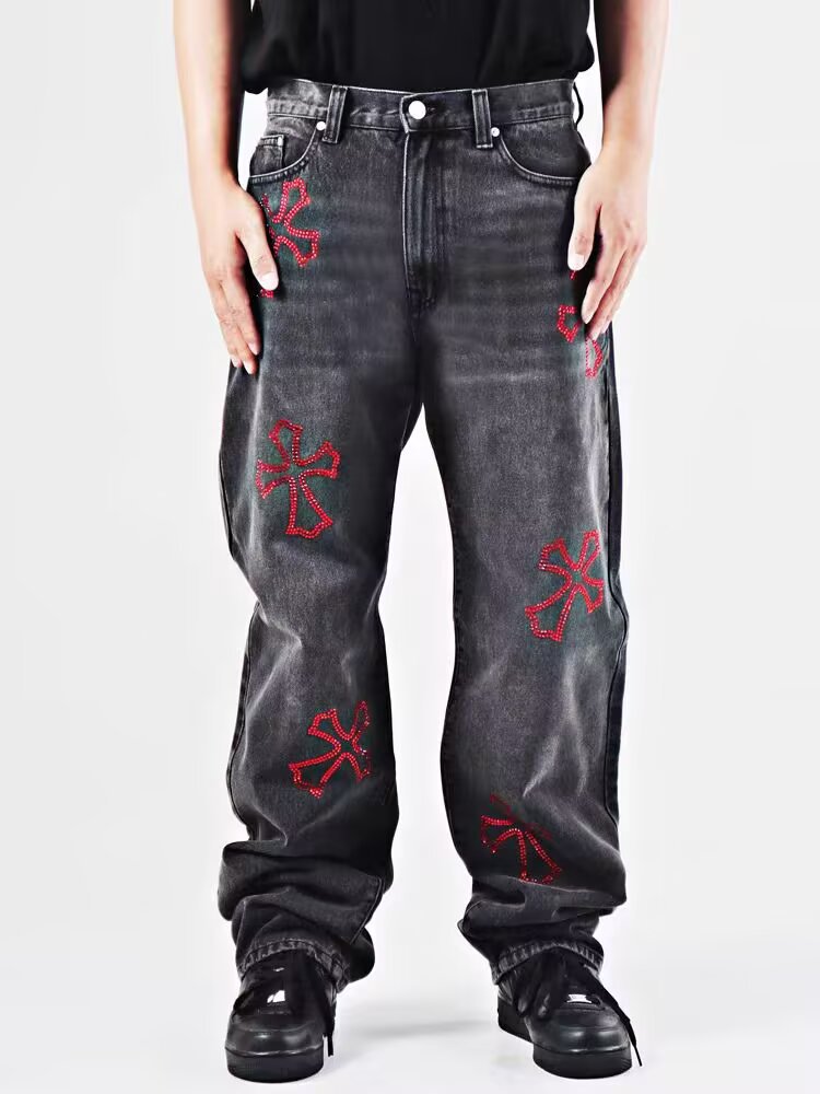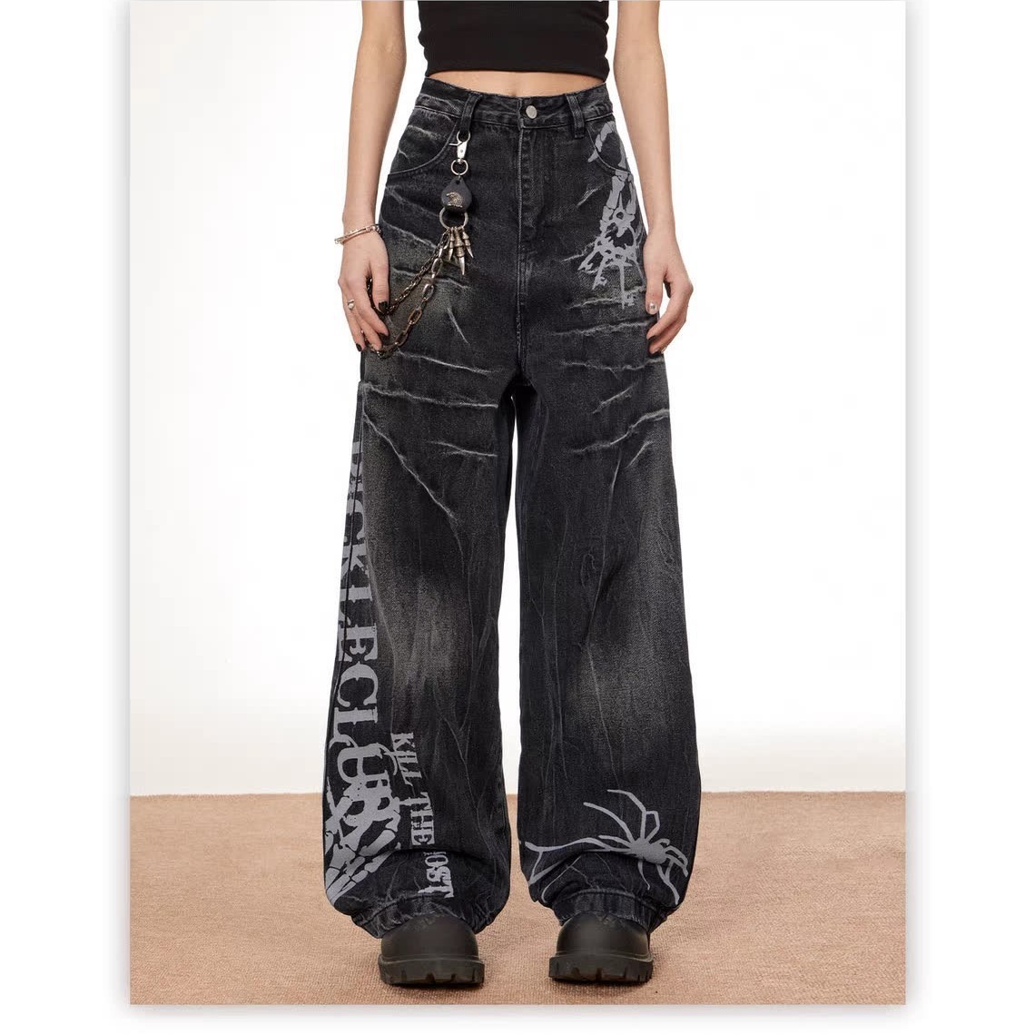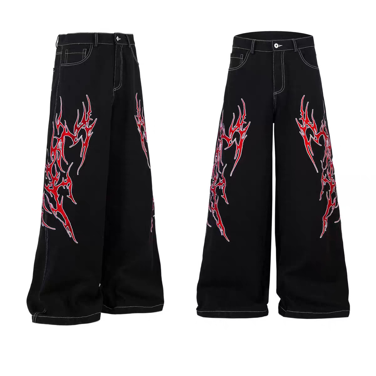 跨境欧美高街vibe裤子牛仔裤美式直筒拼接泼墨微喇长裤男一件代发