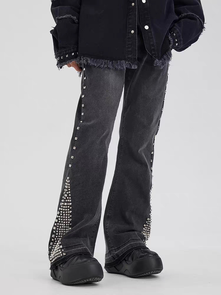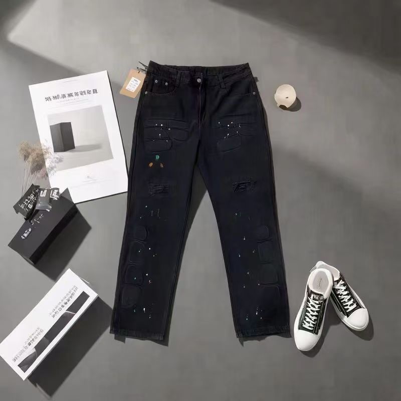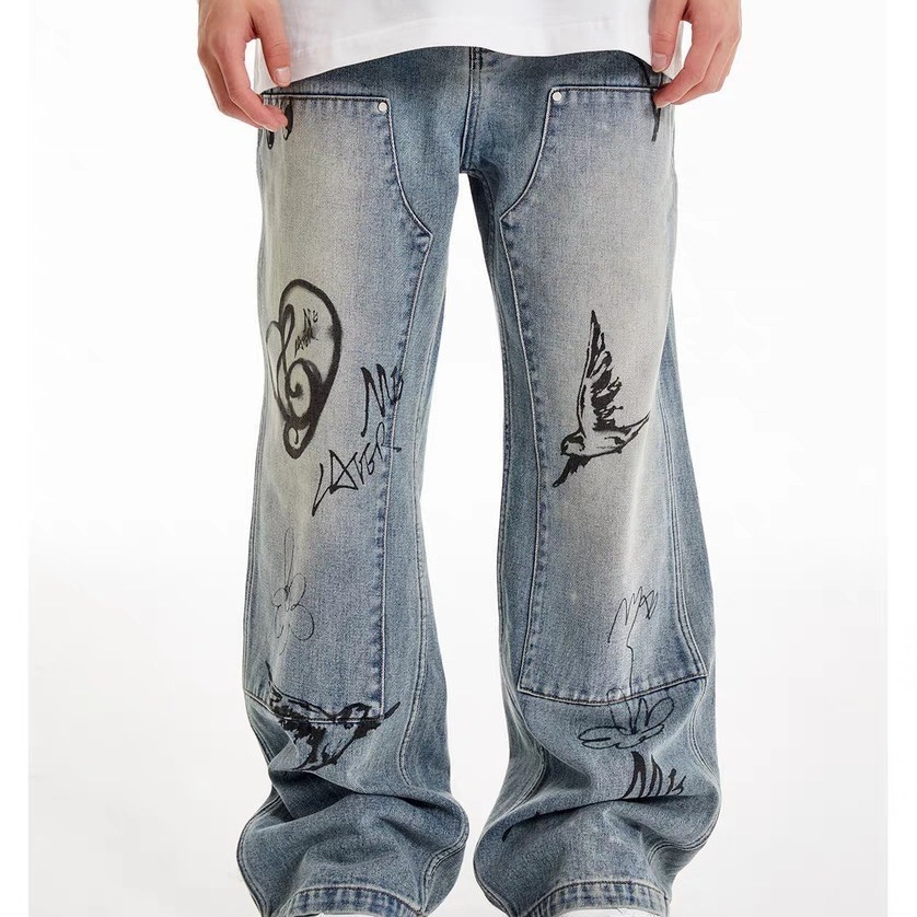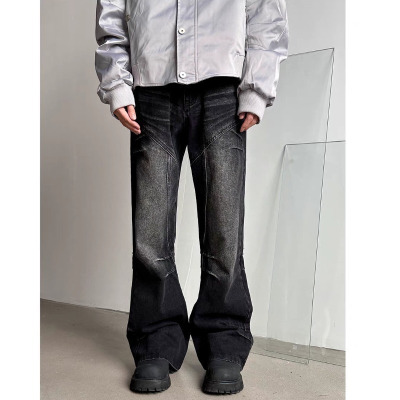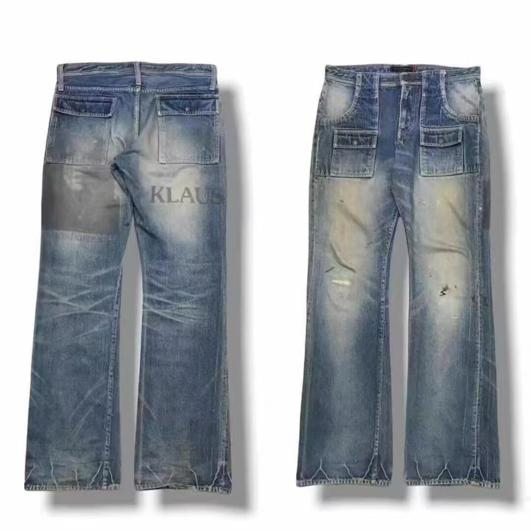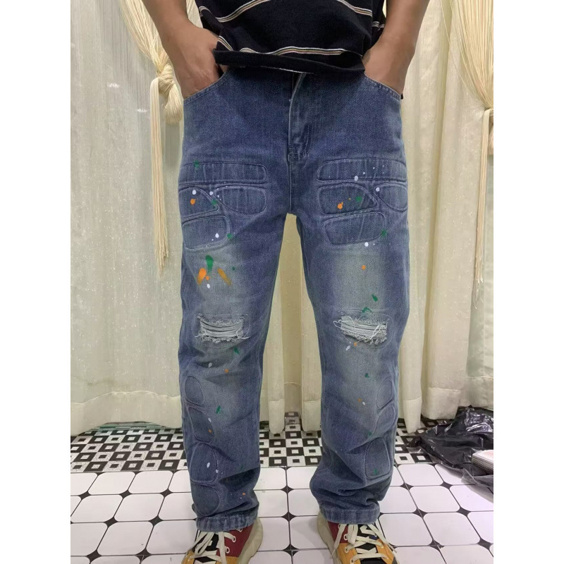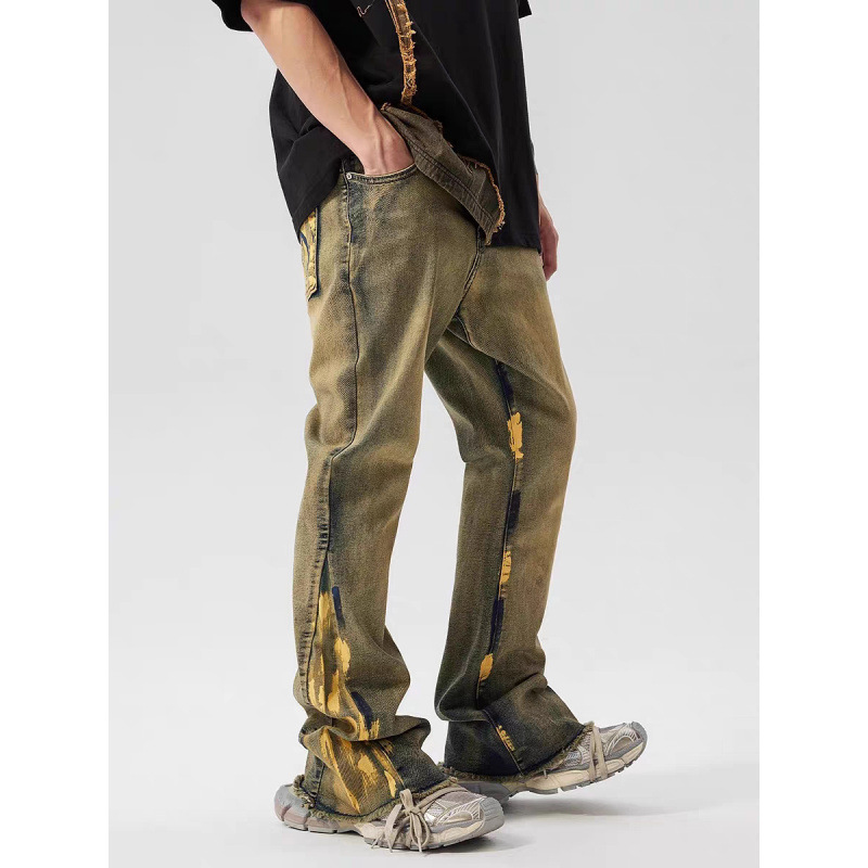 크로스보더 유럽 및 미국 하이 스트리트 바이브 팬츠, 청바지, 아메리칸 스트레이트 스플라이싱 스플래시 잉크 마이크로 플레어 바지, 남성용 원피스 드롭쉬핑스토어 가기