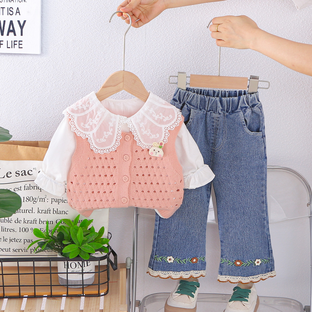 여아 정장 봄, 가을 어린이 자수 칼라 스웨터 조끼 3 피스 세트 아기 유행 캐주얼 유아 의류스토어 가기