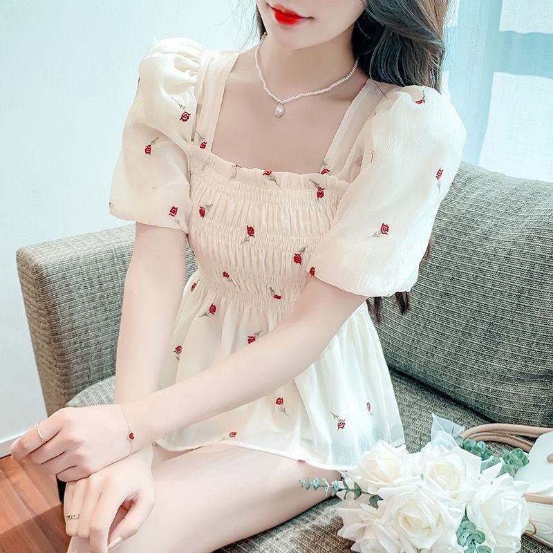 여성용 쉬폰 탑, 여름 꽃무늬 자수 퍼프 소매, 배를 덮는 반팔 티셔츠, 디자인된 스퀘어 넥, 시크한 셔츠스토어 가기