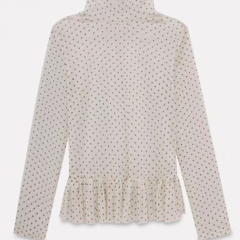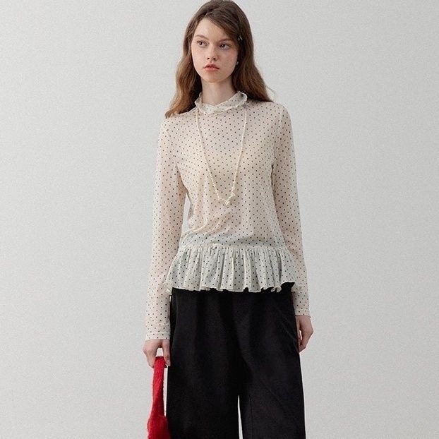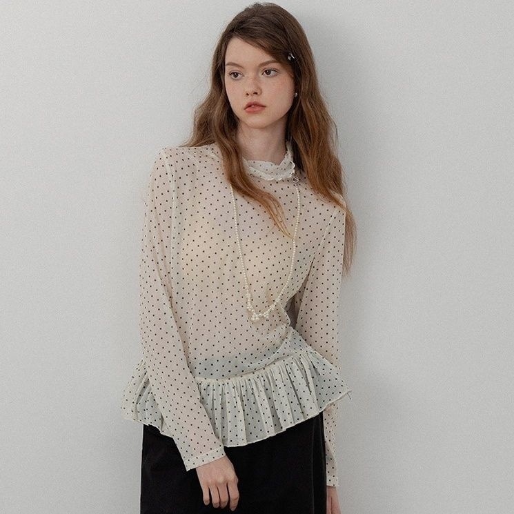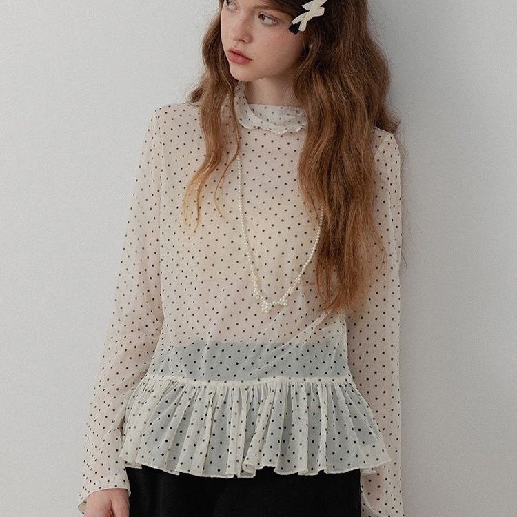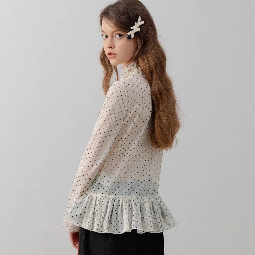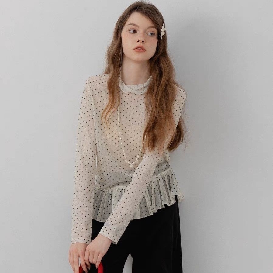 폴카 도트 러플 긴팔 티셔츠 2025 봄 니치 시크 레이어드 베이스 셔츠 쉬폰 셔츠 탑스토어 가기