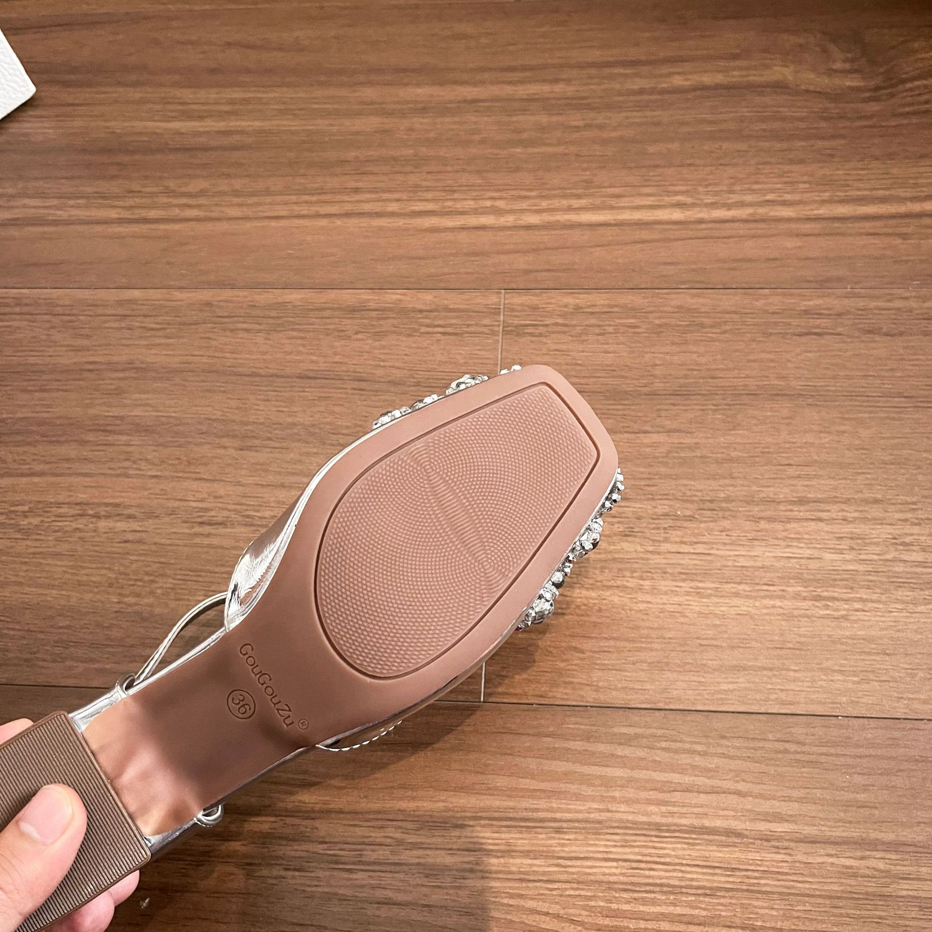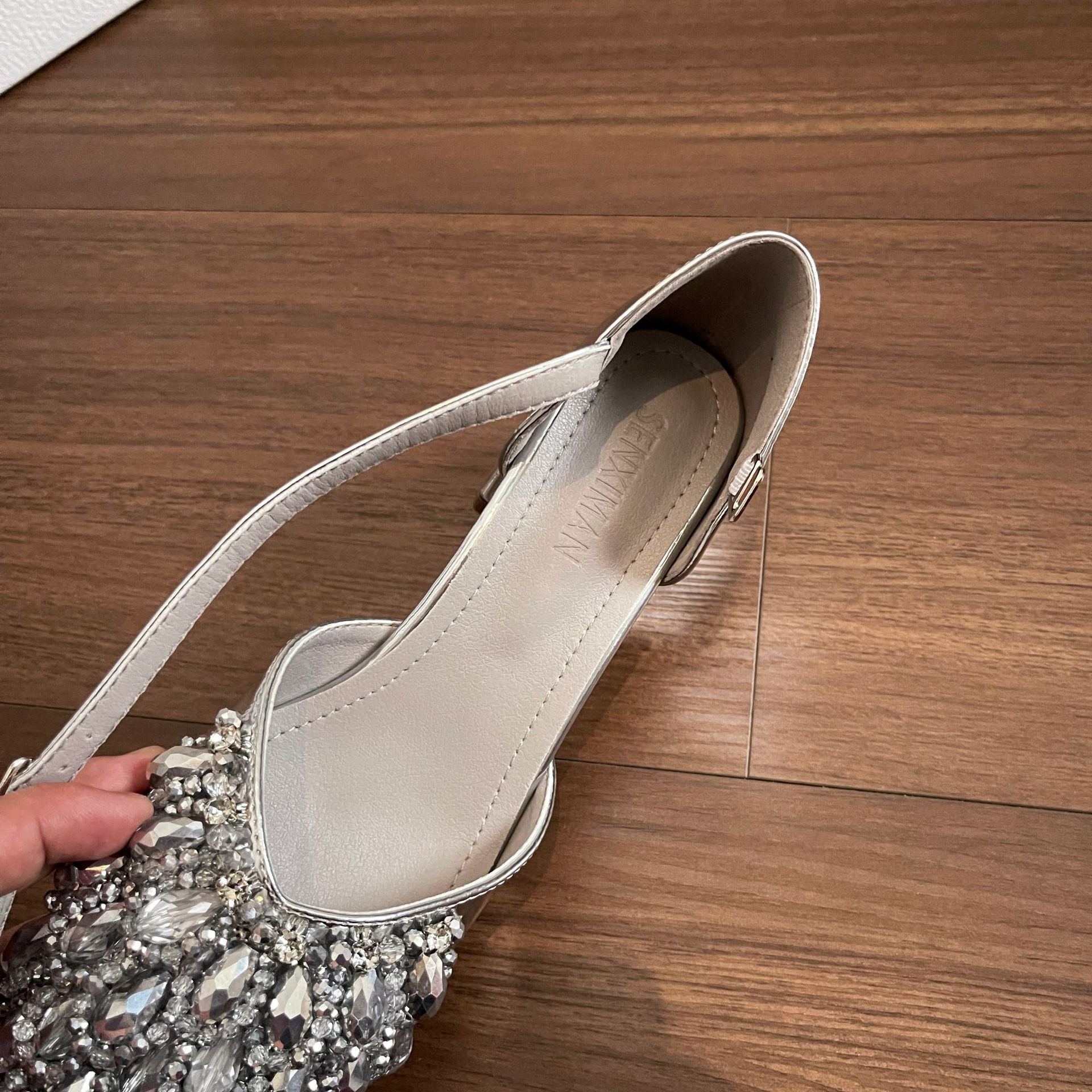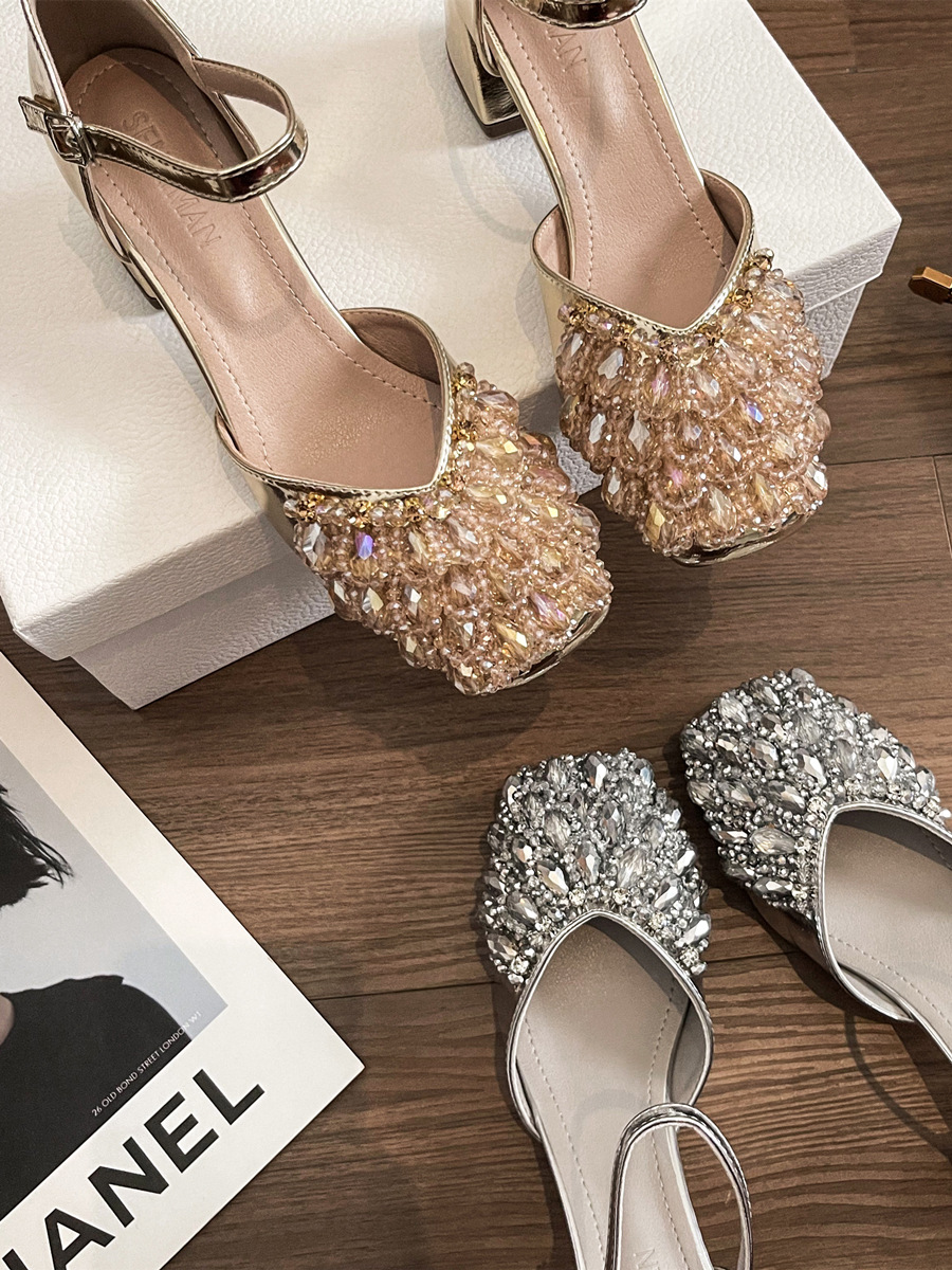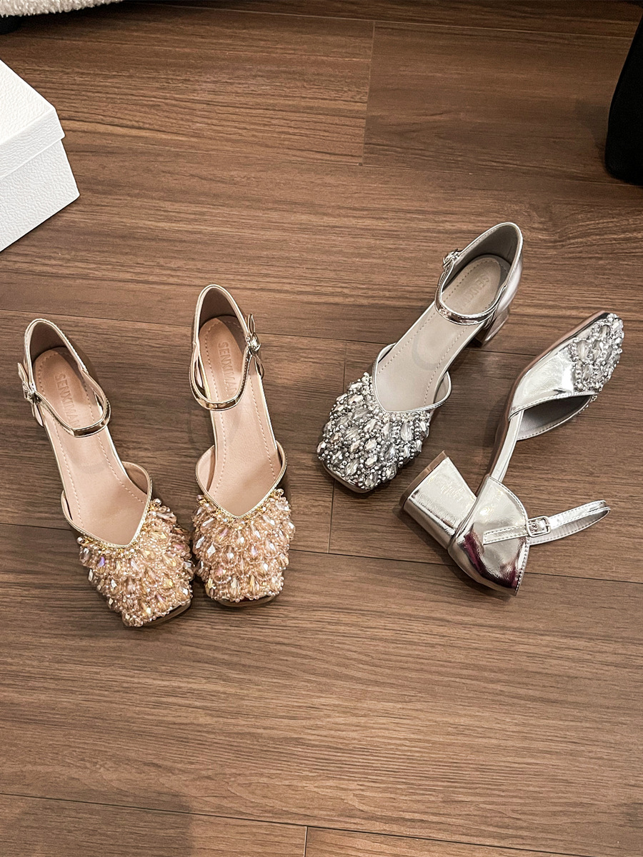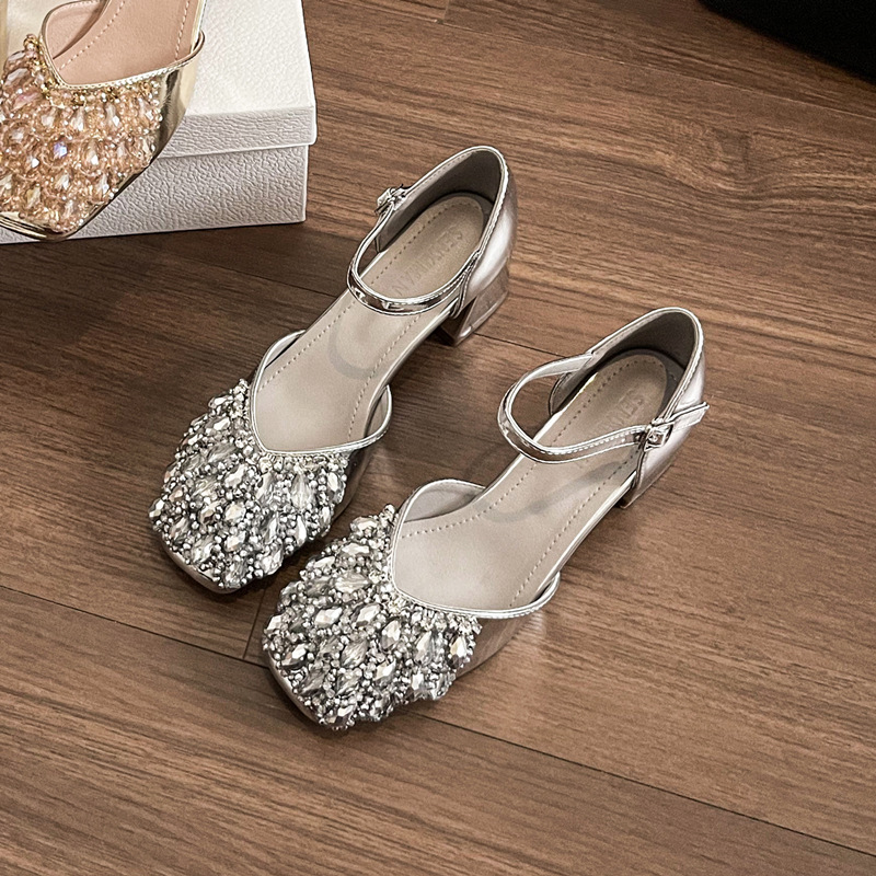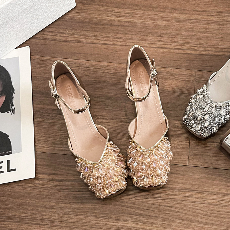 여성을위한 프랑스 라인 석 진주 중공 샌들 여름 요정 스타일 하이 엔드 두꺼운 굽 버클 싱글 신발 여성 중간 하이힐