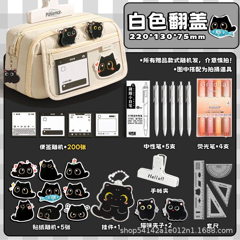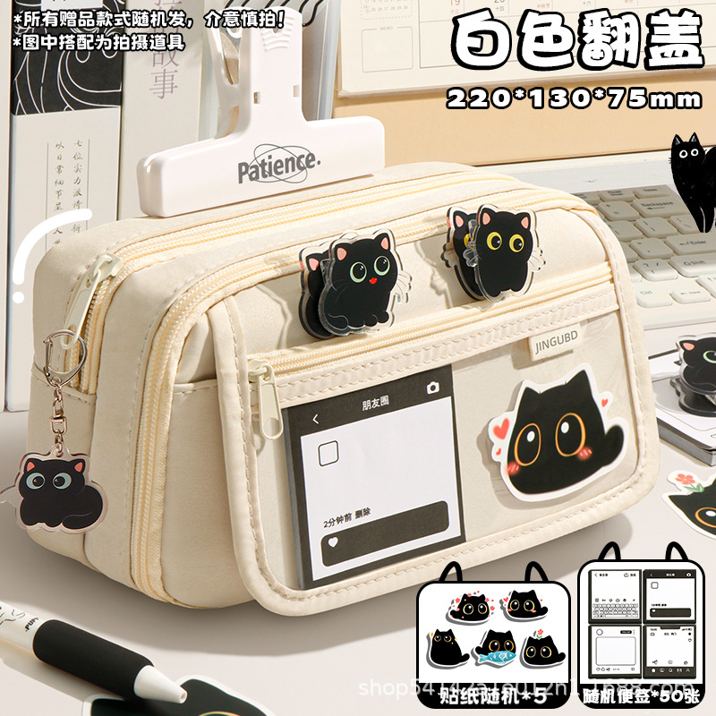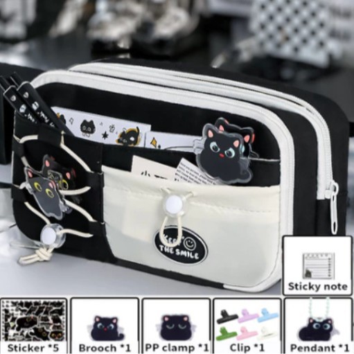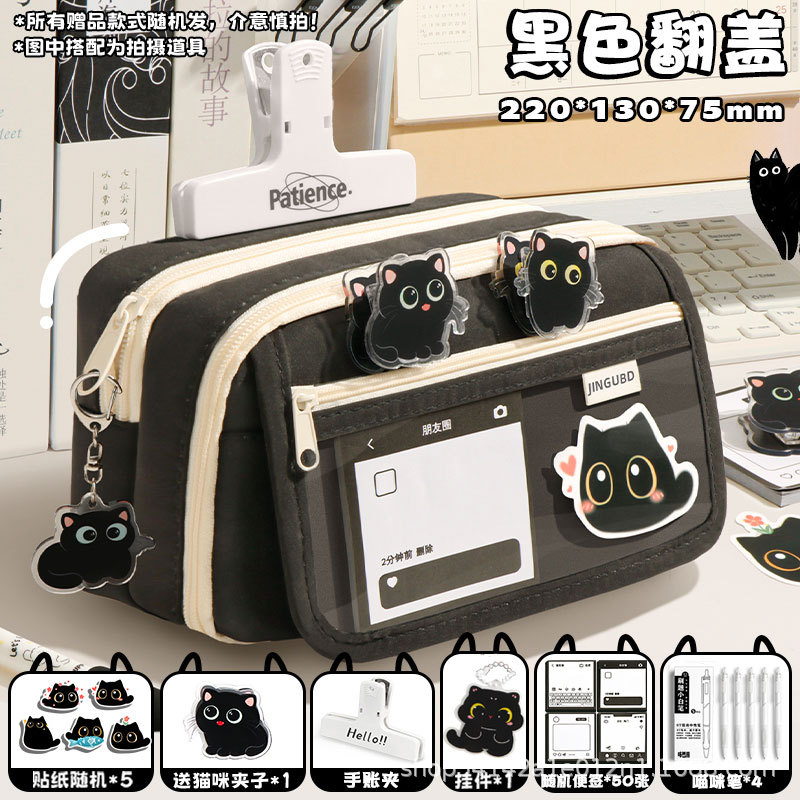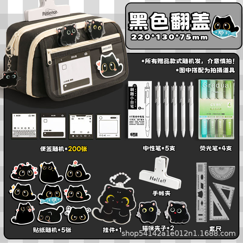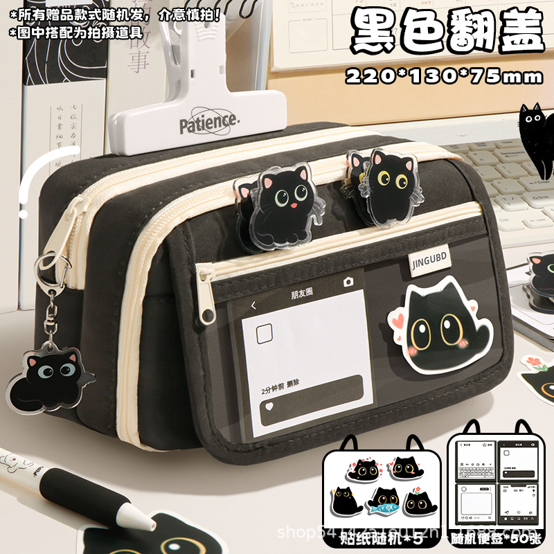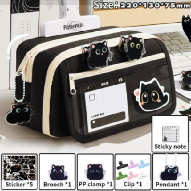 • 9겹 검정 검정 고양이 필통 + 스티커 + 포스트잇 + 펜 + PP 클립 + 키체인 + 대형 클립
