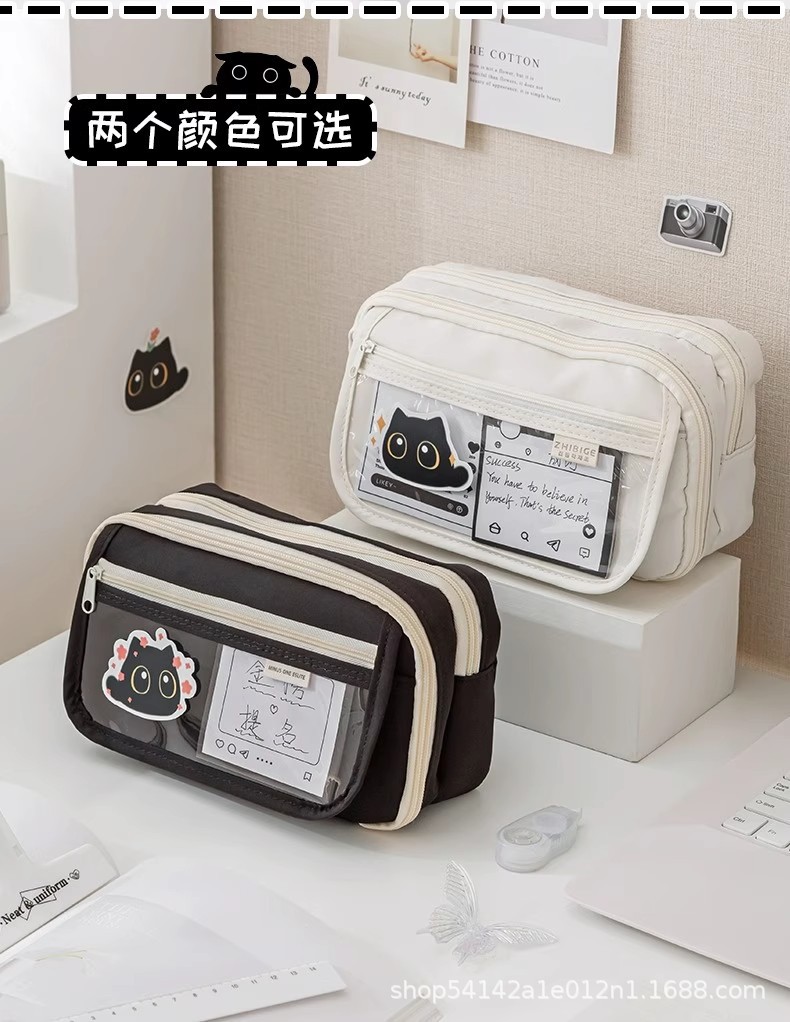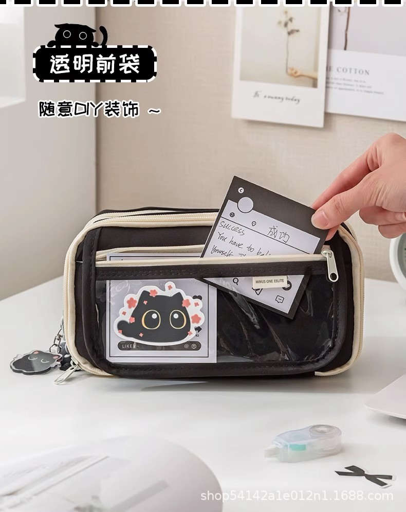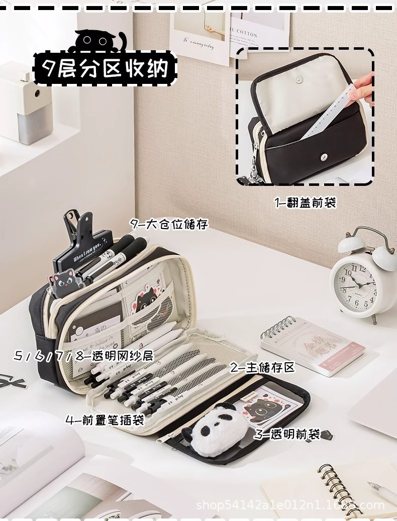 • 9겹 베이지 검은 고양이 필통 + 검은 고양이 액세서리 풀 세트