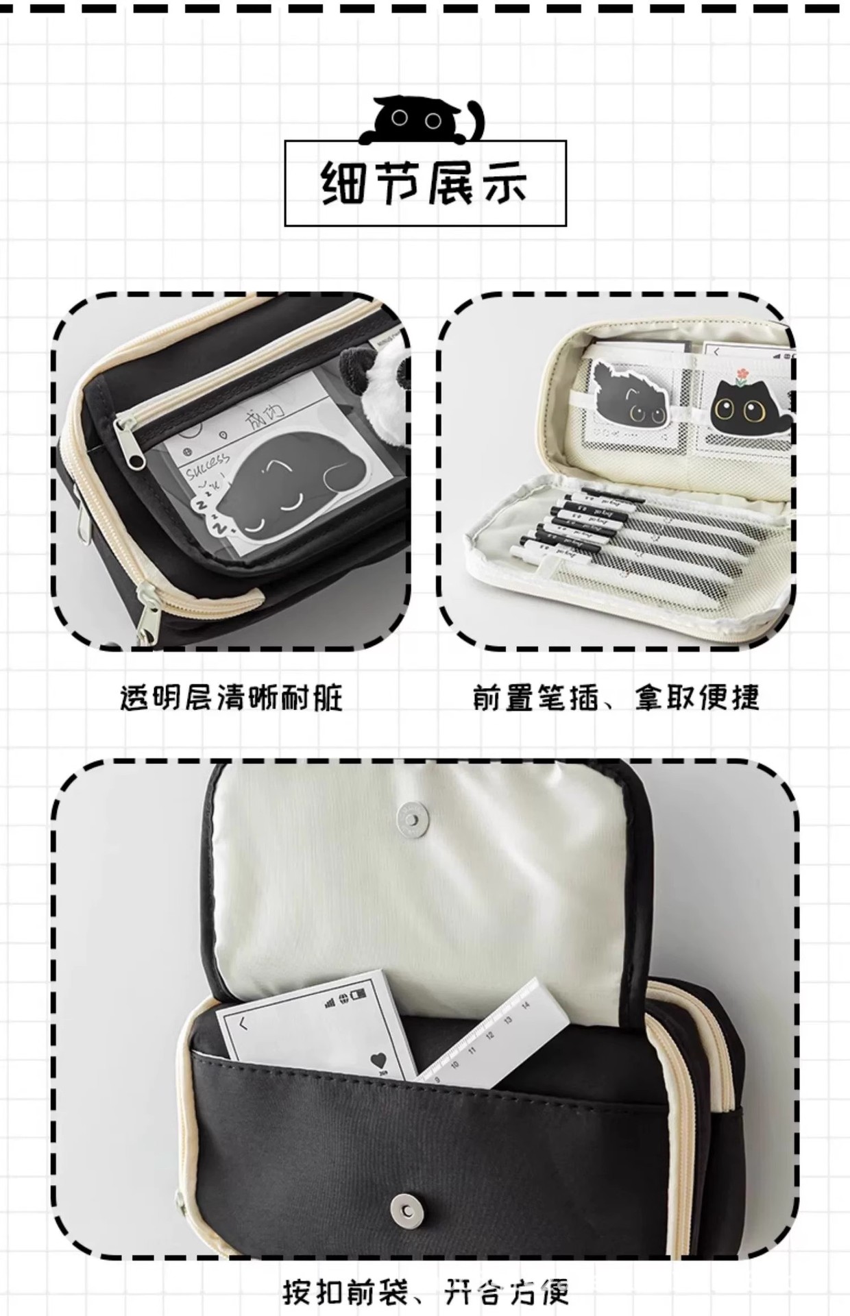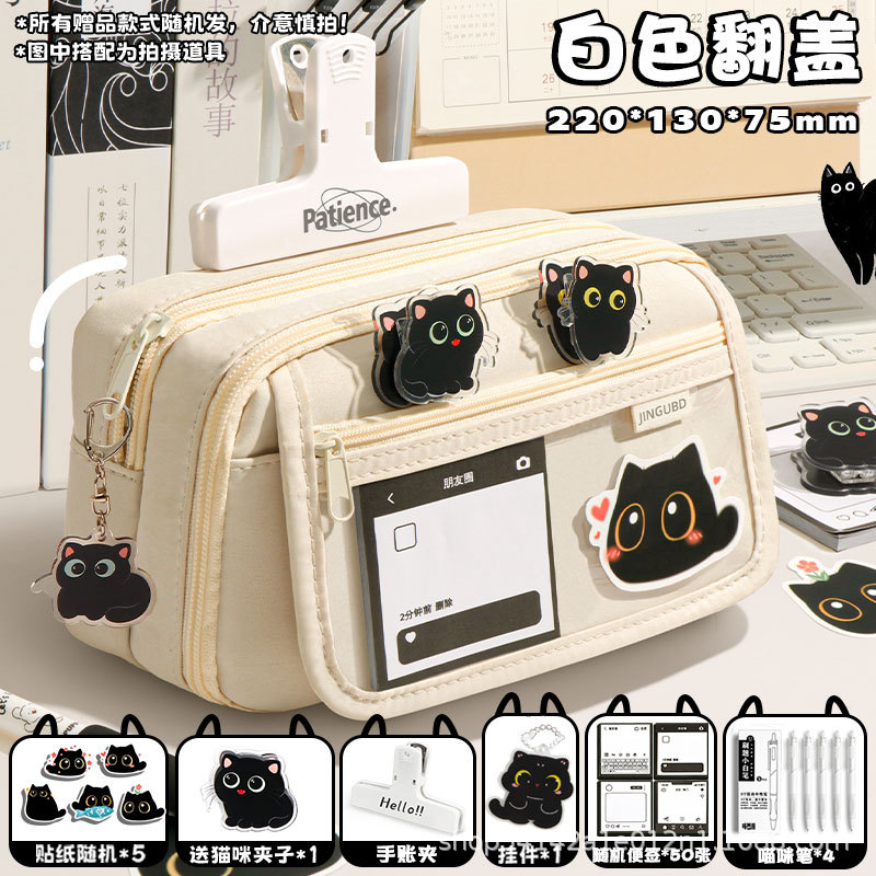 • 9단 베이지 검은 고양이 필통 + 스티커 + 포스트잇 + 펜 + PP 클립 + 키체인 + 대형 클립