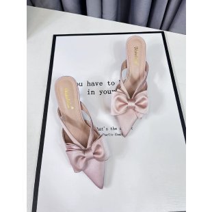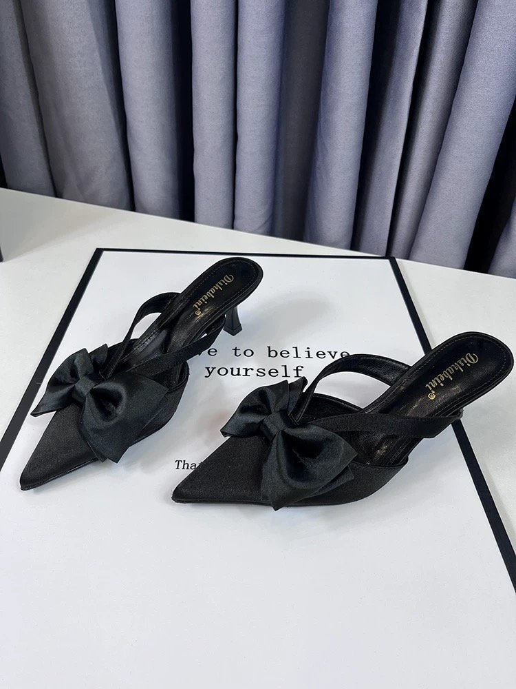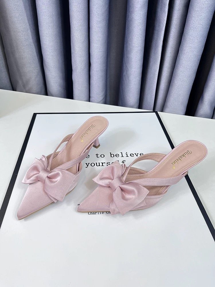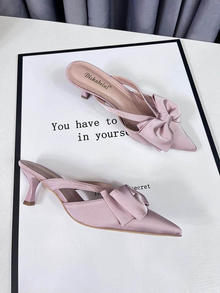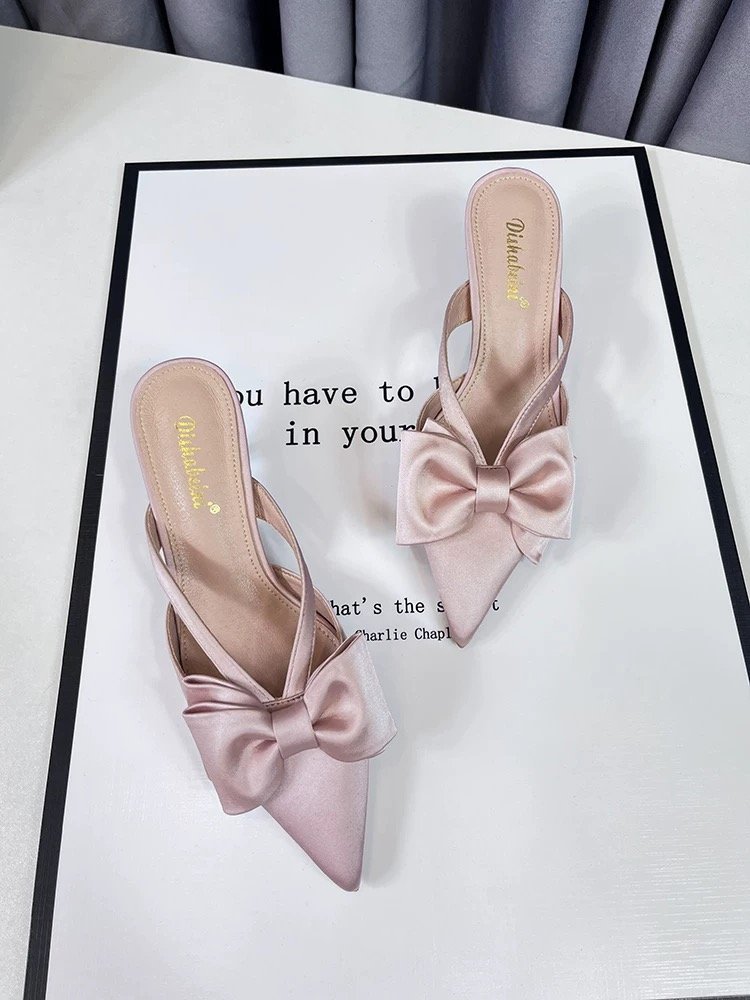 여성을위한 요정 스타일 핑크 샌들 2025 봄, 여름 프렌치 포인티드 보우 중공 하이힐 하프 발가락 슬리퍼