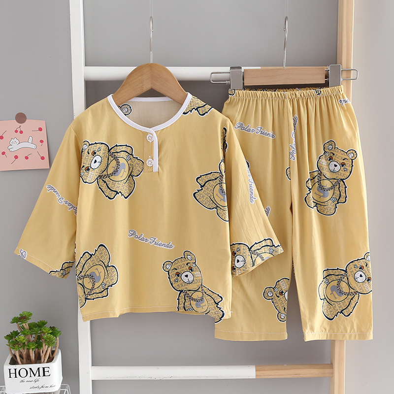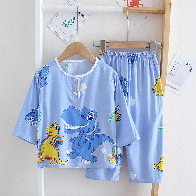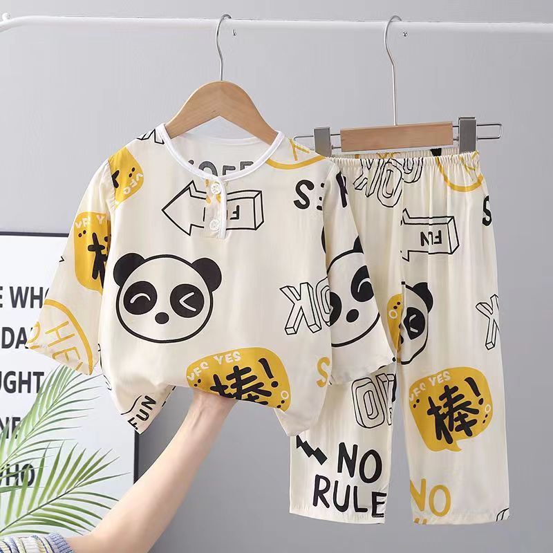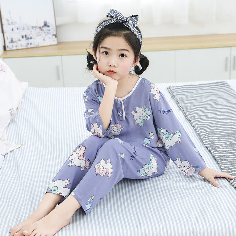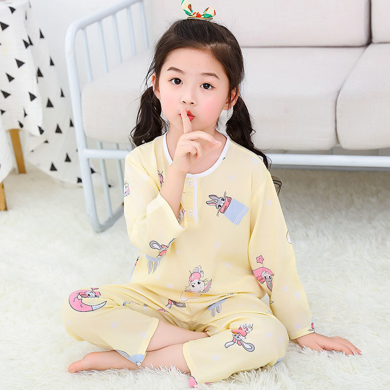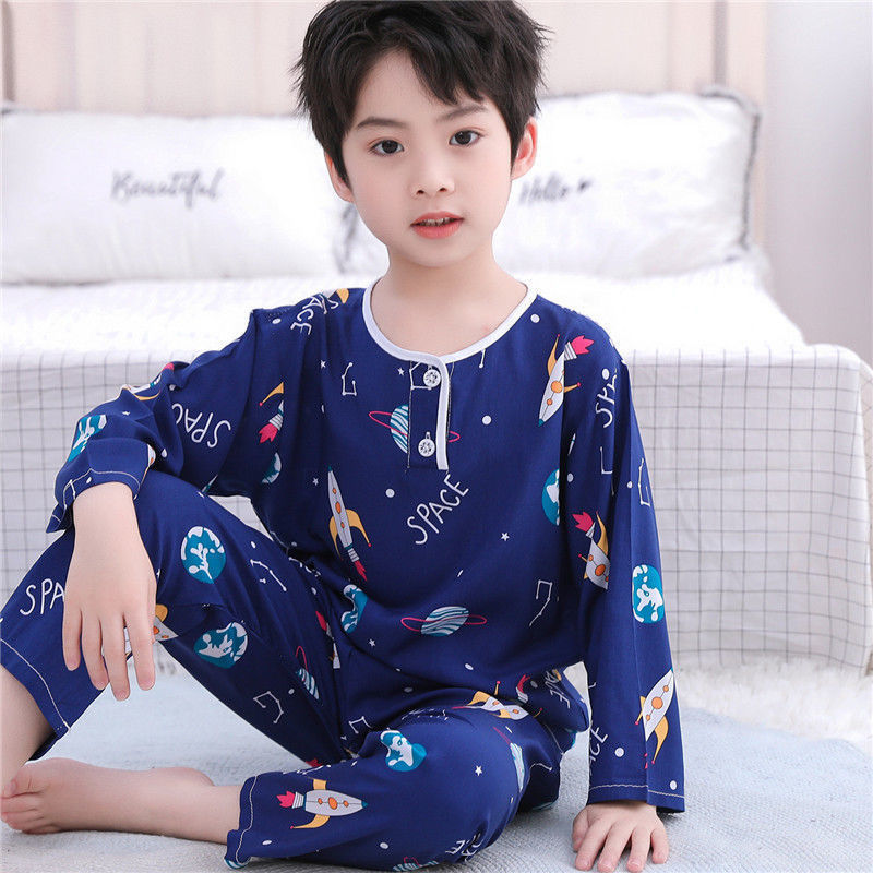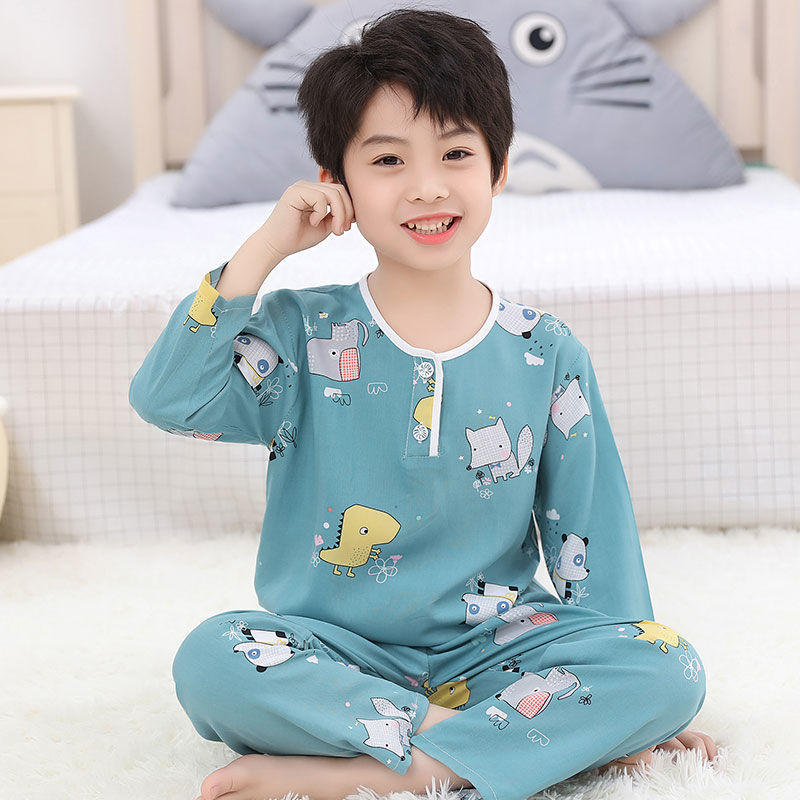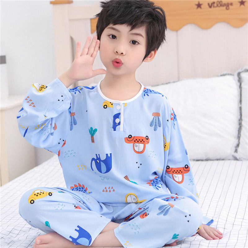 소년과 소녀를위한 여름 어린이 면화 실크 잠옷 아기 면화 실크 어린이 긴팔 얇은 중대형 어린이 에어컨 양복스토어 가기
