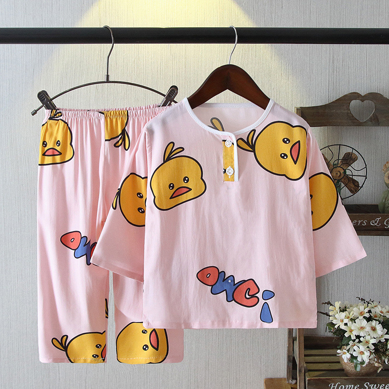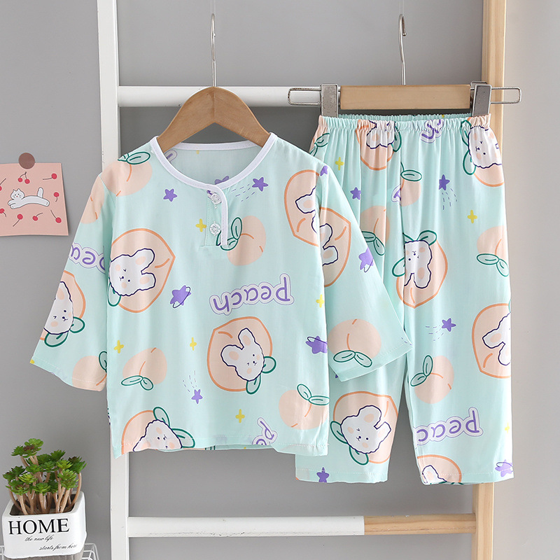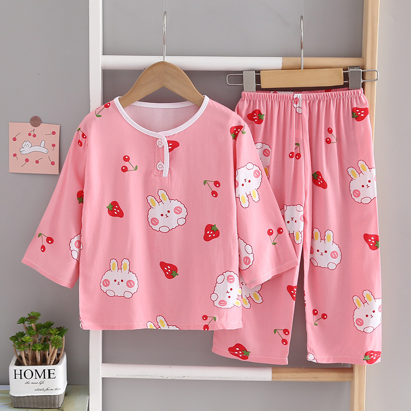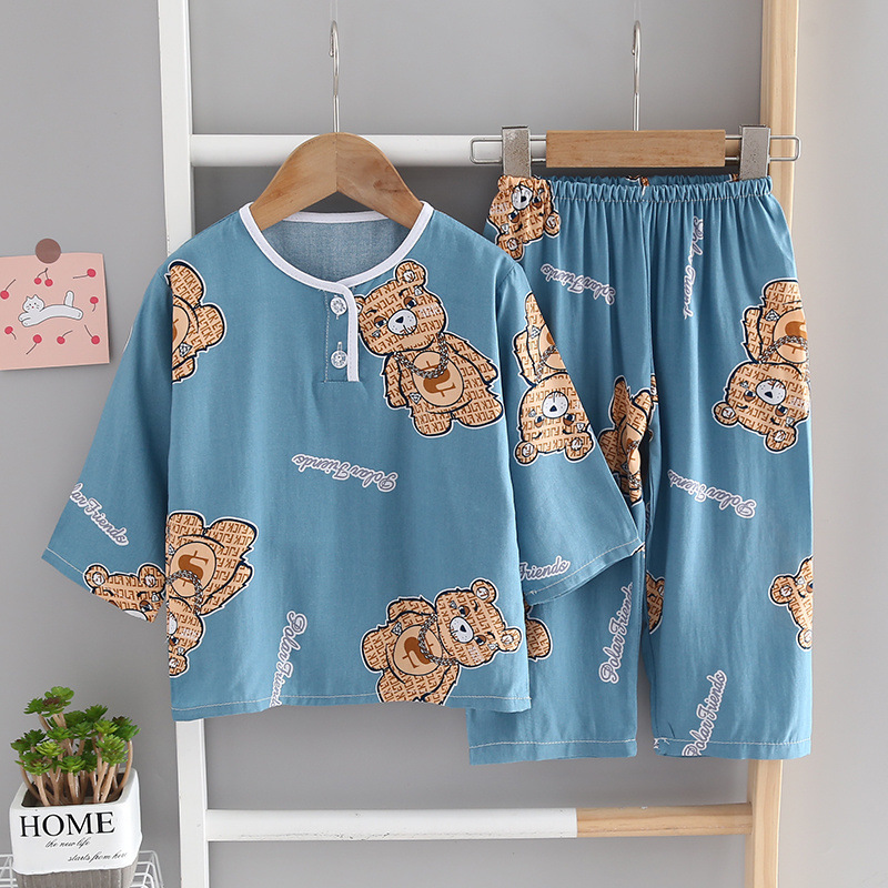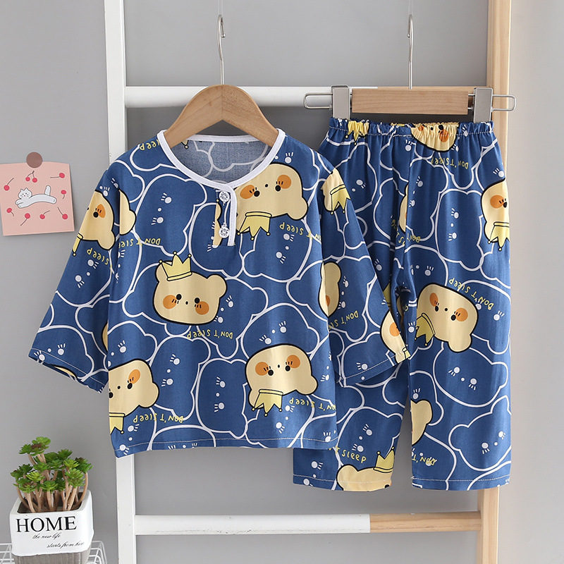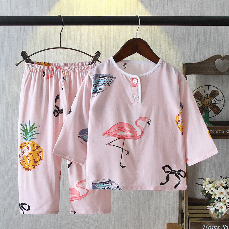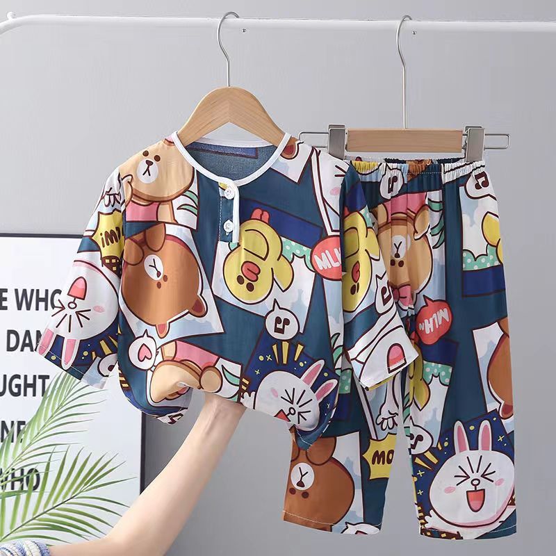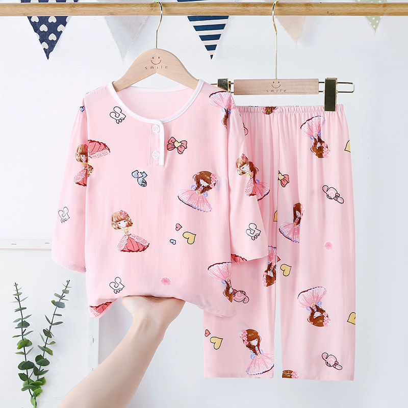 소년과 소녀를위한 여름 어린이 면화 실크 잠옷 아기 면화 실크 어린이 긴팔 얇은 중대형 어린이 에어컨 양복스토어 가기