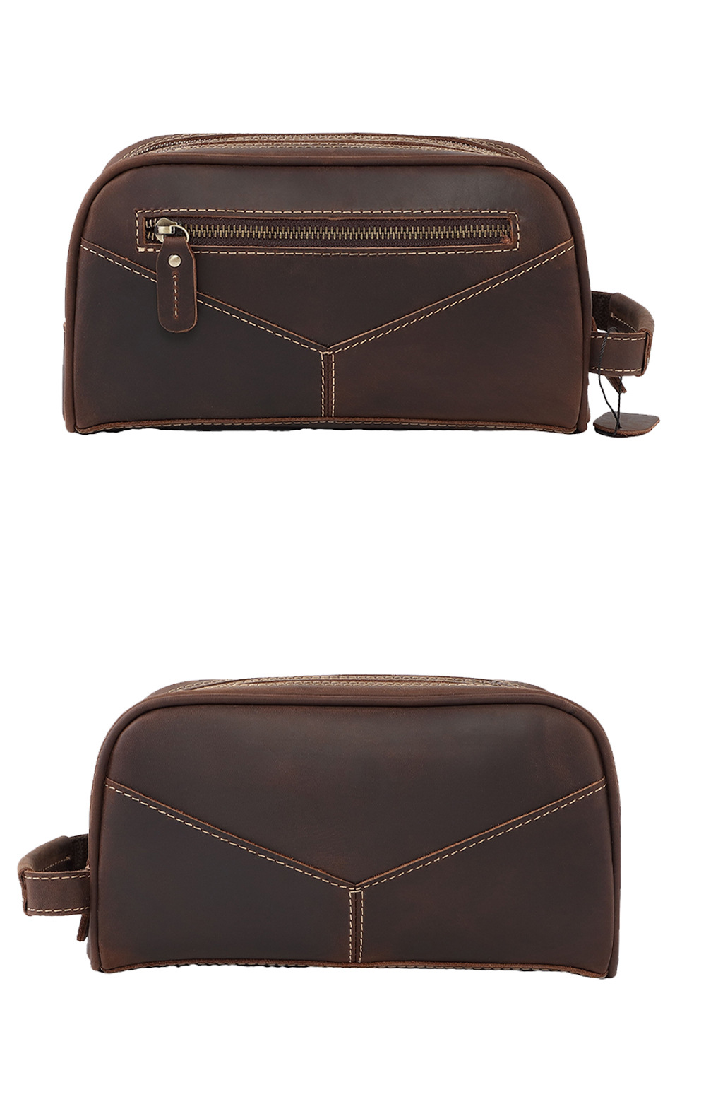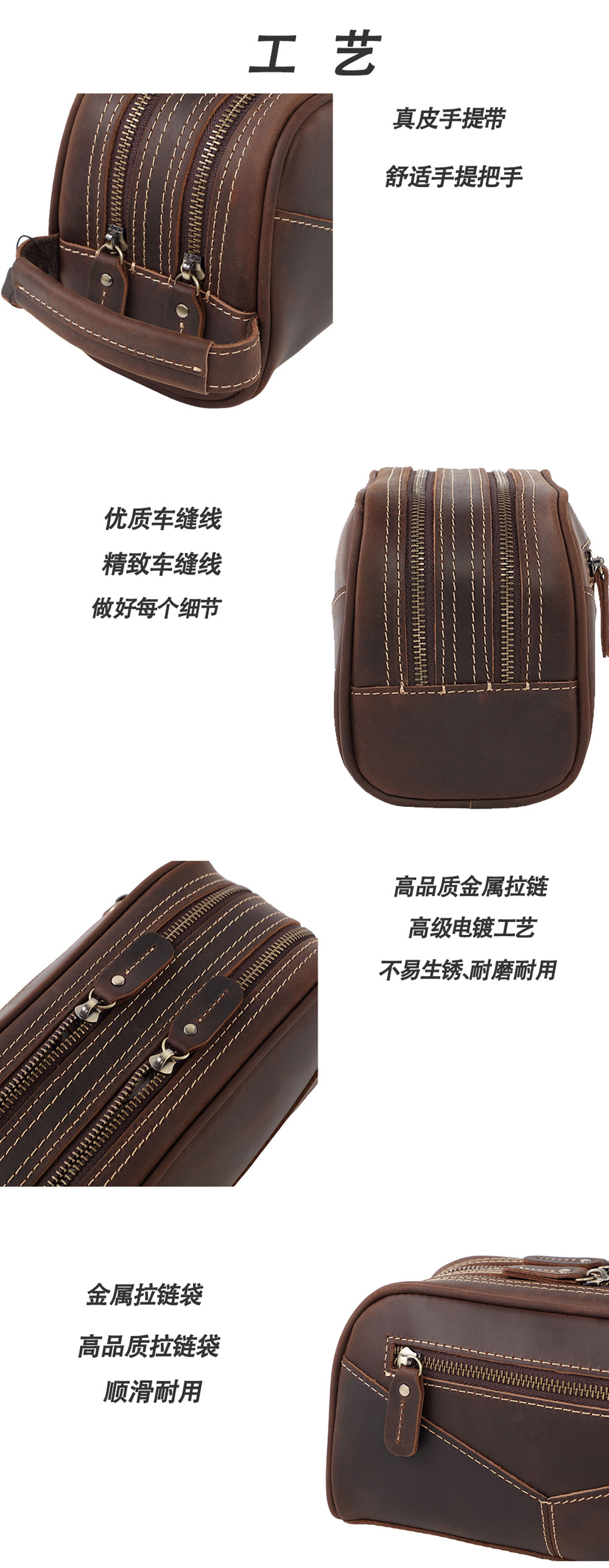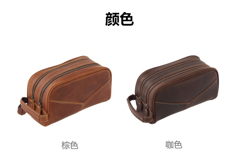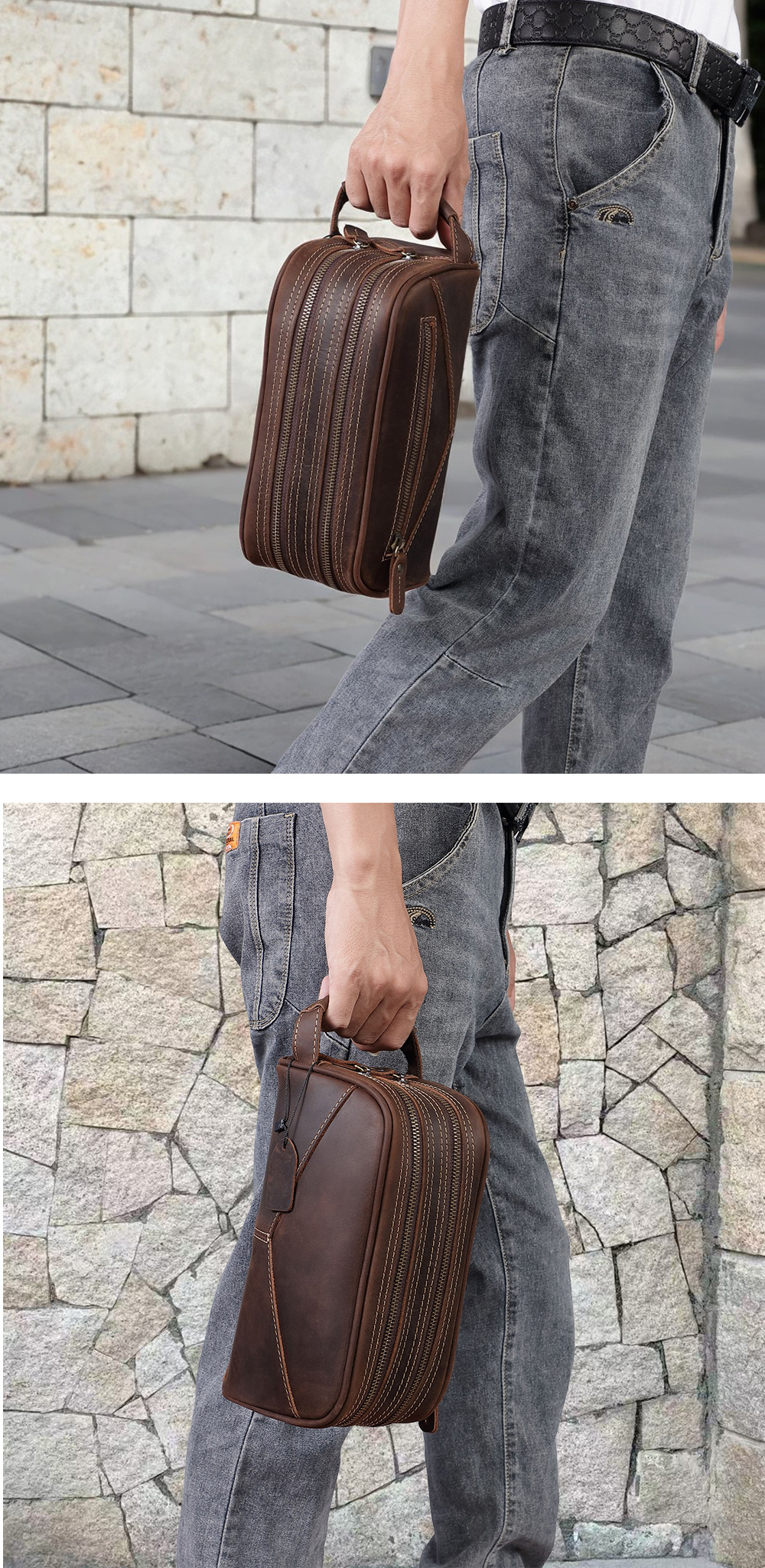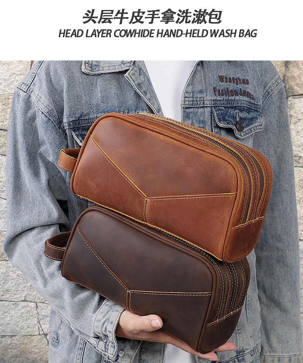 남성용 정품 가죽 세면도구 가방, 복고풍 크레이지 호스 가죽 여행용 수납 가방, 1층 소가죽 더블 지퍼 핸드백 Amazon