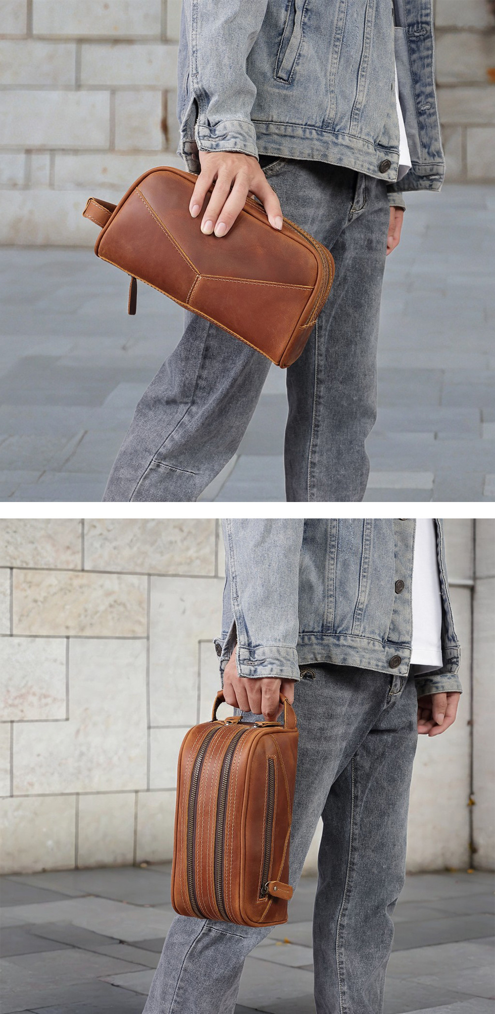 남성용 정품 가죽 세면도구 가방, 복고풍 크레이지 호스 가죽 여행용 수납 가방, 1층 소가죽 더블 지퍼 핸드백 Amazon스토어 가기