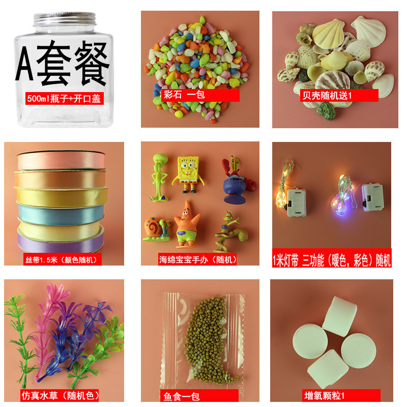 플라스틱 사각형 betta 탱크, 버블 탱크, 물고기 생태 마이크로 풍경 데스크탑 수조, 재료 전체 세트, 야시장 매점 유물