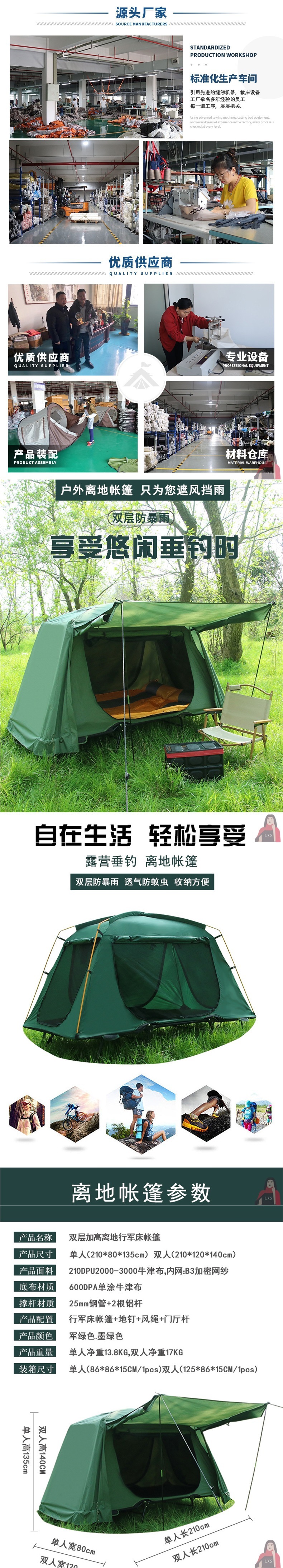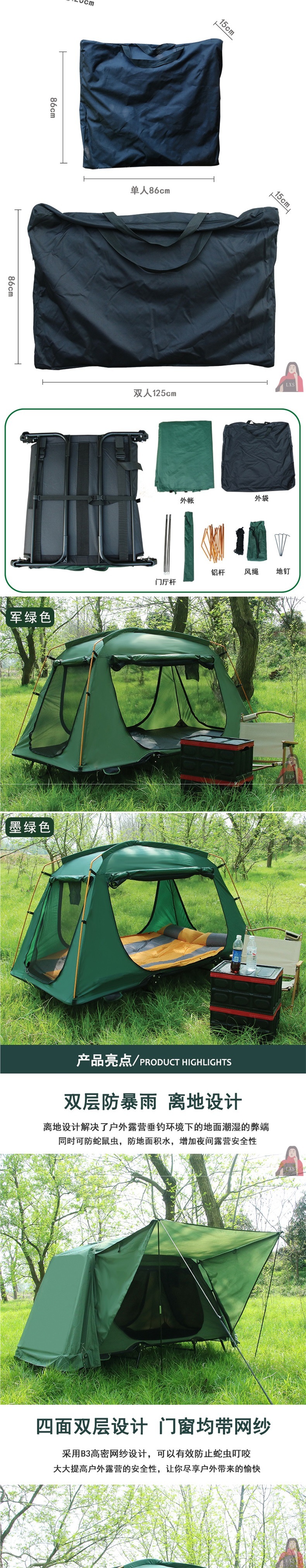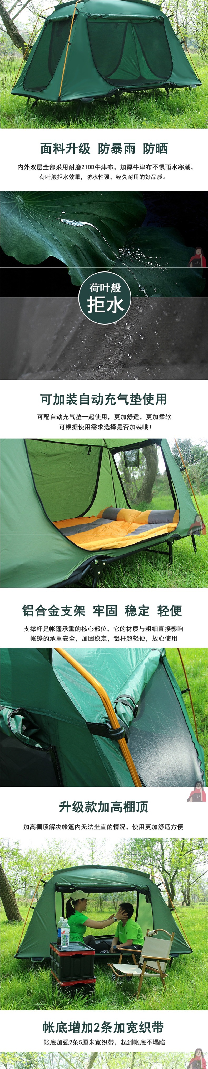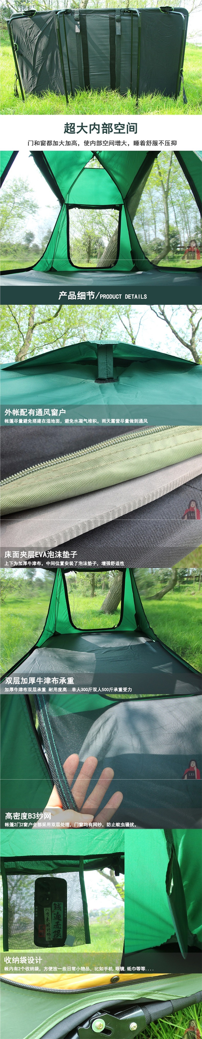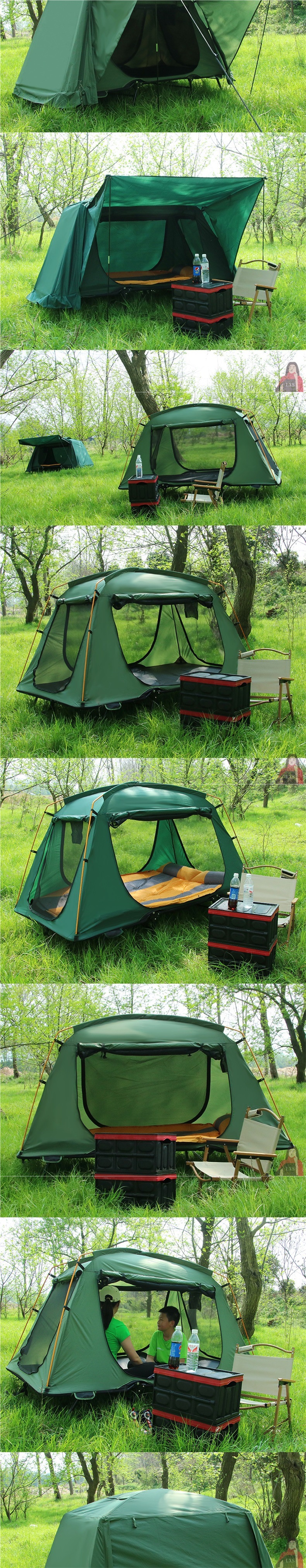 • 짙은 녹색(이중 두꺼운 옥스포드 천, 이중 지상 텐트 + 이중 풍선 매트리스)