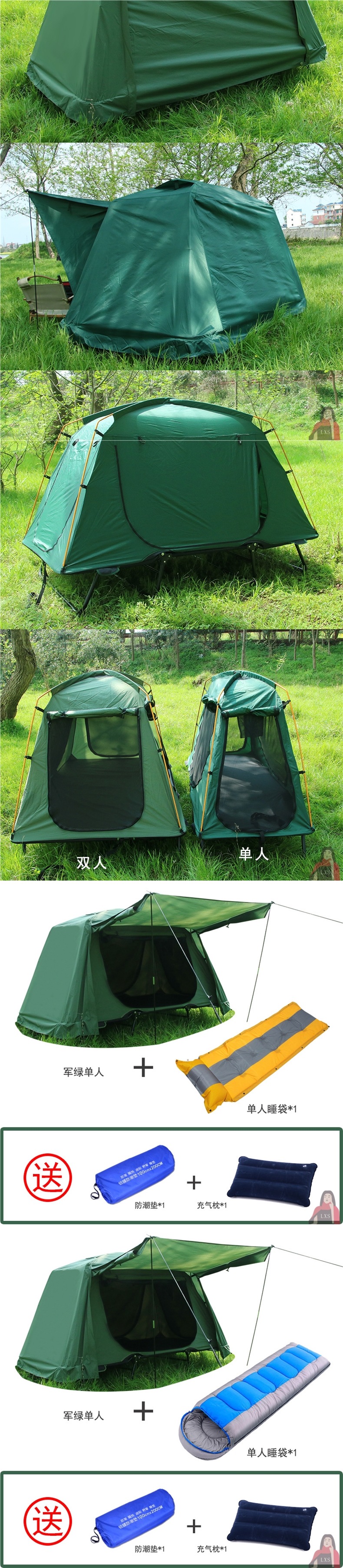 • 밀리터리 그린(이중 두꺼운 옥스포드 천), 1인용 지상 텐트 + 1인용 풍선 매트리스