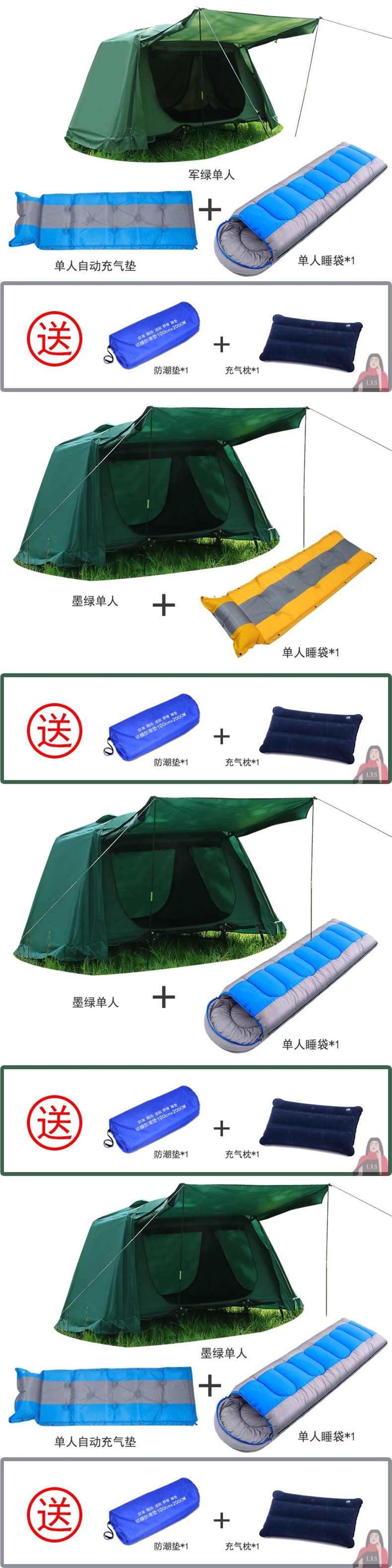 • 짙은 녹색(이중 두꺼운 옥스포드 천, 이중 지상 텐트 + 이중 풍선 매트 + 침낭 2개)