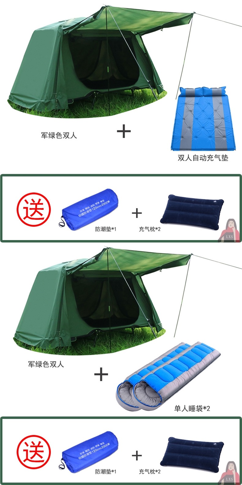 • 밀리터리 그린(이중 두꺼운 옥스포드 천), 이중 지상 텐트 + 이중 공기주입식 매트 + 침낭 2개