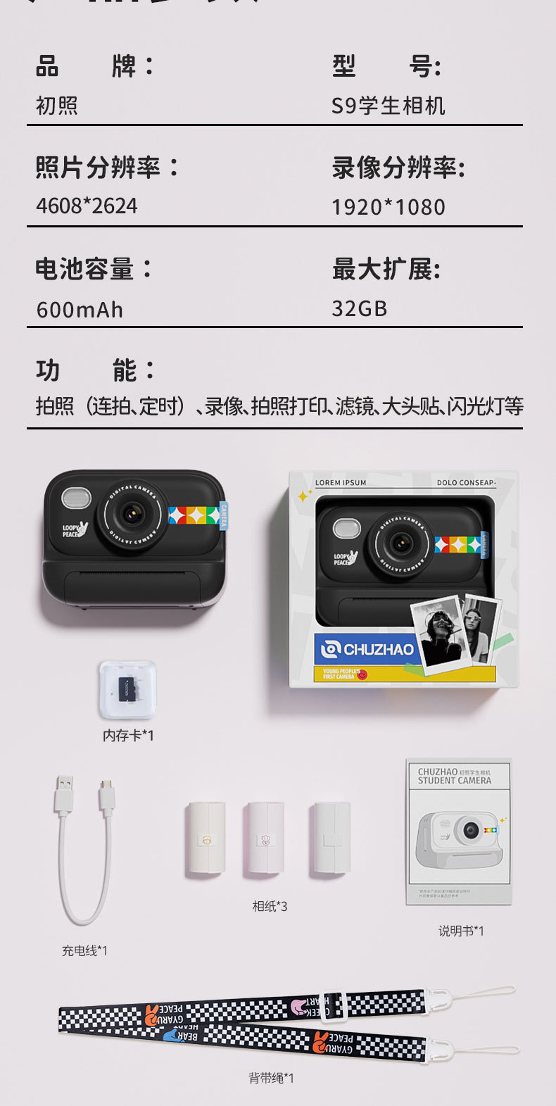• 검정색 모델 2.0inch은 사진을 찍고 인쇄할 수 있습니다. - 32G 메모리(인쇄 용지 3롤 포함)