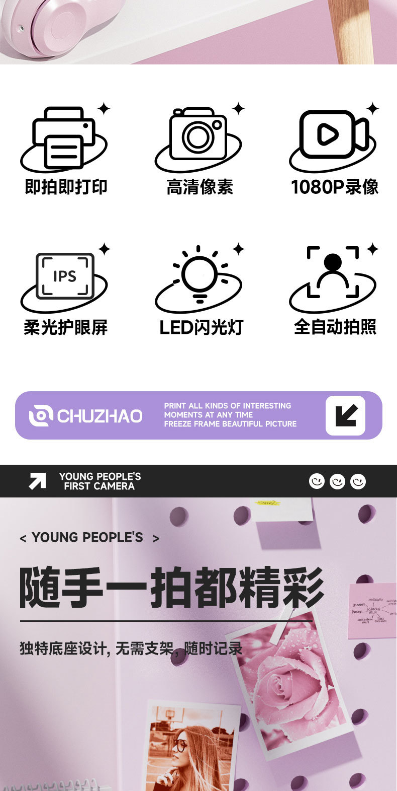 • 보라색 2.0inch 사진 촬영 및 인쇄 가능 용지 - 64G 메모리(인쇄 용지 3롤 포함)