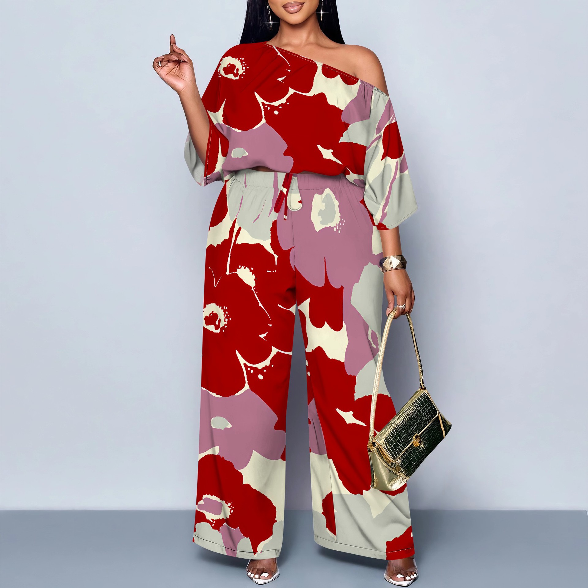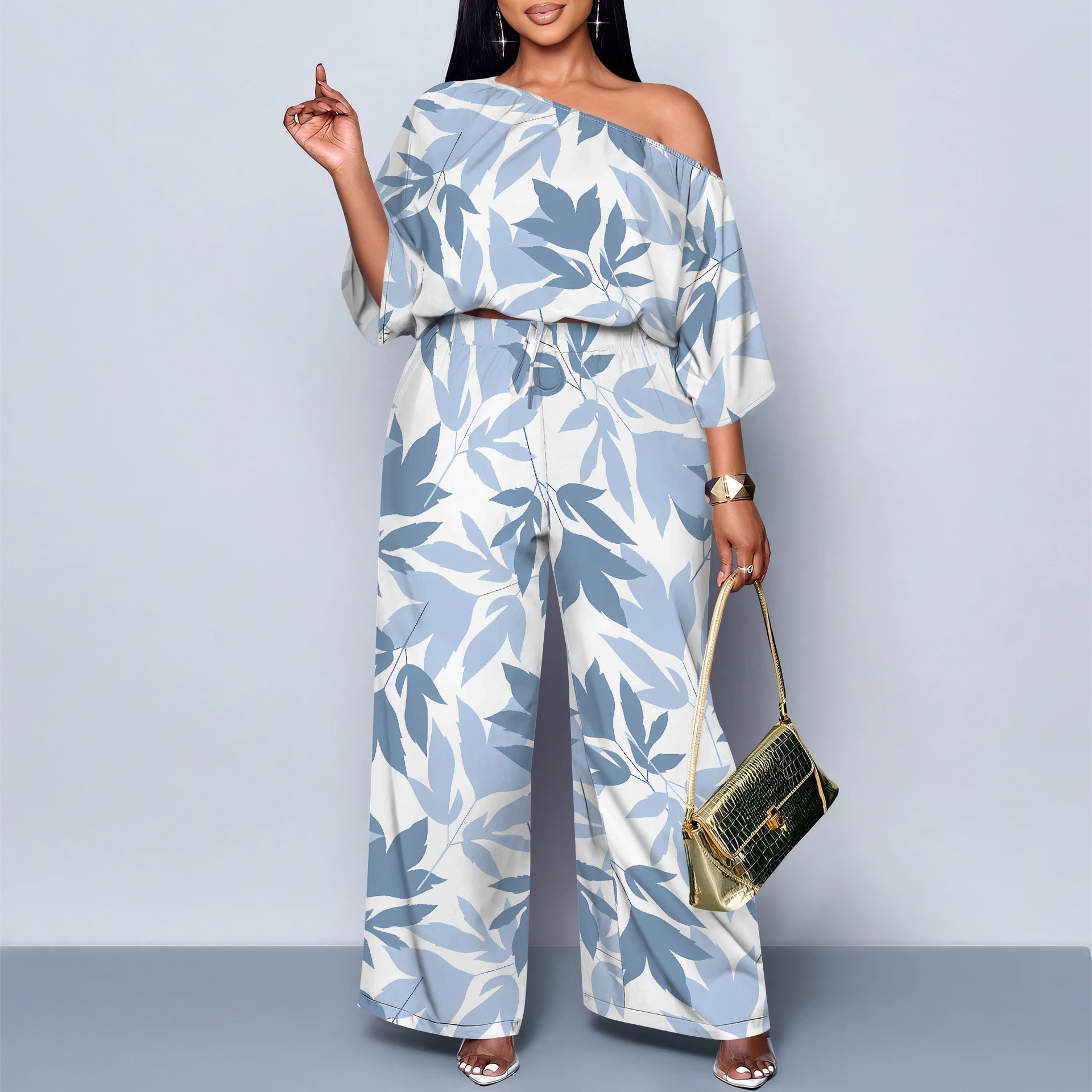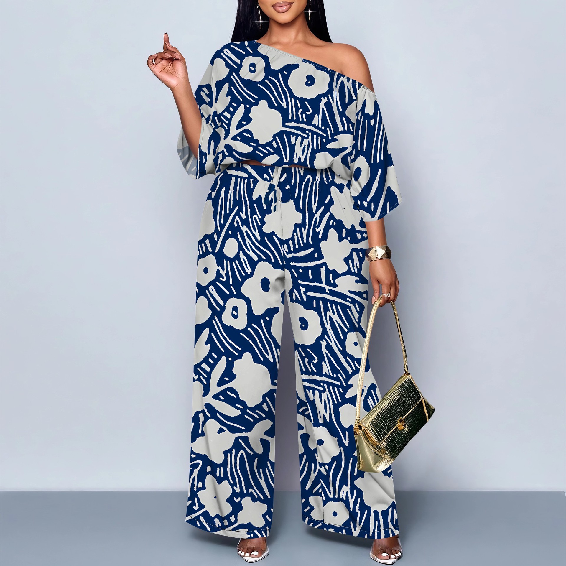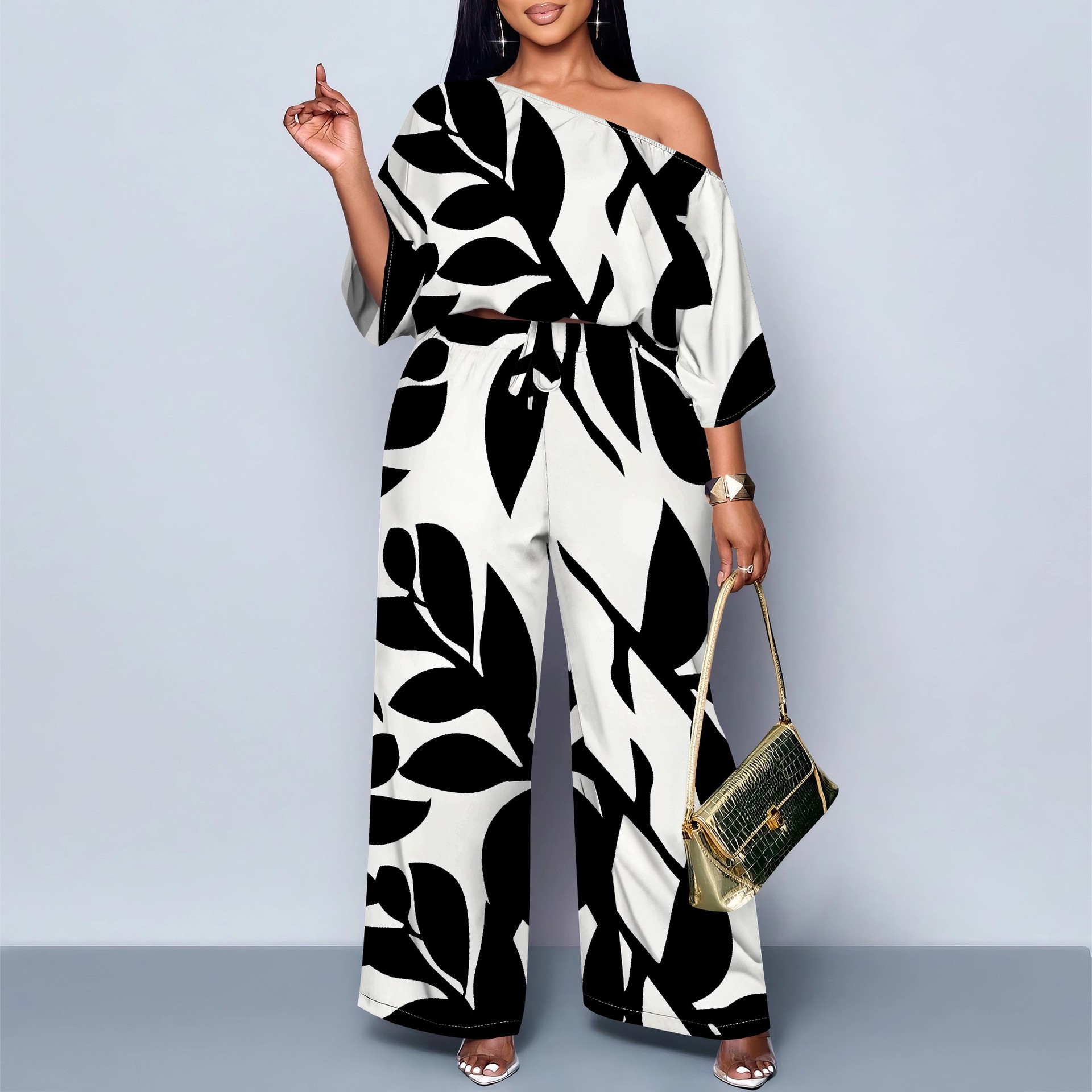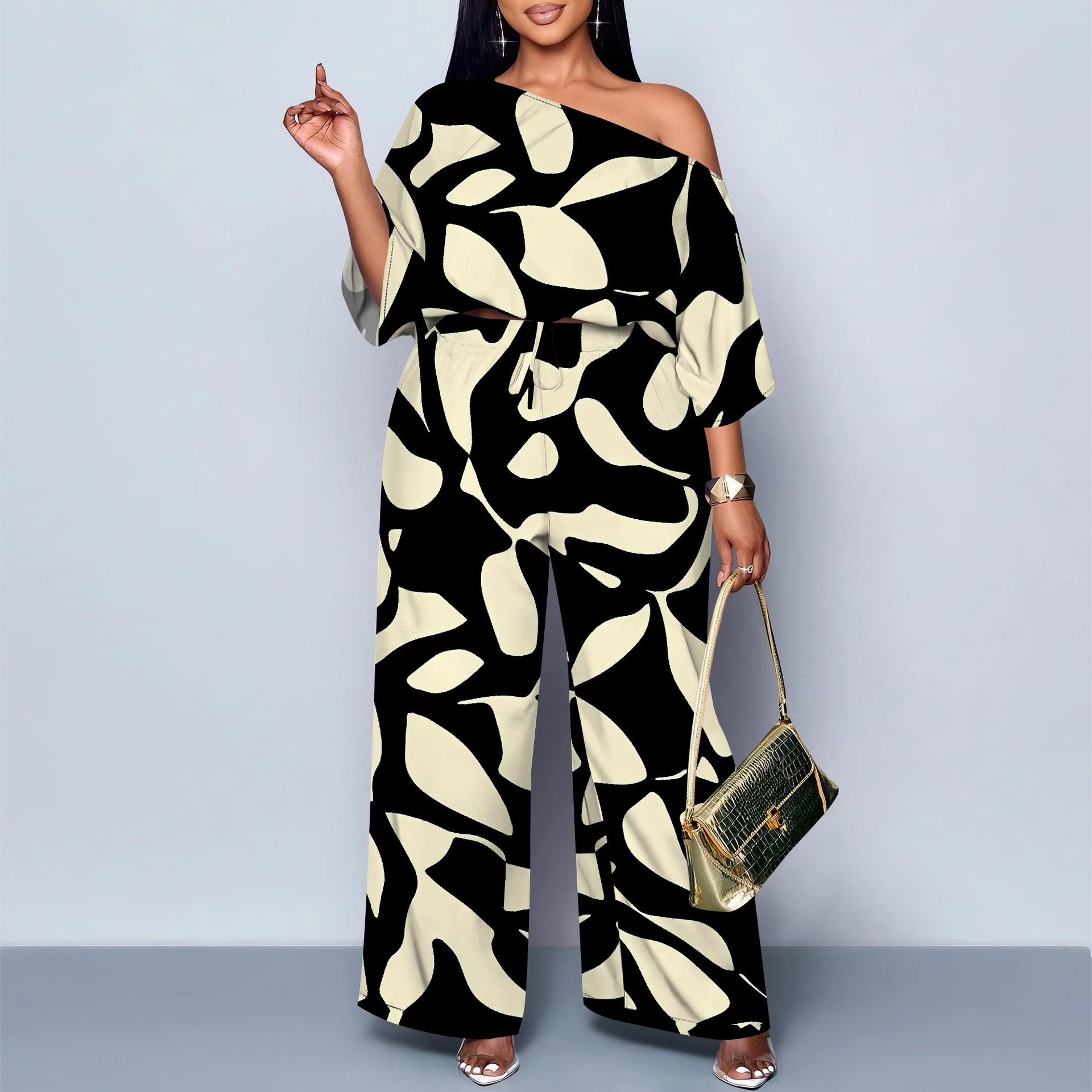 아마존 베스트셀러 유럽 및 미국 국경 간 여성 의류 기질 통근 캐주얼 프린트 블랙 슬로프 숄더 투피스 세트 MH962