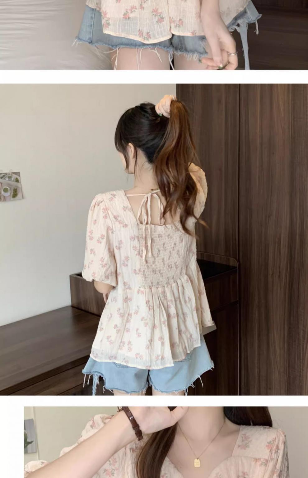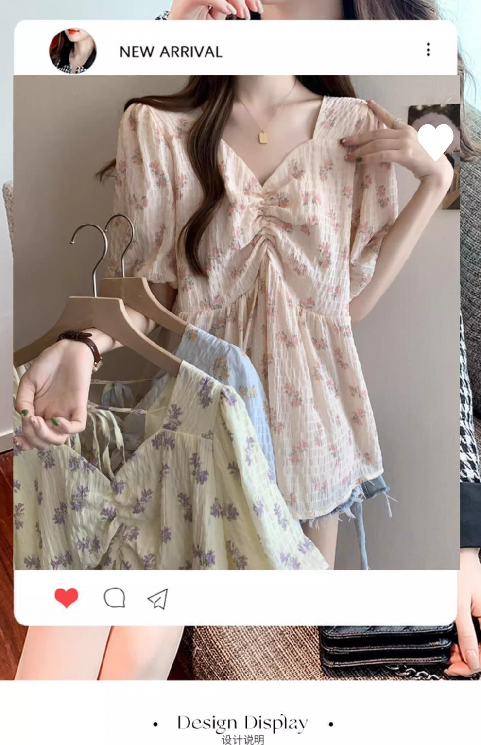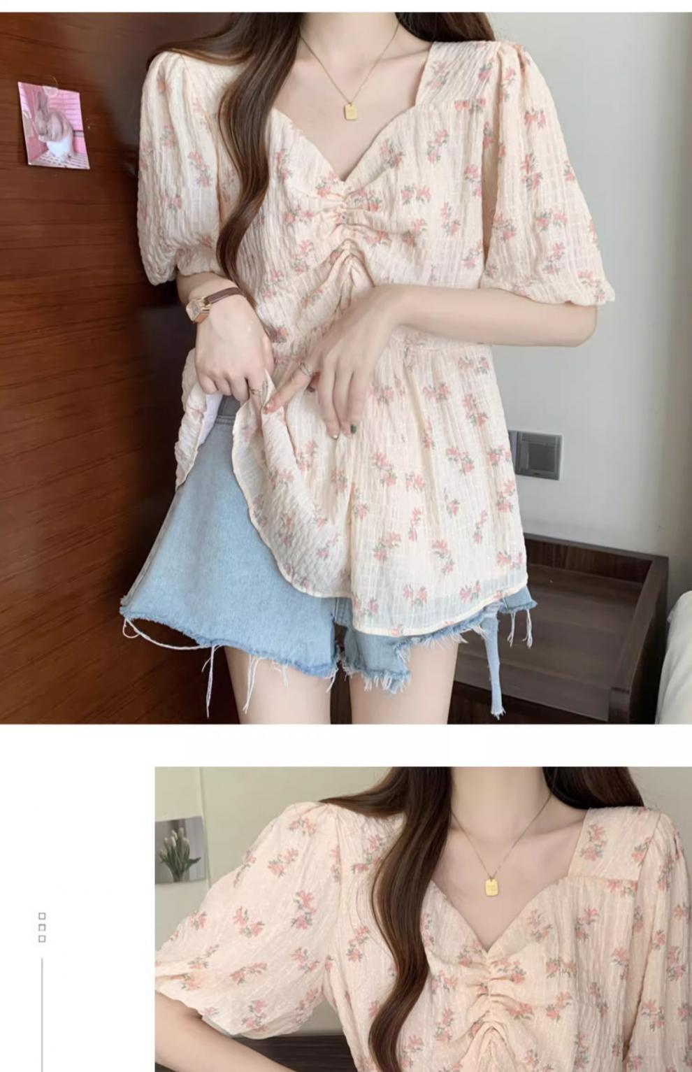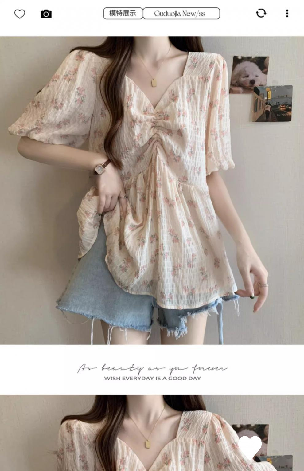 프렌치 유니크 스퀘어 넥 플로럴 쉬폰 반팔 셔츠 팻 커버 벨리 탑스토어 가기
