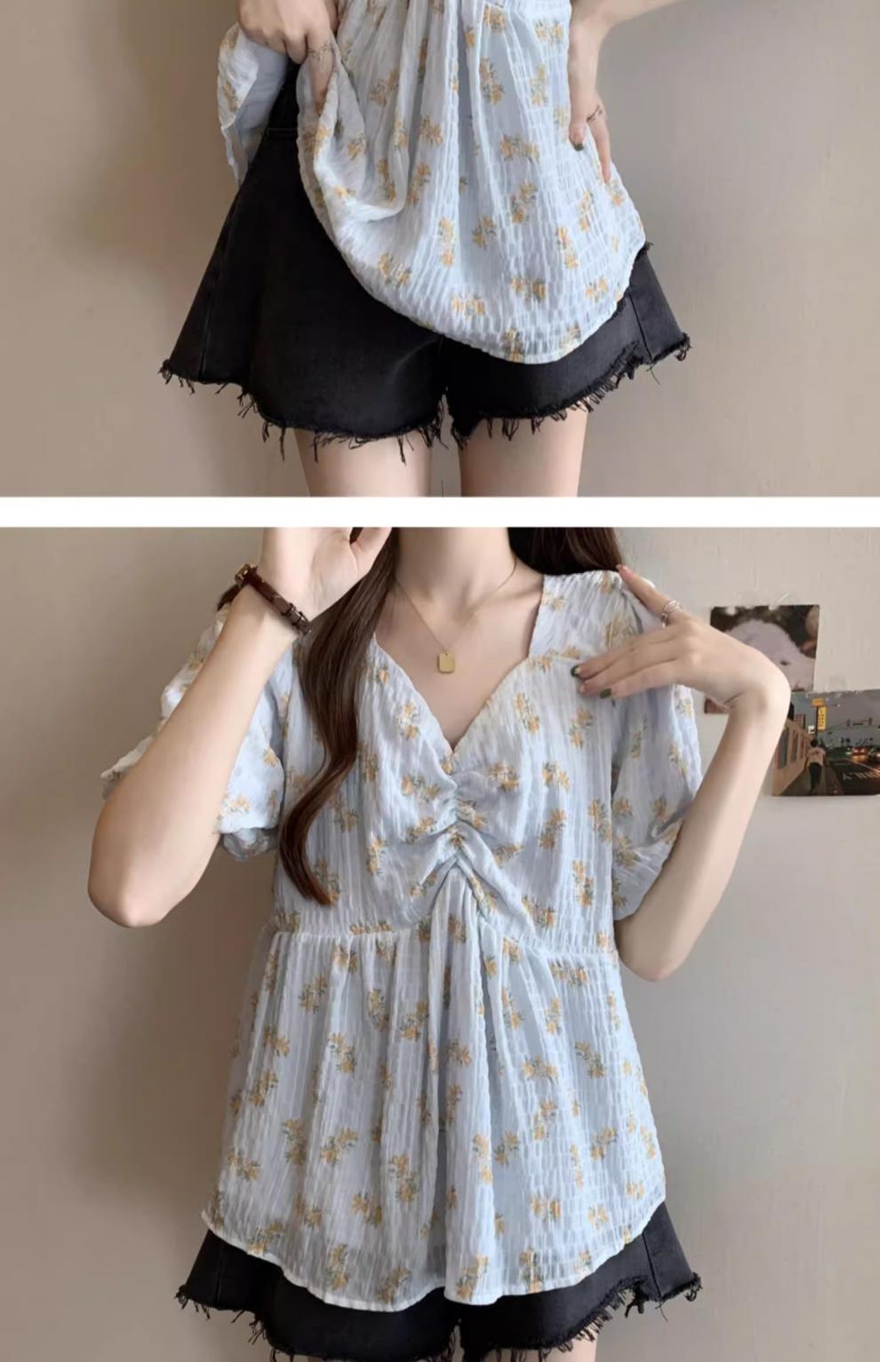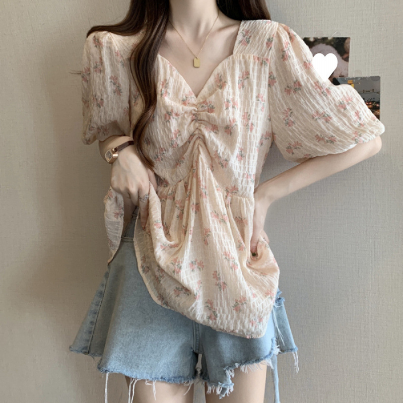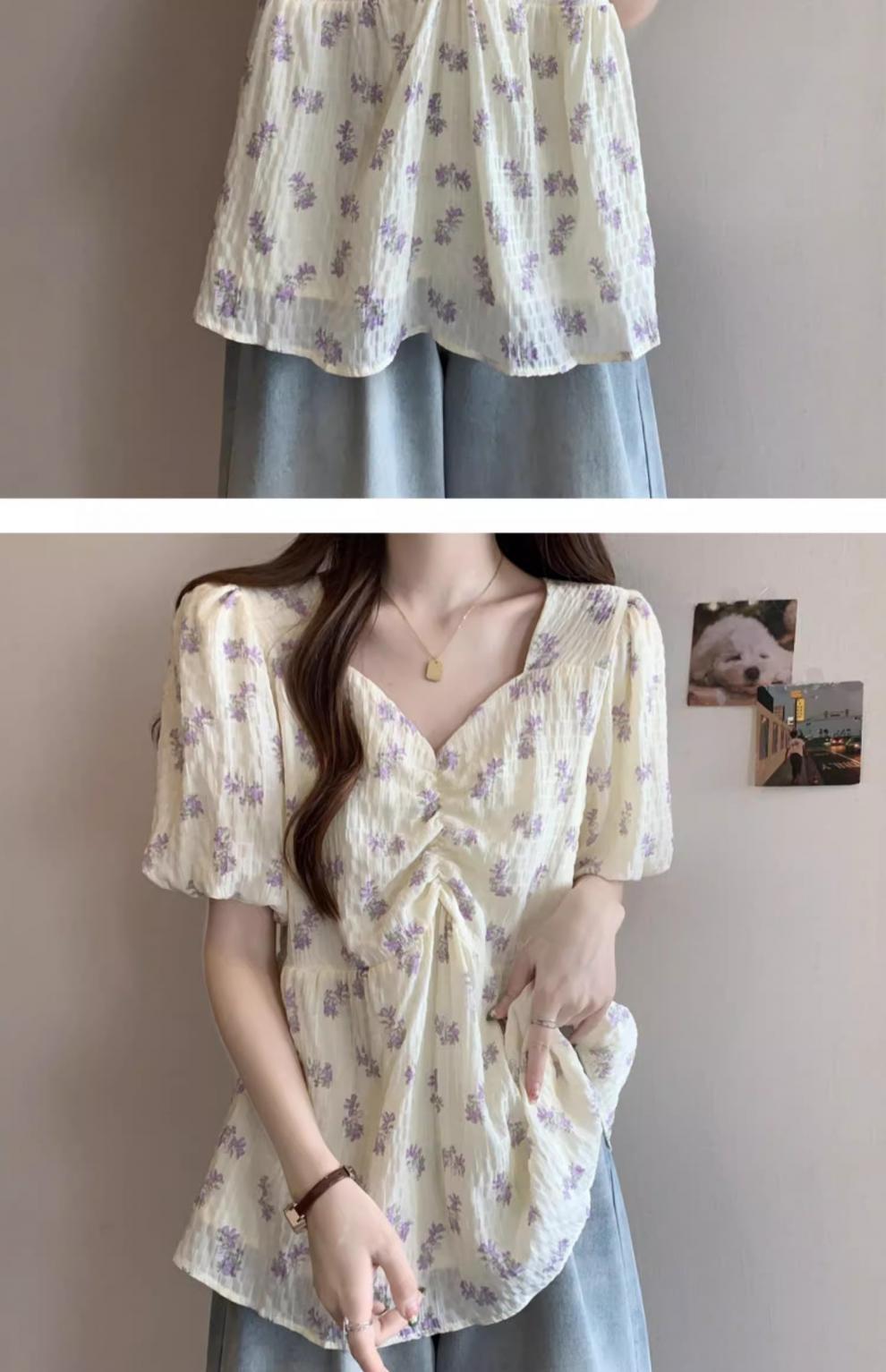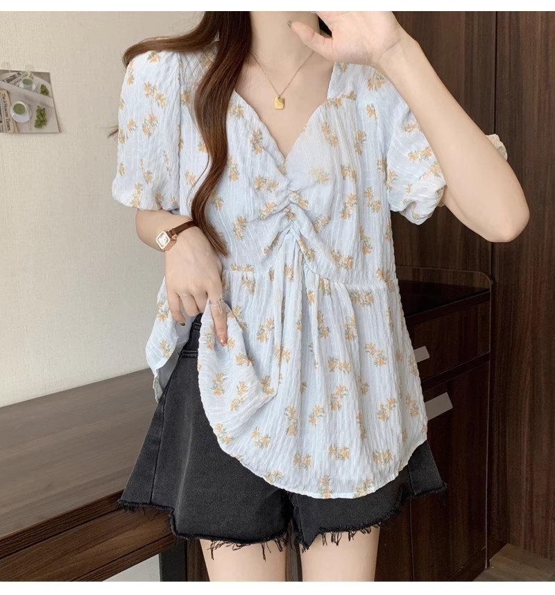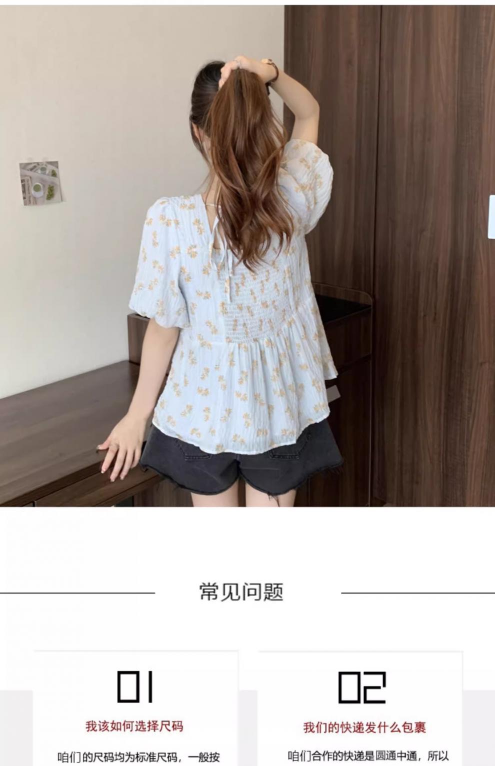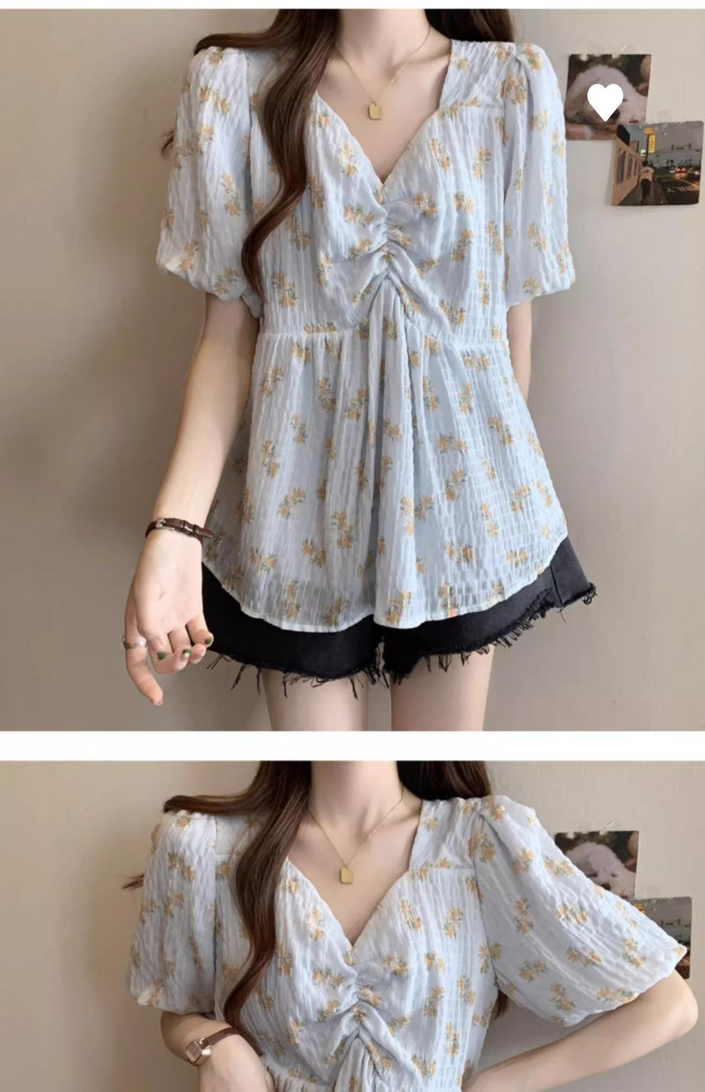 프렌치 유니크 스퀘어 넥 플로럴 쉬폰 반팔 셔츠 팻 커버 벨리 탑스토어 가기