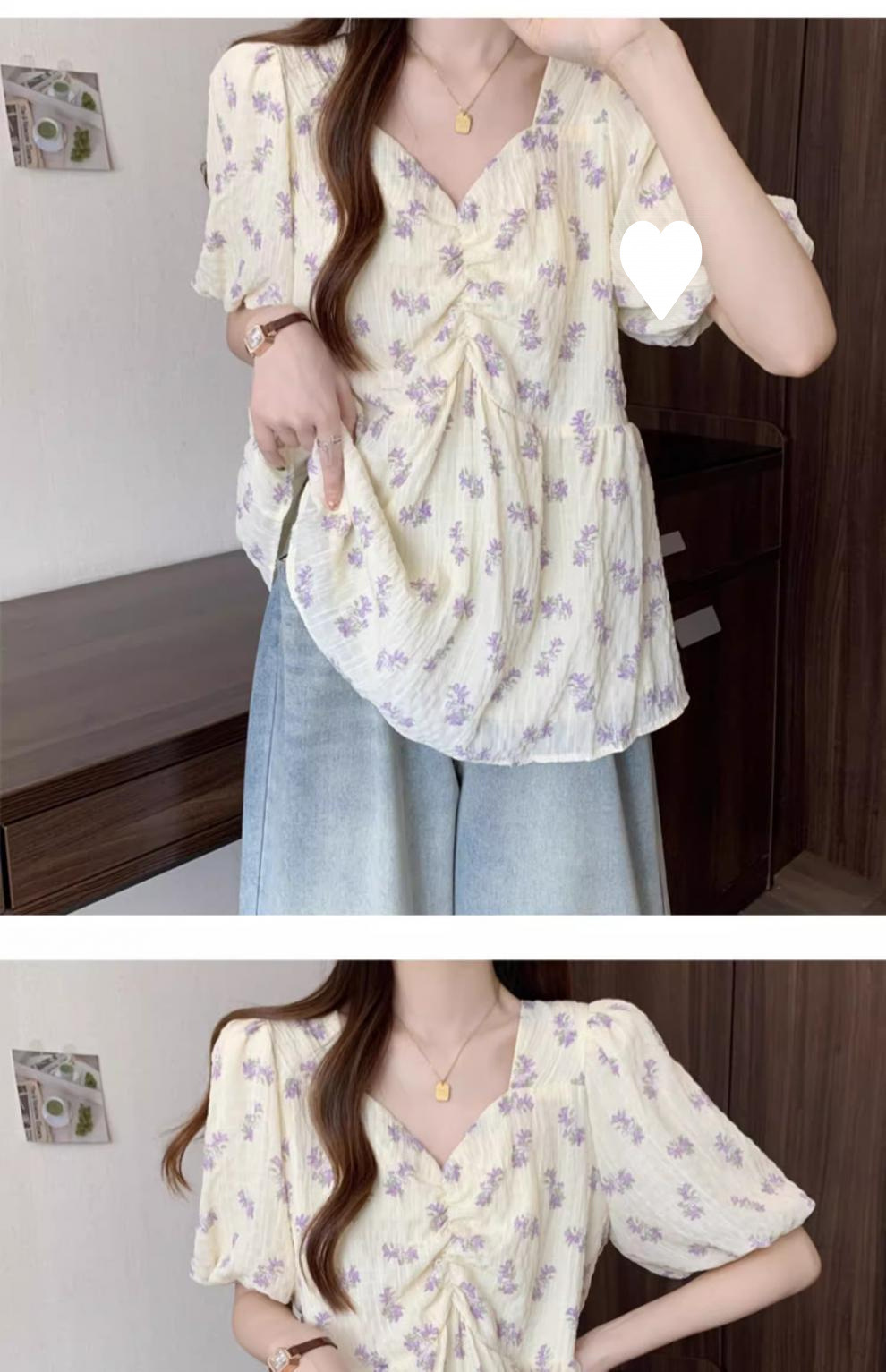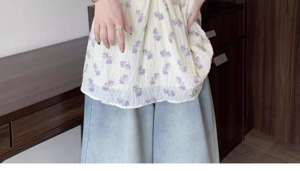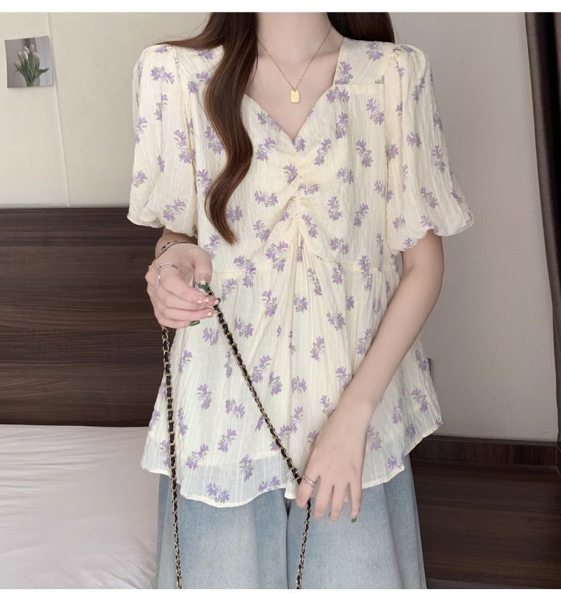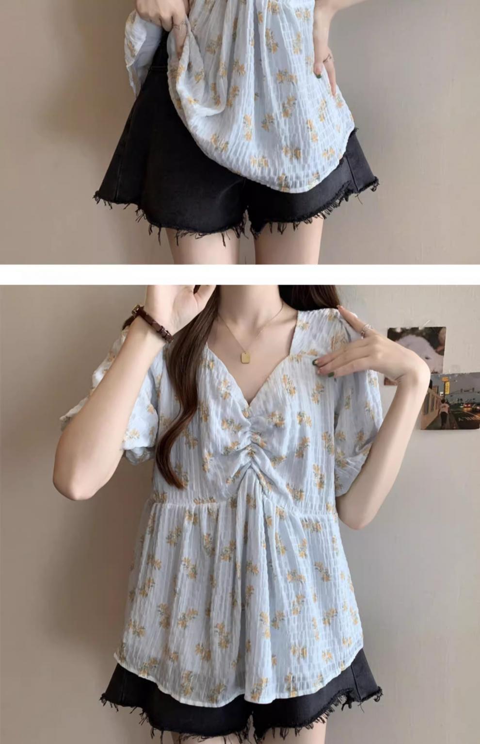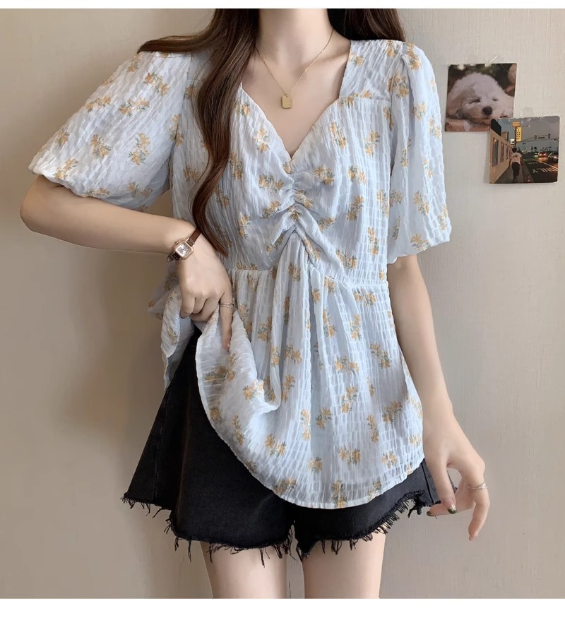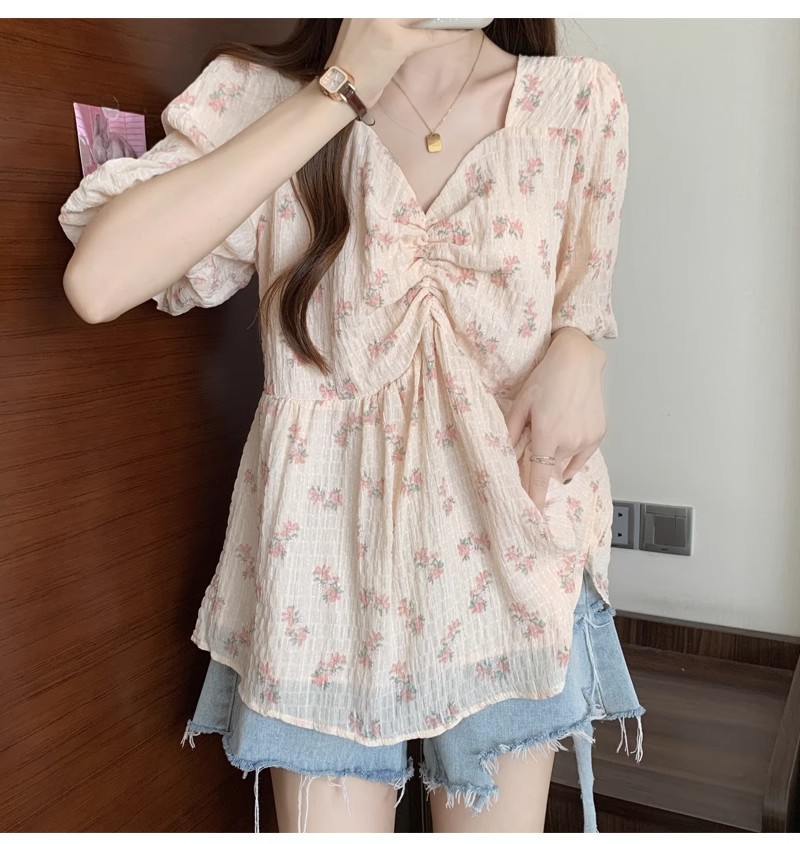 프렌치 유니크 스퀘어 넥 플로럴 쉬폰 반팔 셔츠 팻 커버 벨리 탑스토어 가기