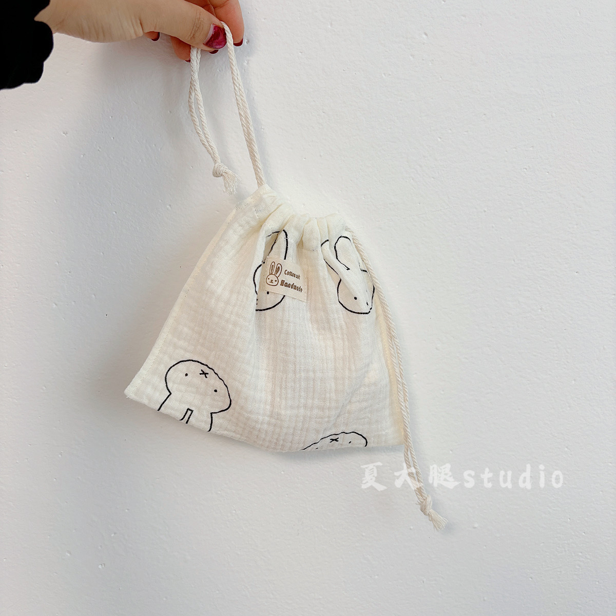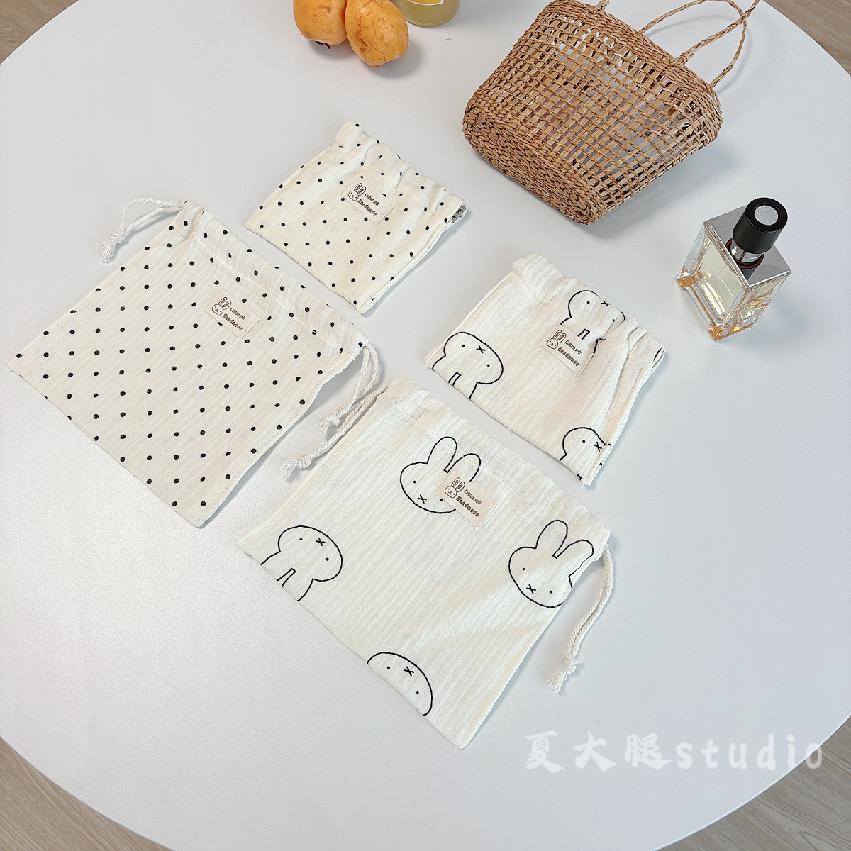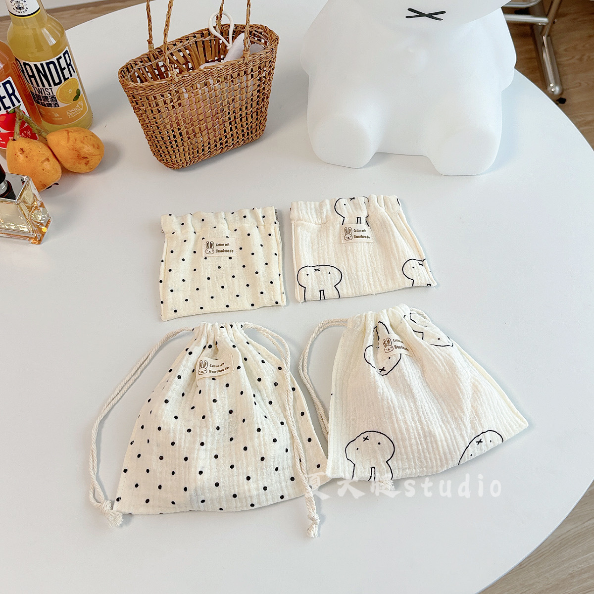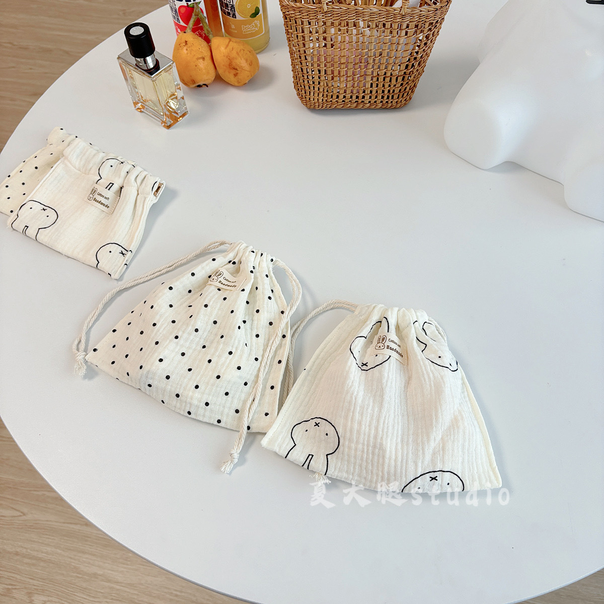 순수 코튼 거즈 밀크 화이트 폴카 도트 미피 토끼 보관 가방 졸라 매는 끈 가방 여행 화장품 번들 포켓 코튼 가방