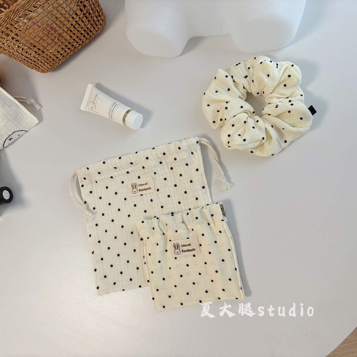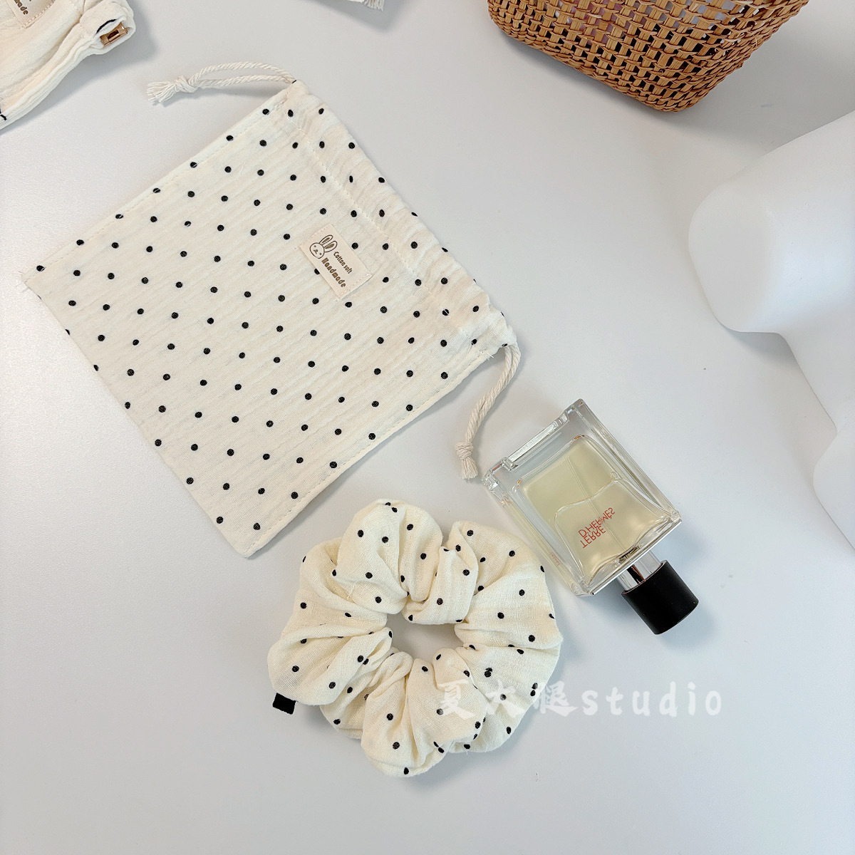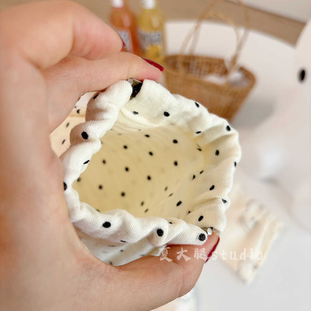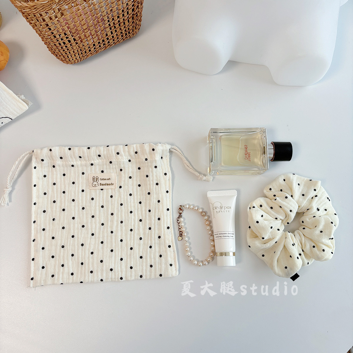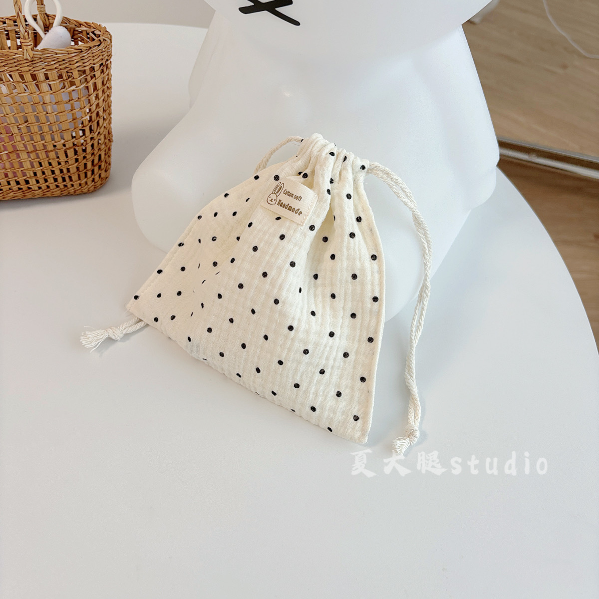 • 면 거즈 유백색 배경에 검은 점이 있는 금색 가방 [약 12cm]