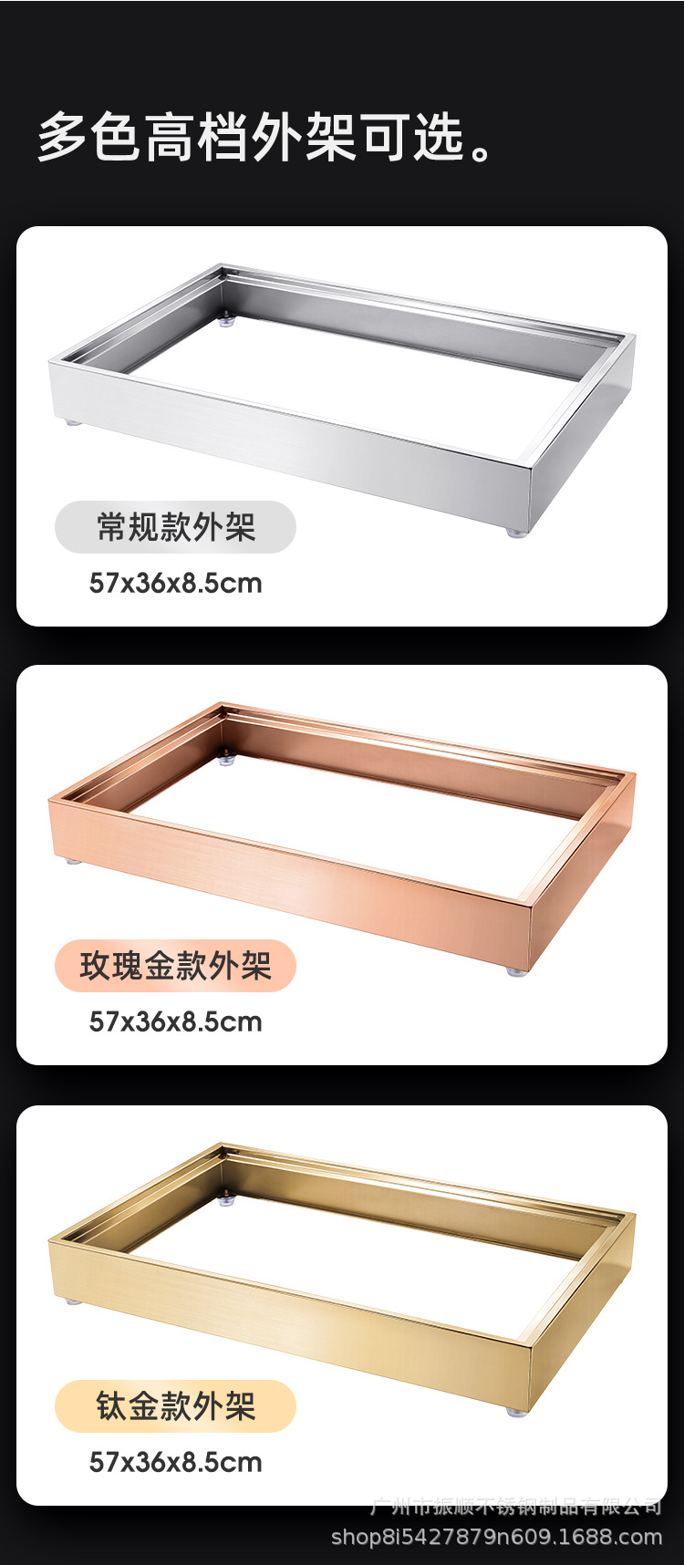 • 스테인레스 스틸 로즈 골드 외부 프레임 + 바닥 세면대 높이 6.5cm + 단일 칸막이 내부 세면대 고정 세면대 높이 4cm + 이중 플립 커버(얼음판 3개 포함)