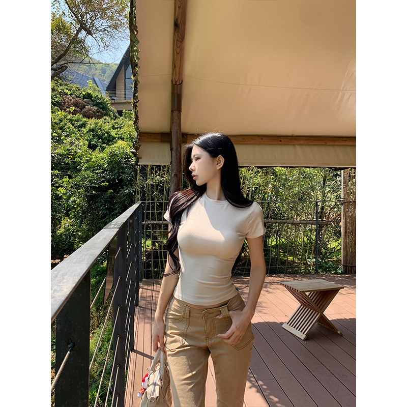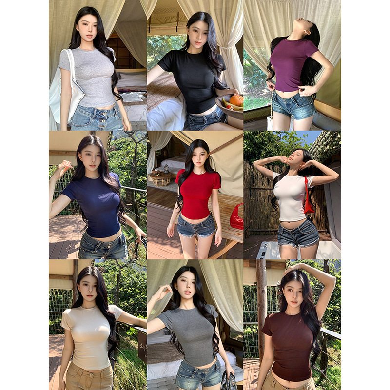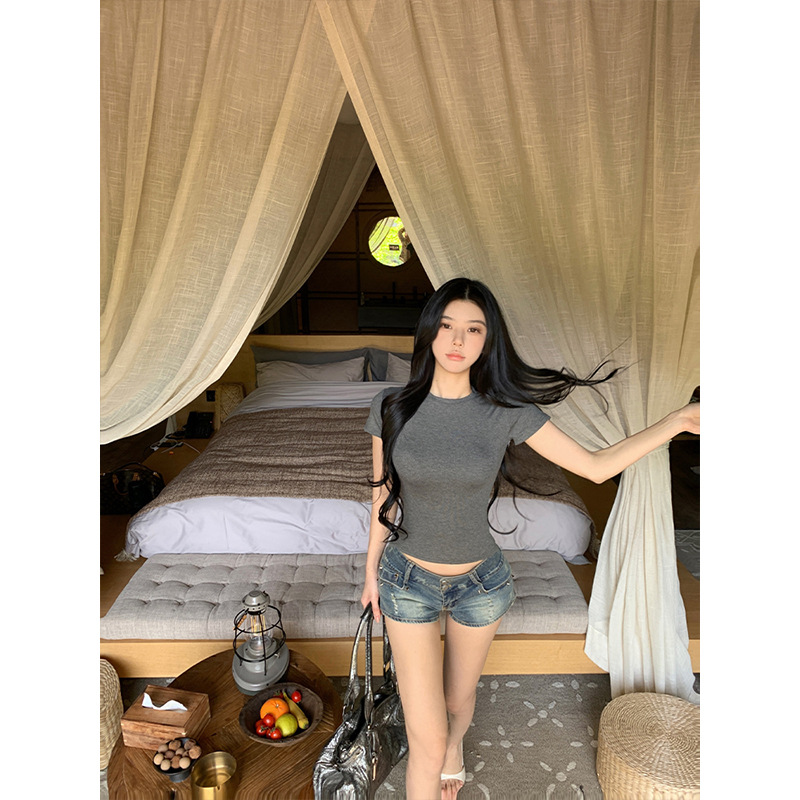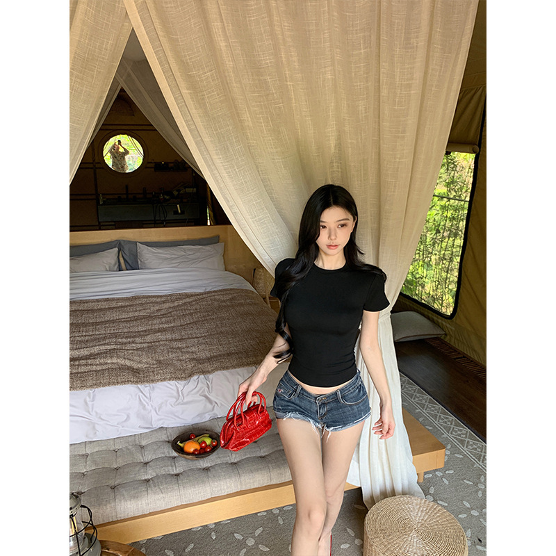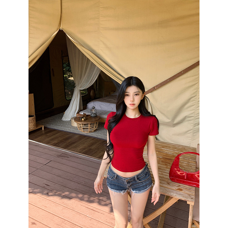 Moses Moxi niche 오른쪽 어깨 반팔 티셔츠 여성 여름 작은 꽉 끼는 뜨거운 소녀 짧은 복고풍 레드 탑스토어 가기