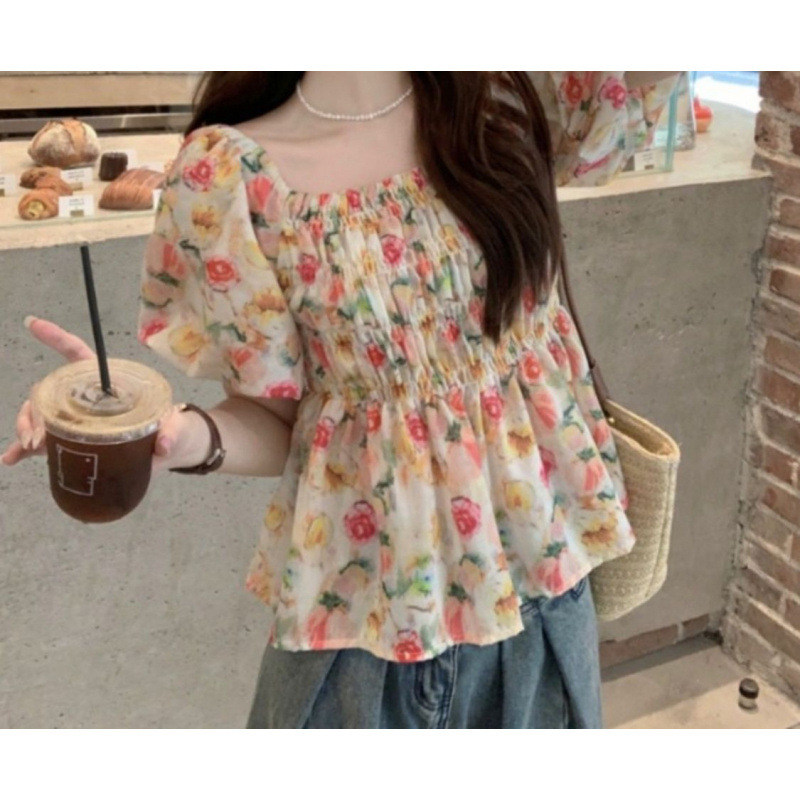 여성을위한 프렌치 스퀘어 넥 꽃 퍼프 슬리브 쉬폰 셔츠 여름 2025 새로운 달콤한 복고풍 허리 슬리밍 탑