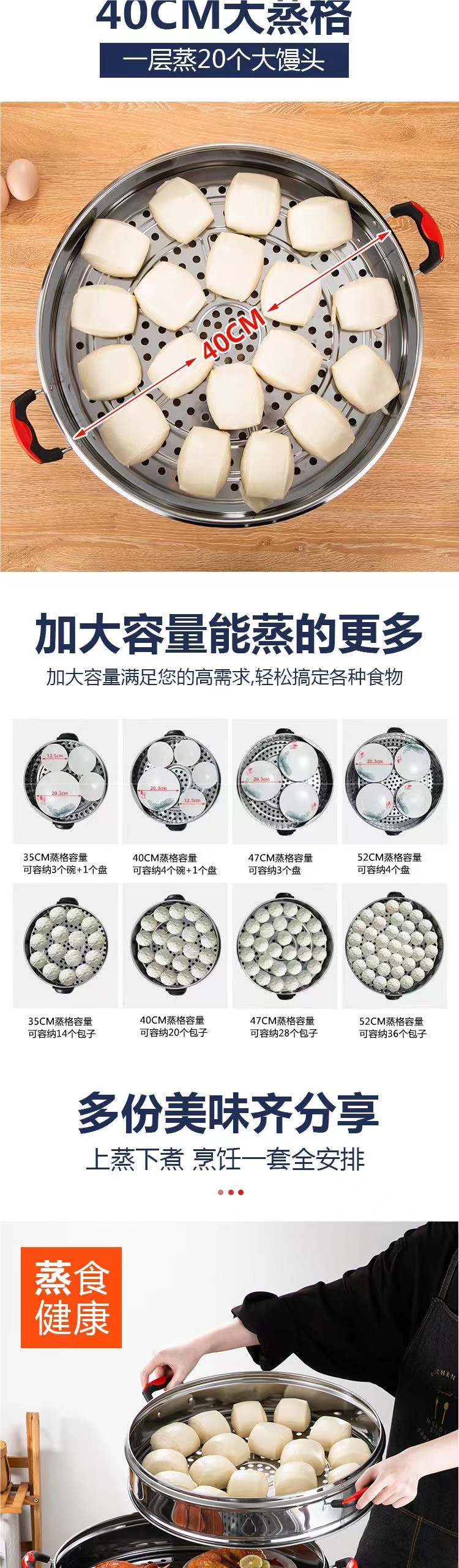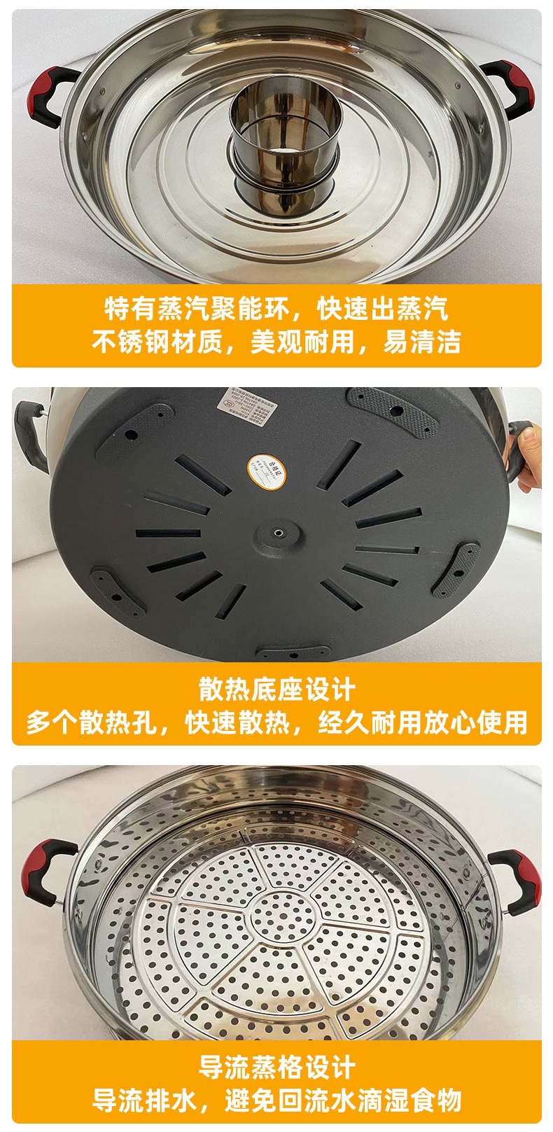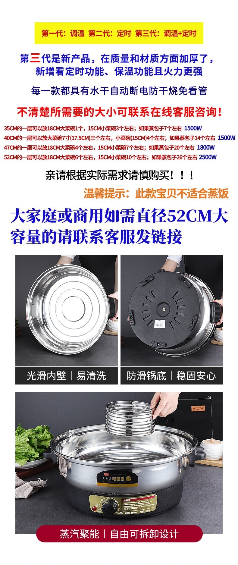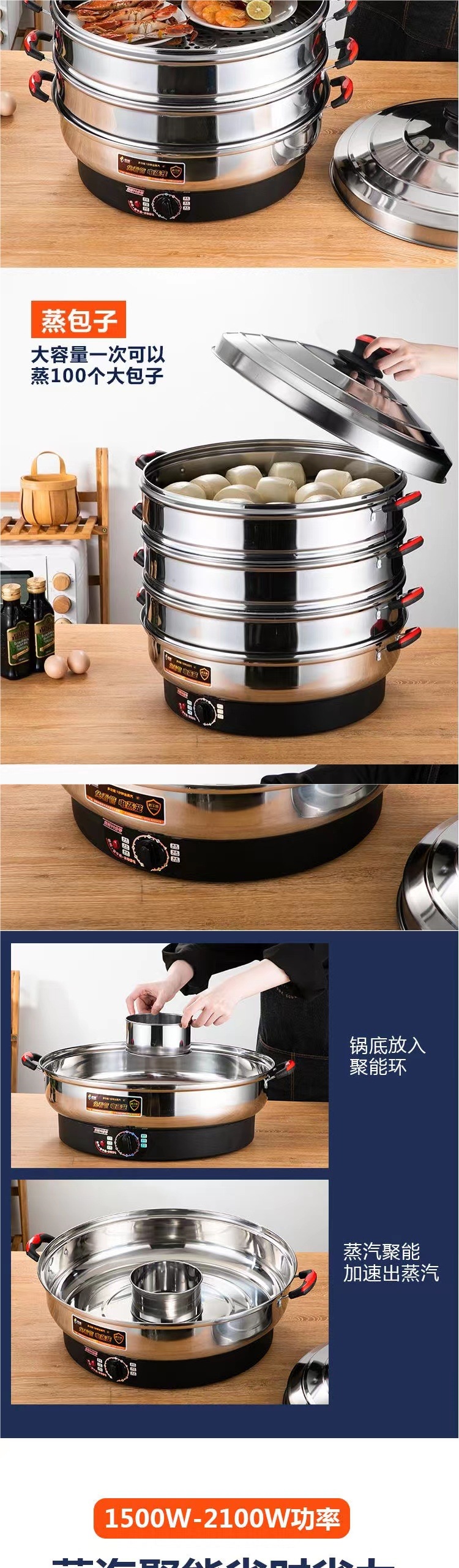 초대형 전기찜기, 상업용 플러그인 찜기, 보온 스테인리스 자동 전원 차단 52cm 전기 찜기, 3단 찐빵