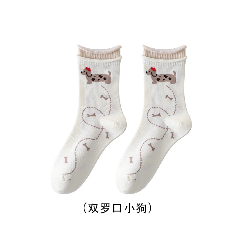 DUDU SNOW 봄과 가을 새로운 도착 닥스훈트 강아지의 하루 사계절 면 양말 만화 패턴 귀여운 중간 튜브 양말스토어 가기