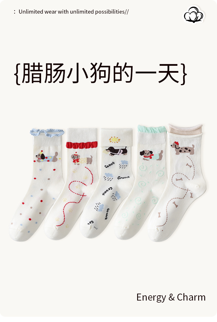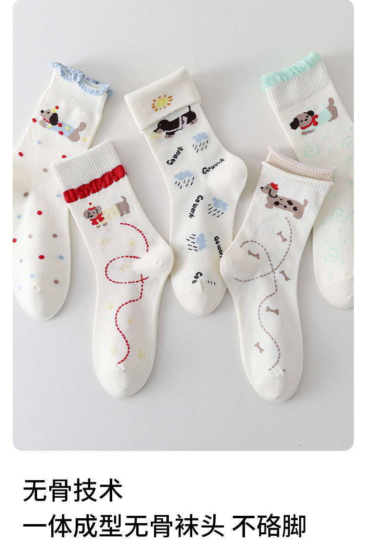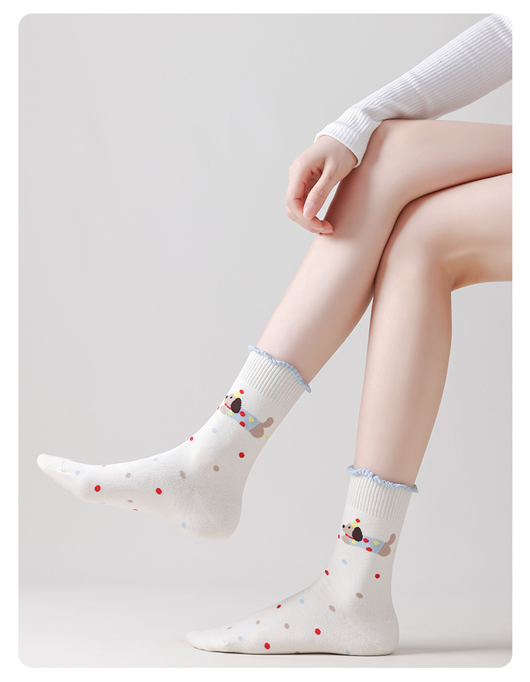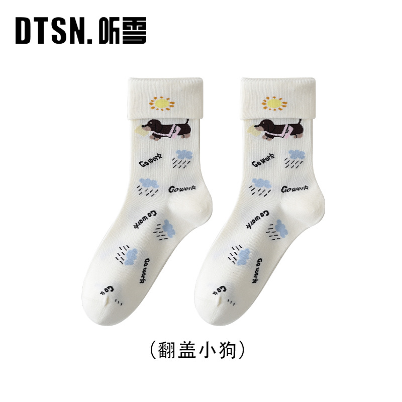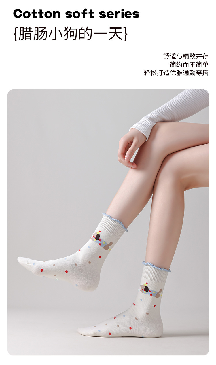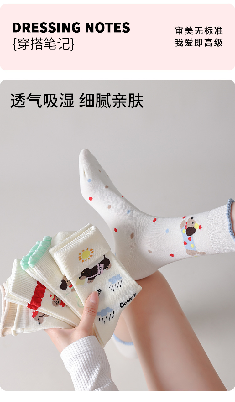 DUDU SNOW 봄과 가을 새로운 도착 닥스훈트 강아지의 하루 사계절 면 양말 만화 패턴 귀여운 중간 튜브 양말