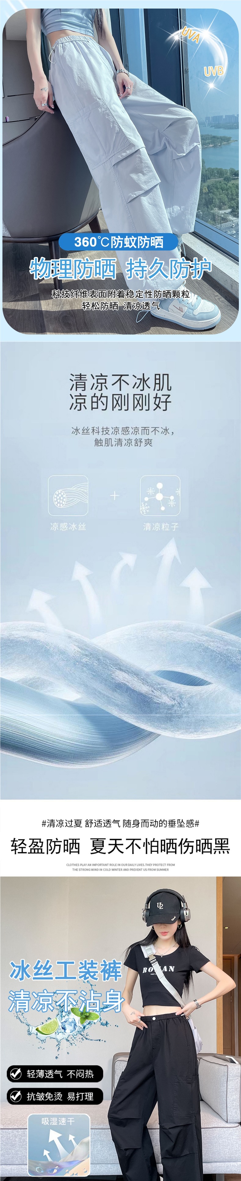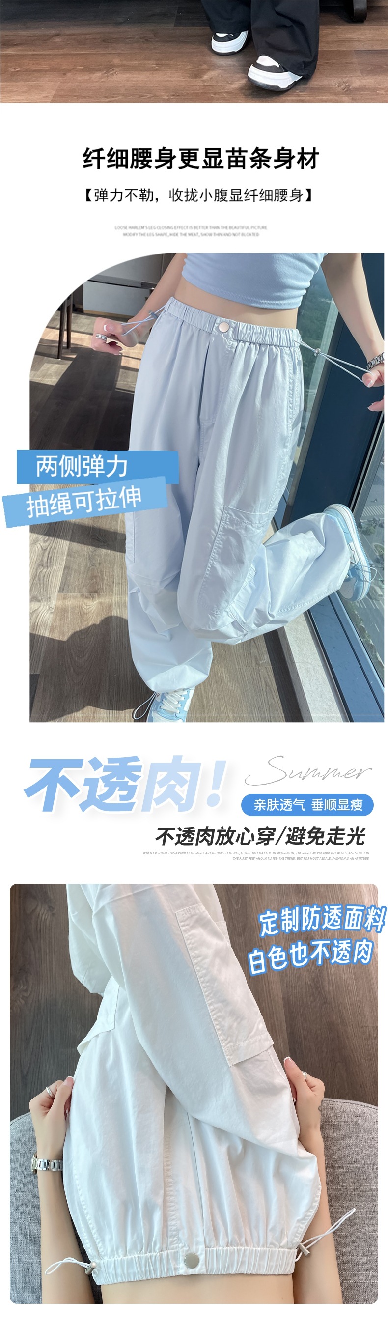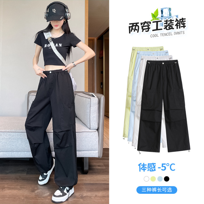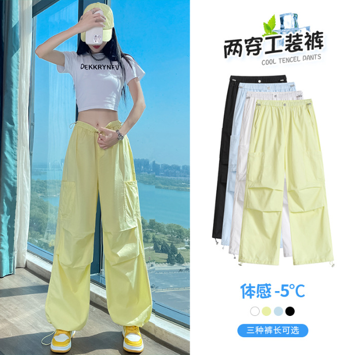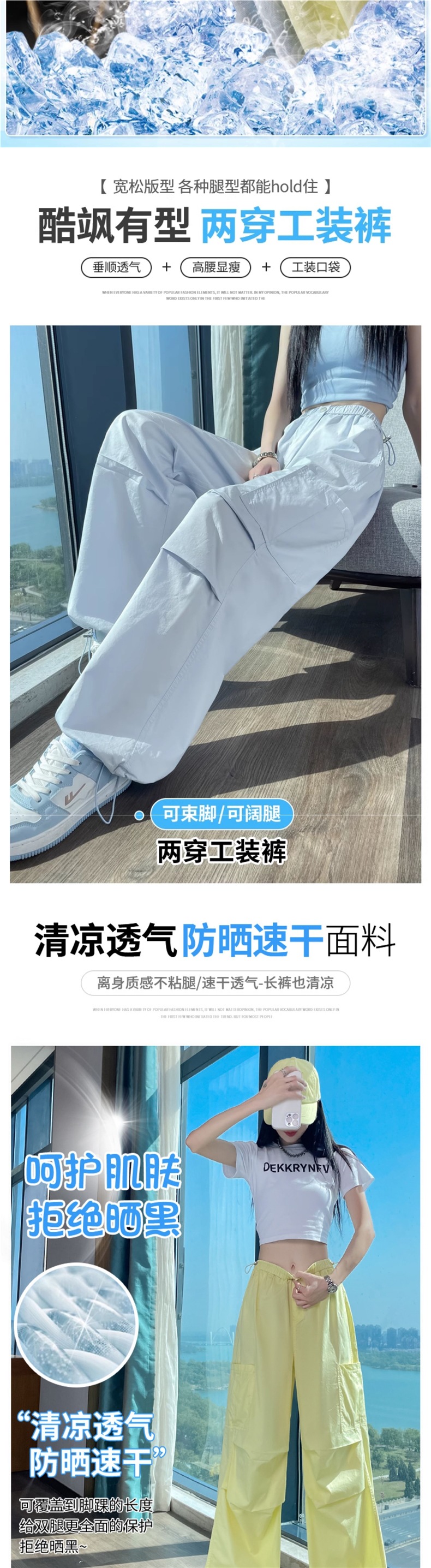 여성용 크로스보더 블루 속건성 작업복 여름 얇은 도파민 하이킹 바지 아이스 실크 스포츠 낙하산 바지 자외선 차단 바지스토어 가기