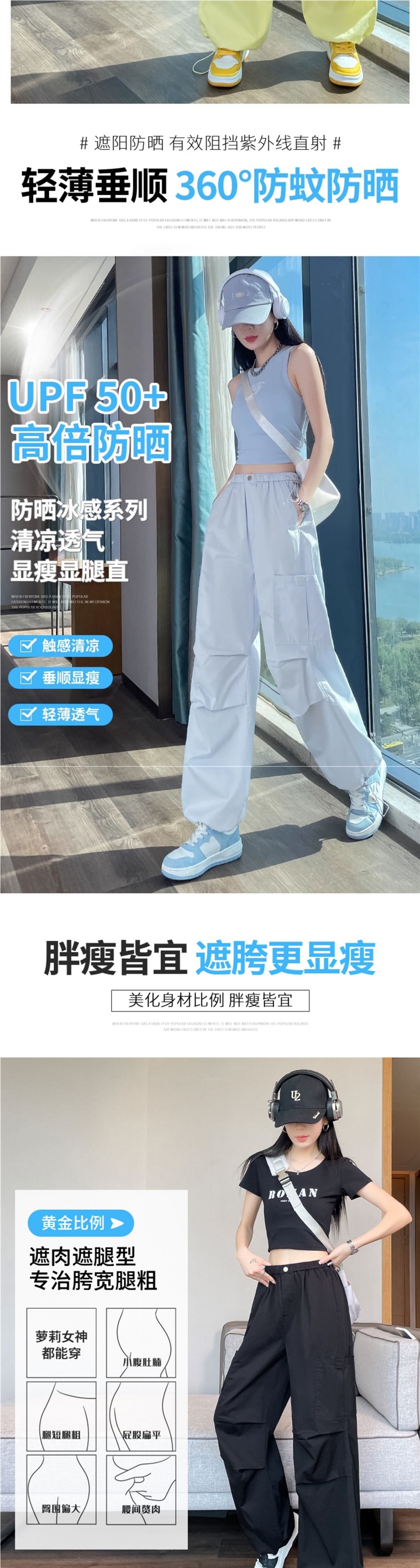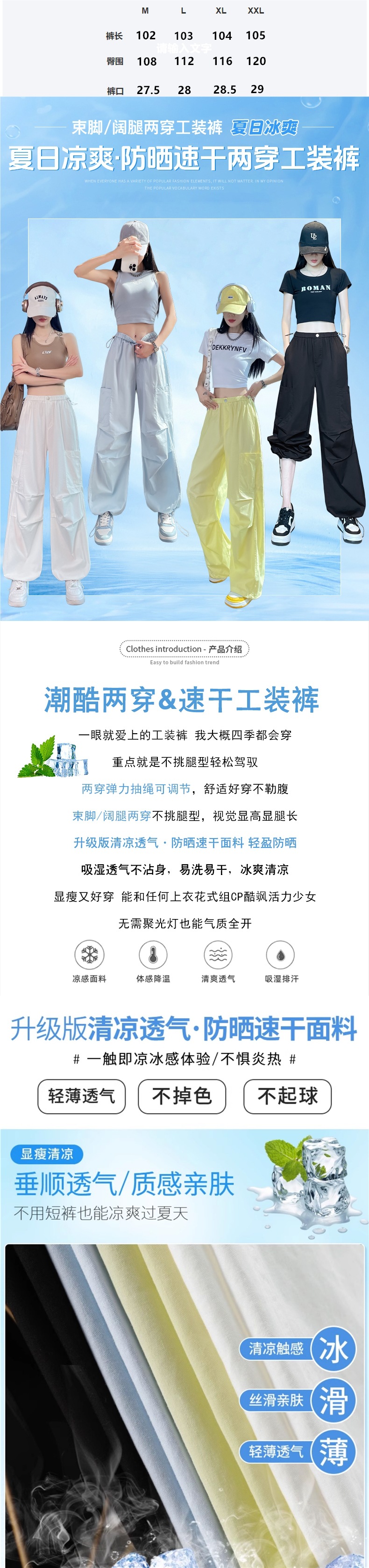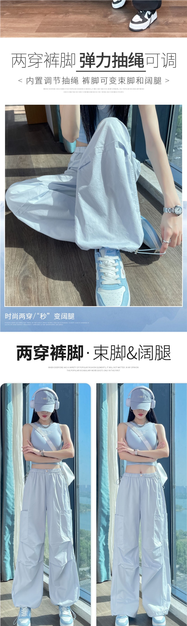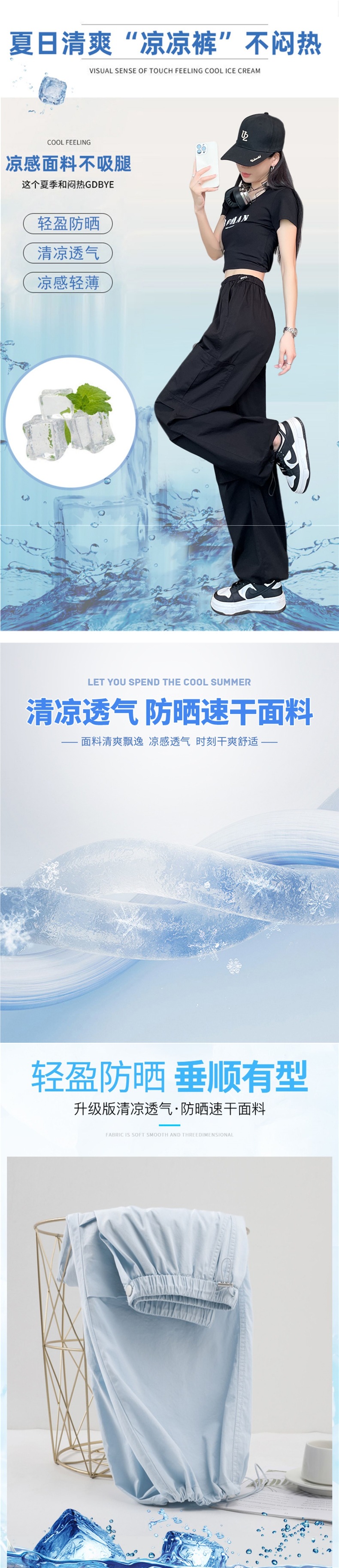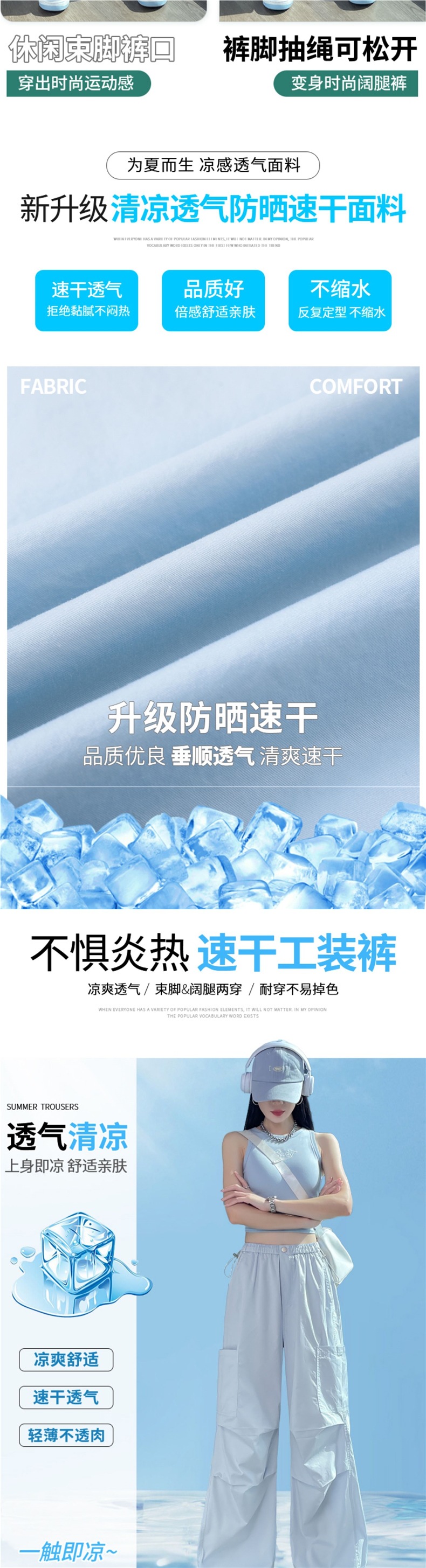 여성용 크로스보더 블루 속건성 작업복 여름 얇은 도파민 하이킹 바지 아이스 실크 스포츠 낙하산 바지 자외선 차단 바지스토어 가기
