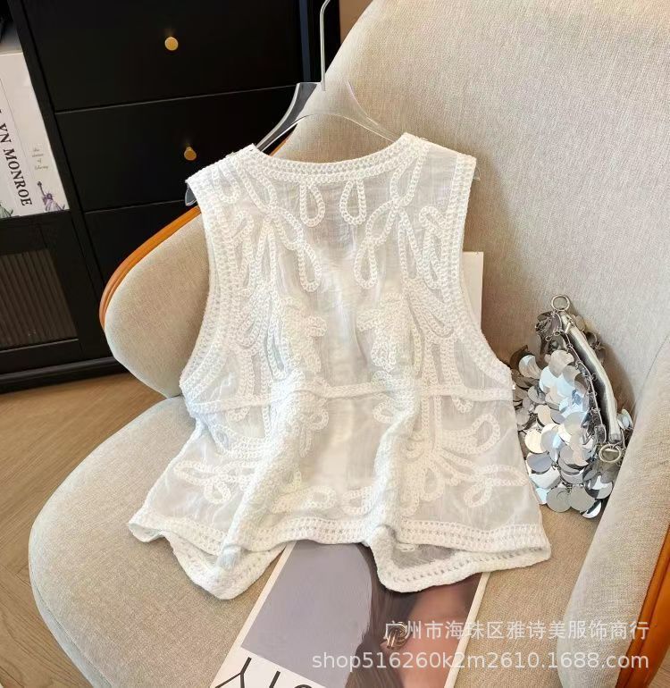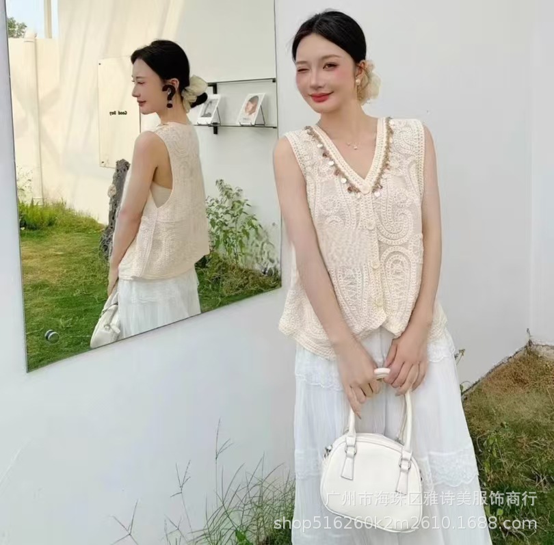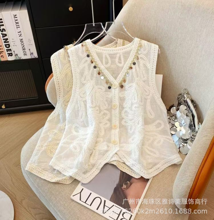 여름 프렌치 크로셰 브이넥 태슬 조끼 여성용 새로운 디자인 기질 아우터 가디건 민소매 탑스토어 가기