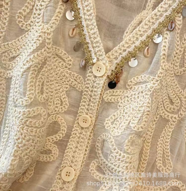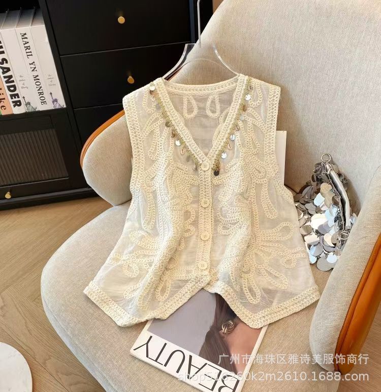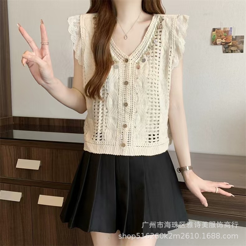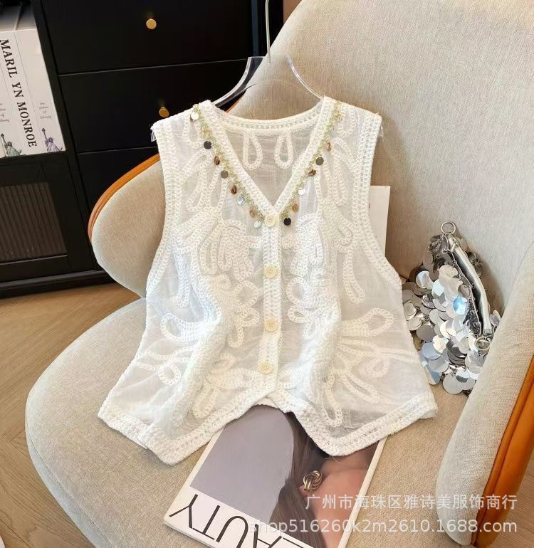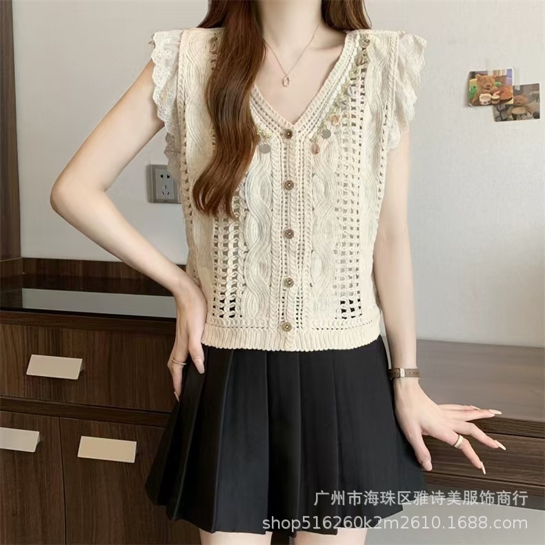 여름 프렌치 크로셰 브이넥 태슬 조끼 여성용 새로운 디자인 기질 아우터 가디건 민소매 탑