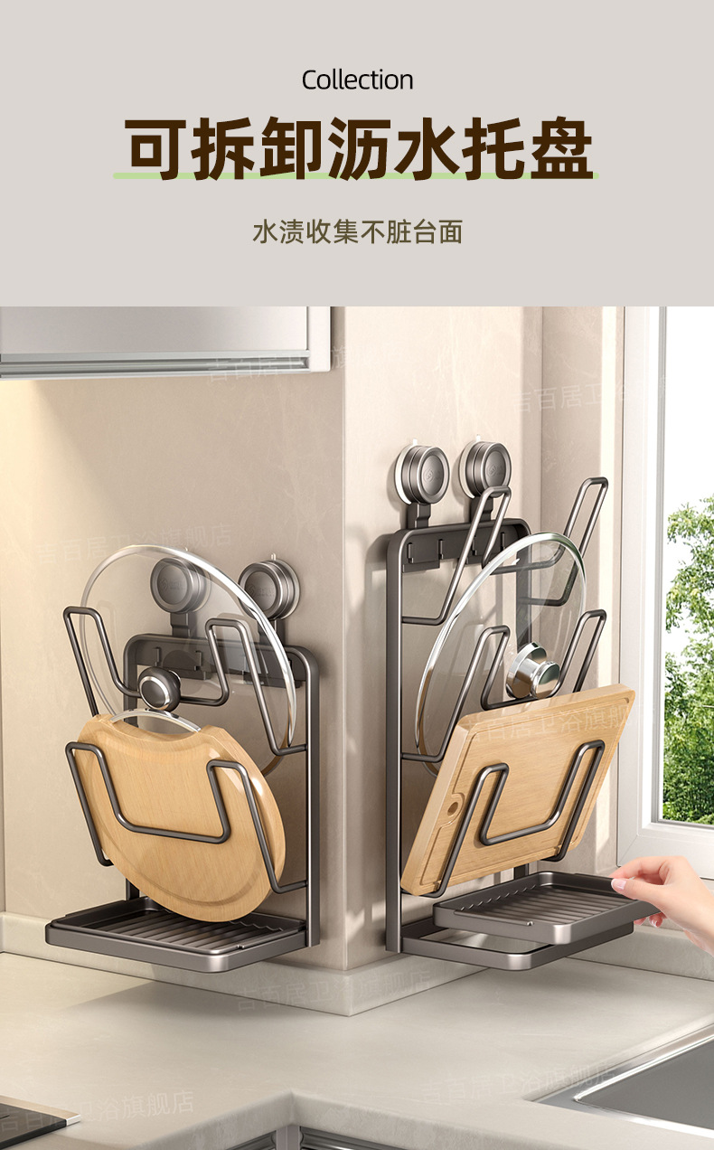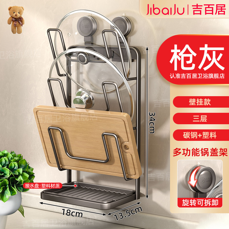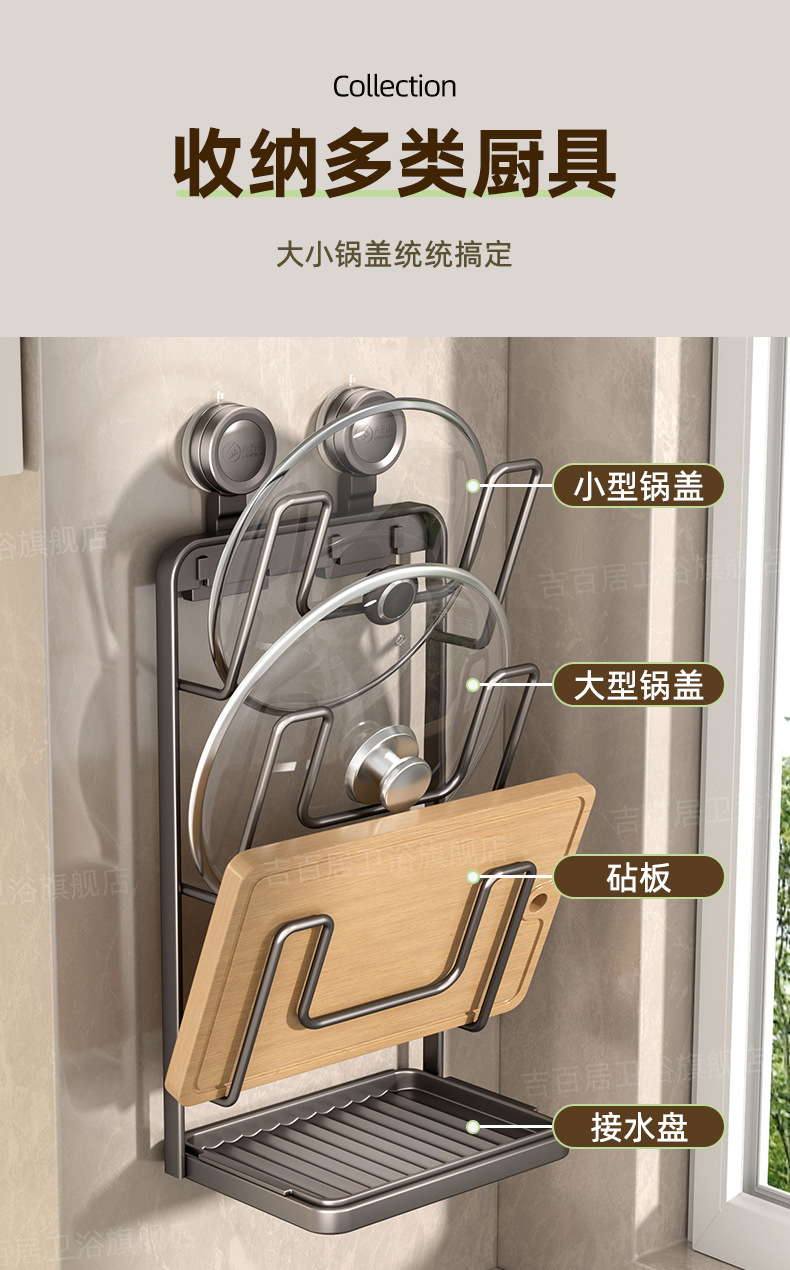 • 강력한 흡착판 - 반복 사용 가능 - 벽에 손상 없음 - 3단 냄비 뚜껑 홀더 - 건 그레이