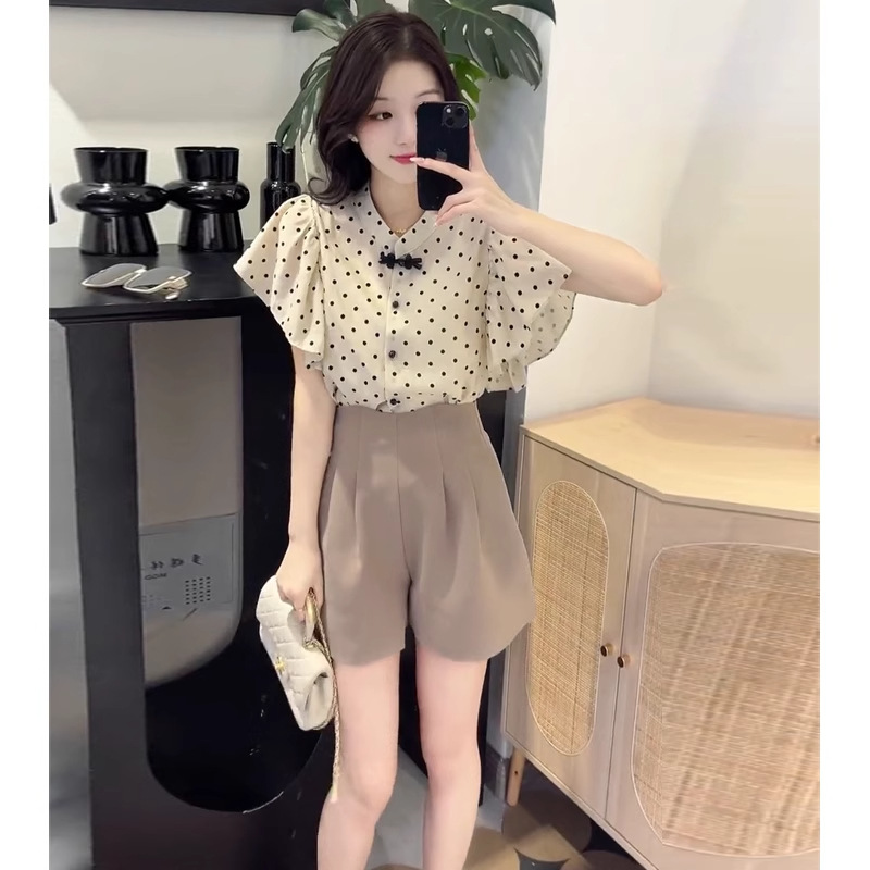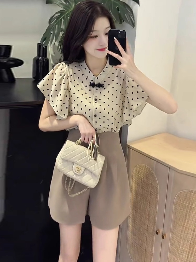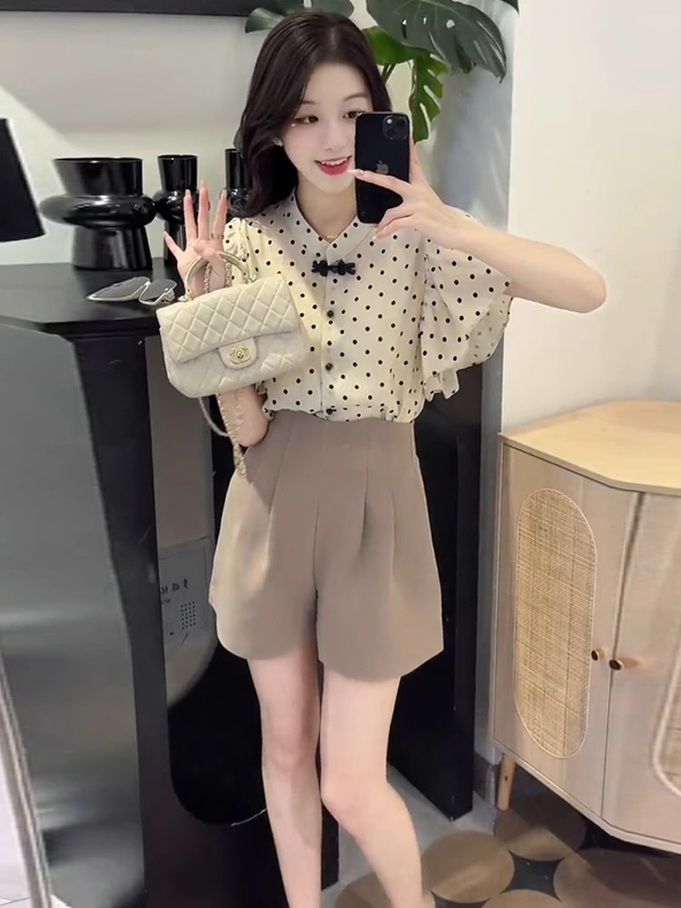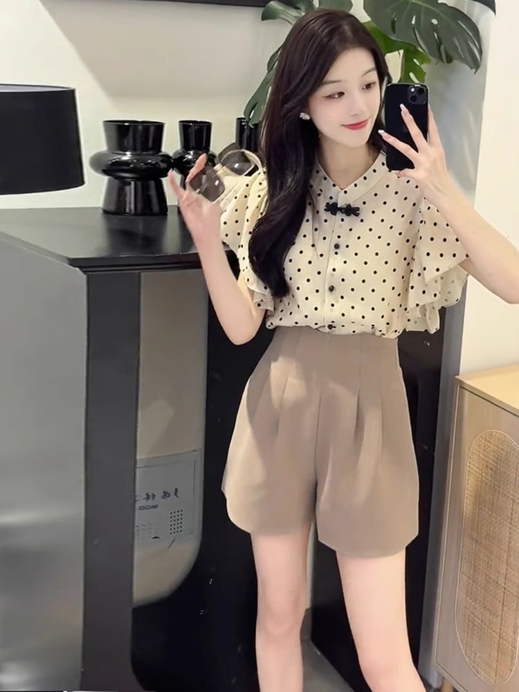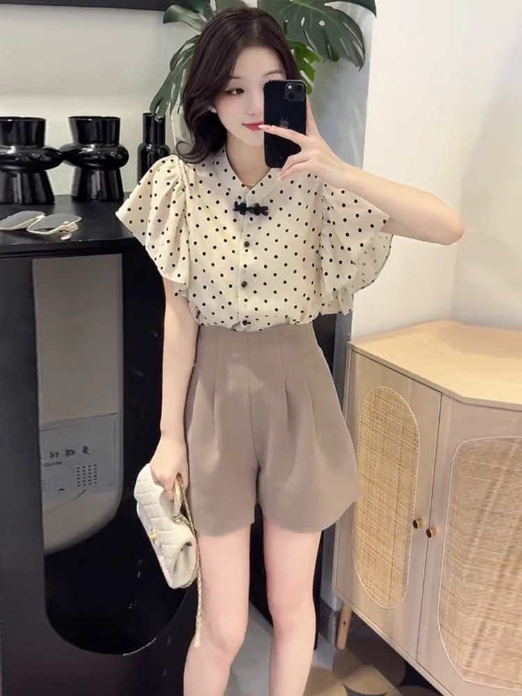 여성 여름 신상 프렌치 스타일 쉬폰 셔츠, 정장 반바지 투피스 세트로 구성된 작은 차 스타일 의상스토어 가기