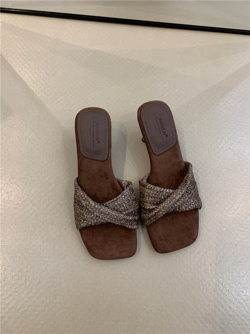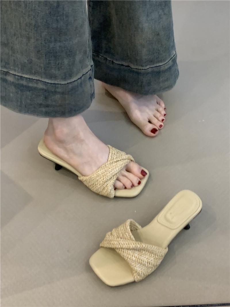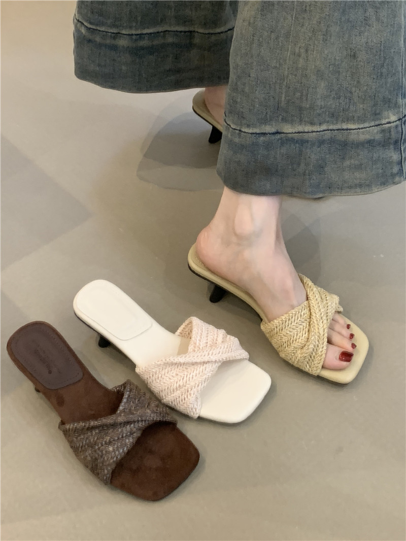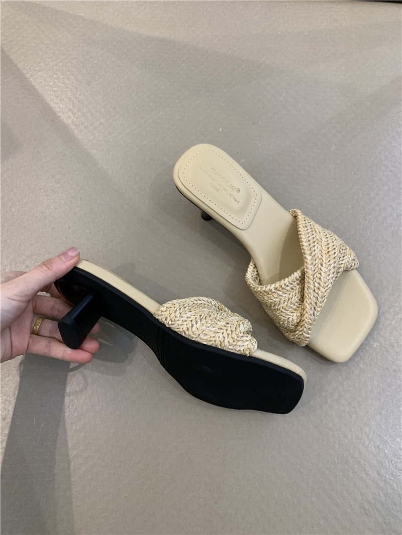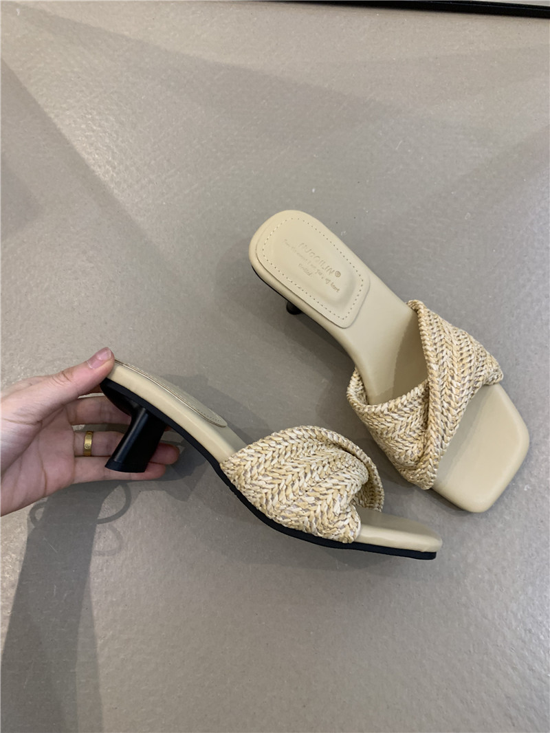여성을 위한 디자인 밀짚 직조 원 스트랩 샌들 2025 여름 트위스트 스퀘어 토 두꺼운 굽 하이힐 샌들