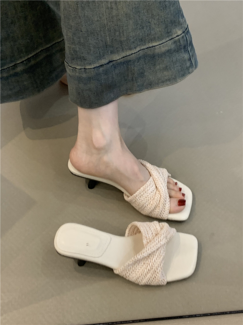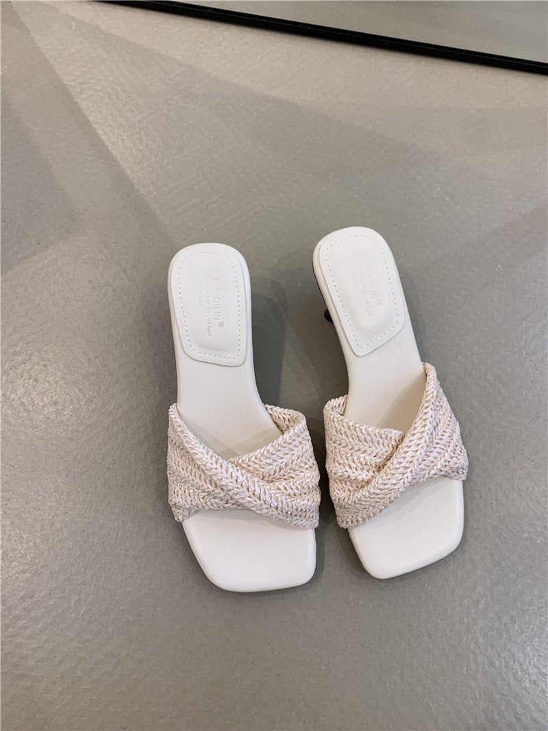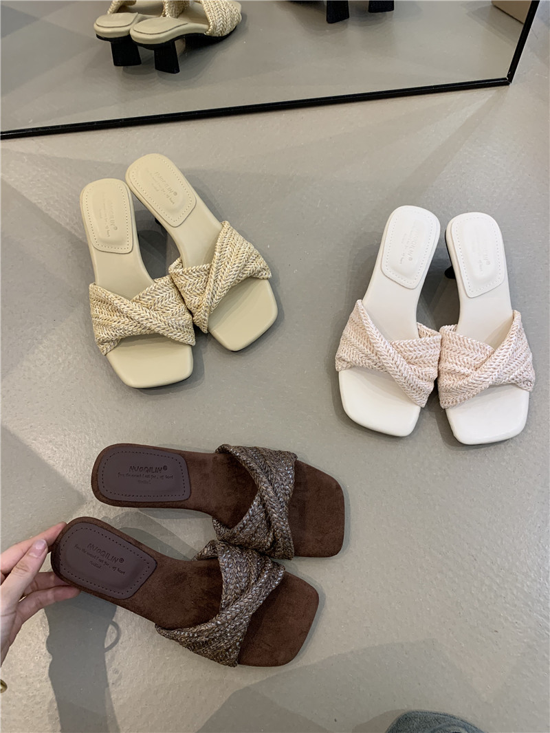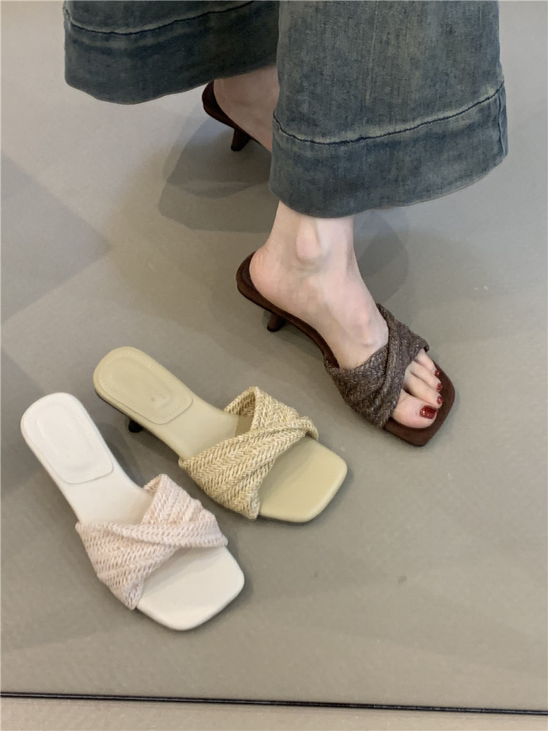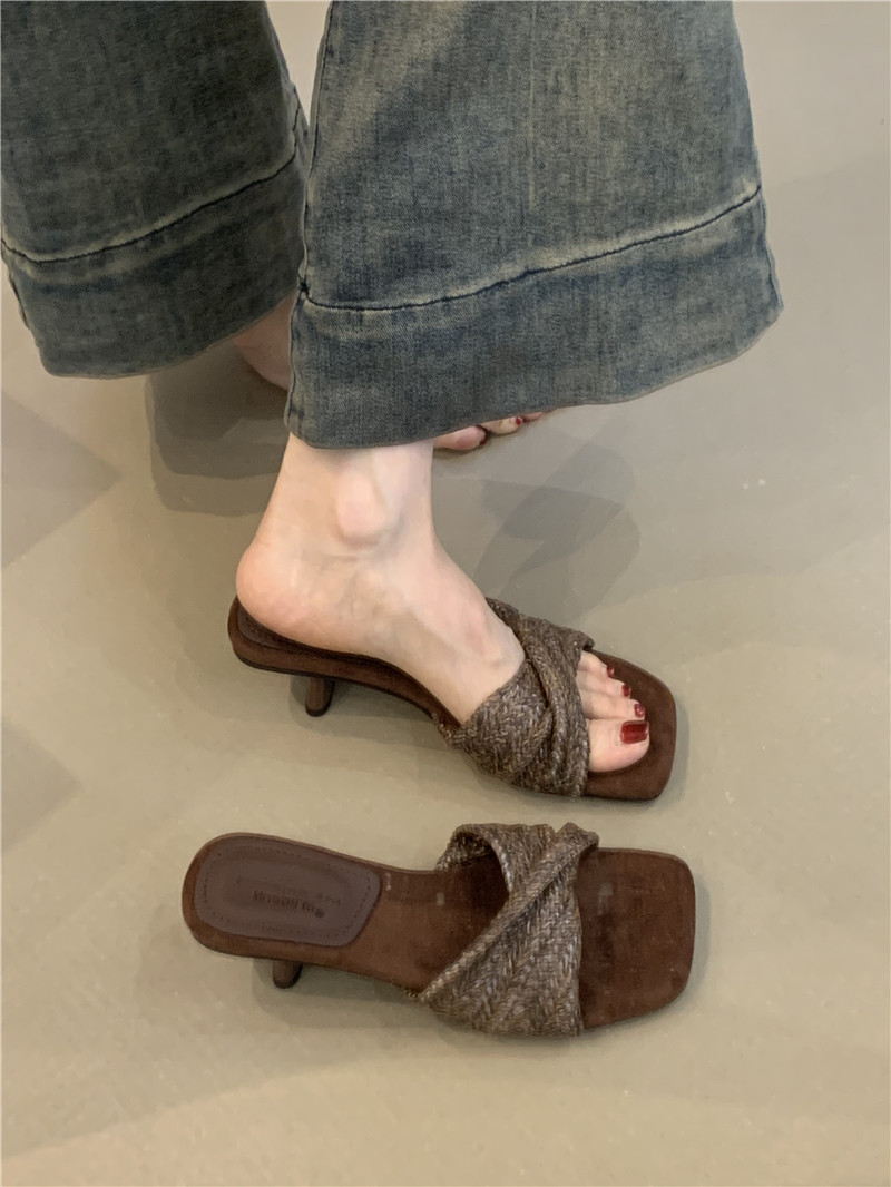 여성을 위한 디자인 밀짚 직조 원 스트랩 샌들 2025 여름 트위스트 스퀘어 토 두꺼운 굽 하이힐 샌들